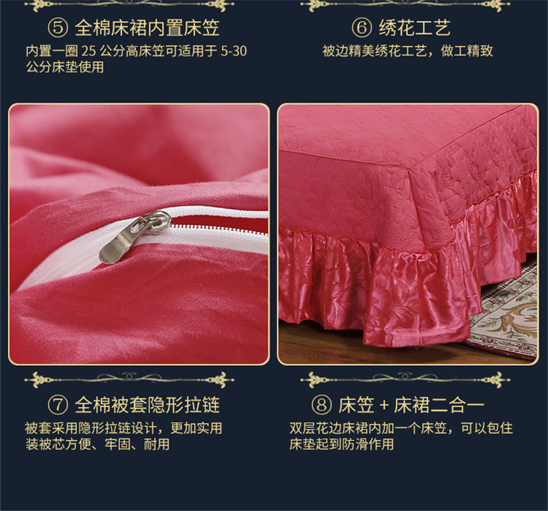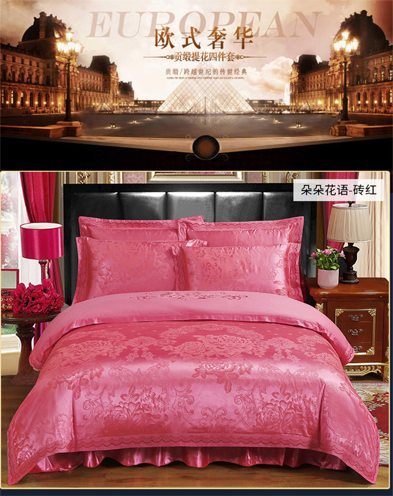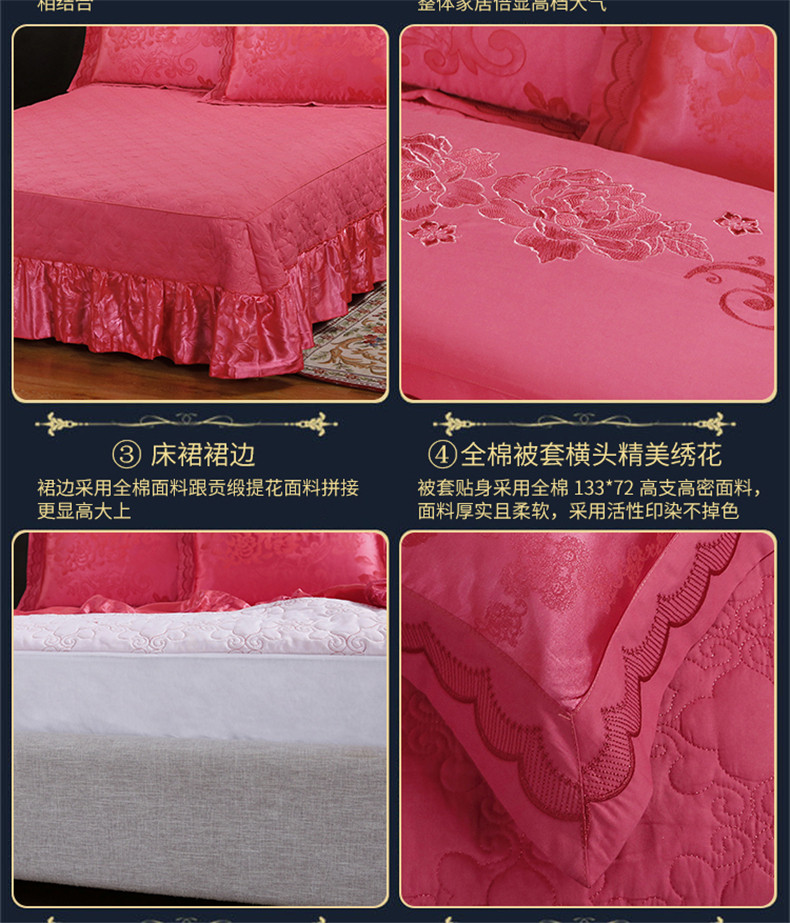 (总) 福丽莱家纺 2019贡缎提花床裙四件套(单层),黛香-豆沙,典范欧风-蓝灰,菲洛嘉,国色佳人,花团锦簇-银灰,花团锦簇-粉玉,玛格丽特-金兰,玫瑰风情-大红,摩卡庄园-紫驼,暖心芳妍-大红,浅芳菲-粉紫,喜上眉梢-砖红,仙境青色