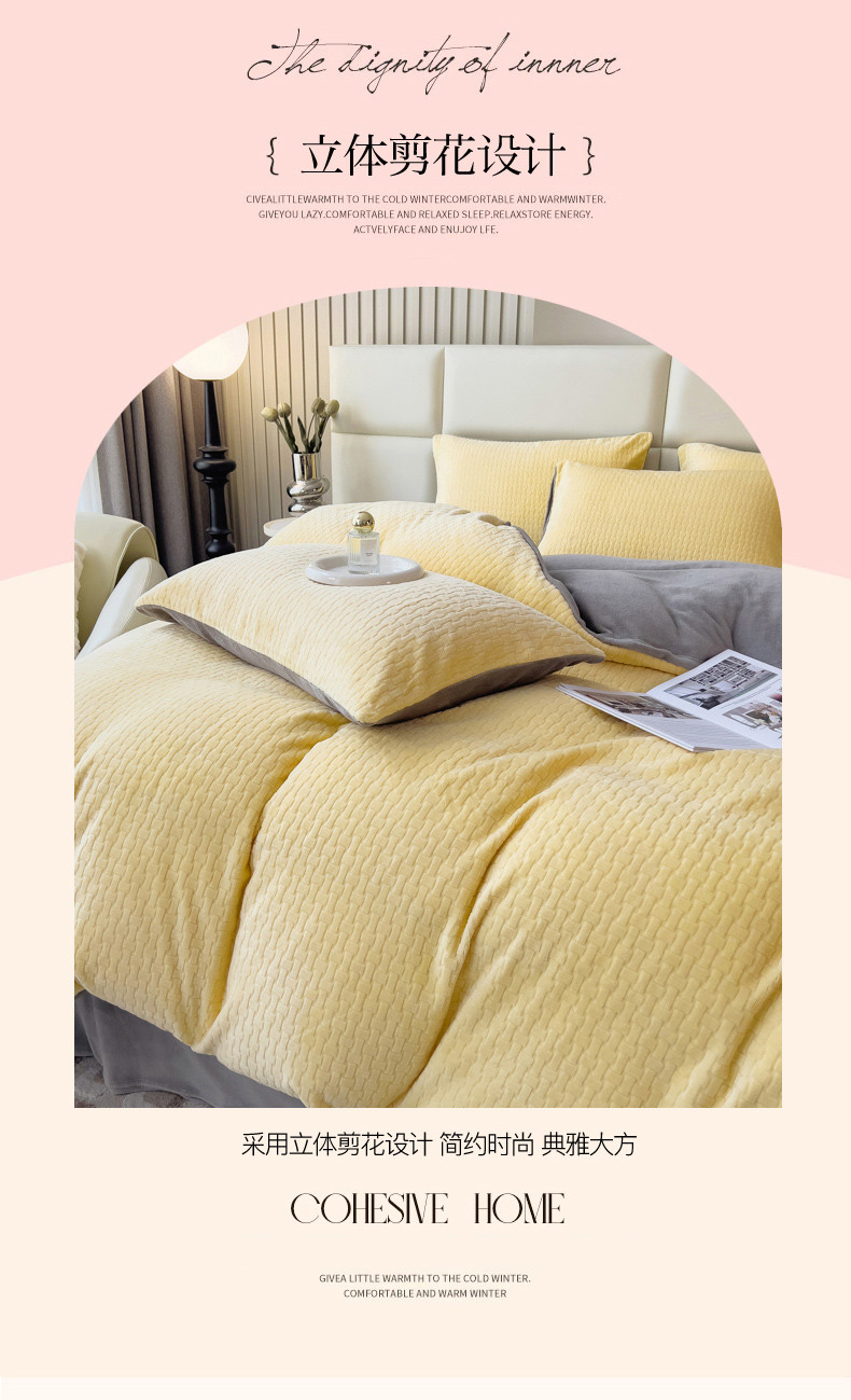 印季 2024新款立体剪花牛奶绒保暖四件套-十字结 亮黄-灰