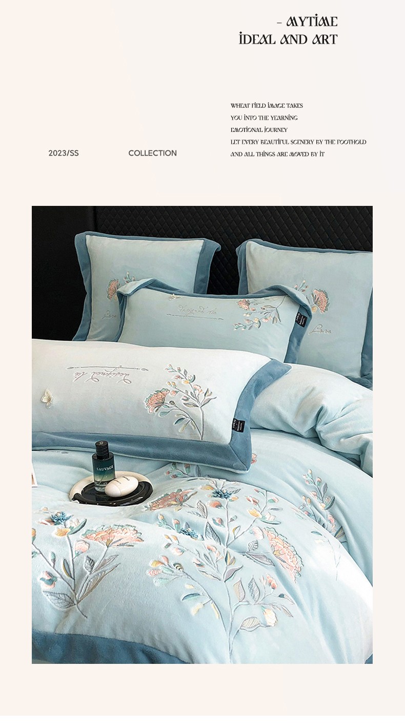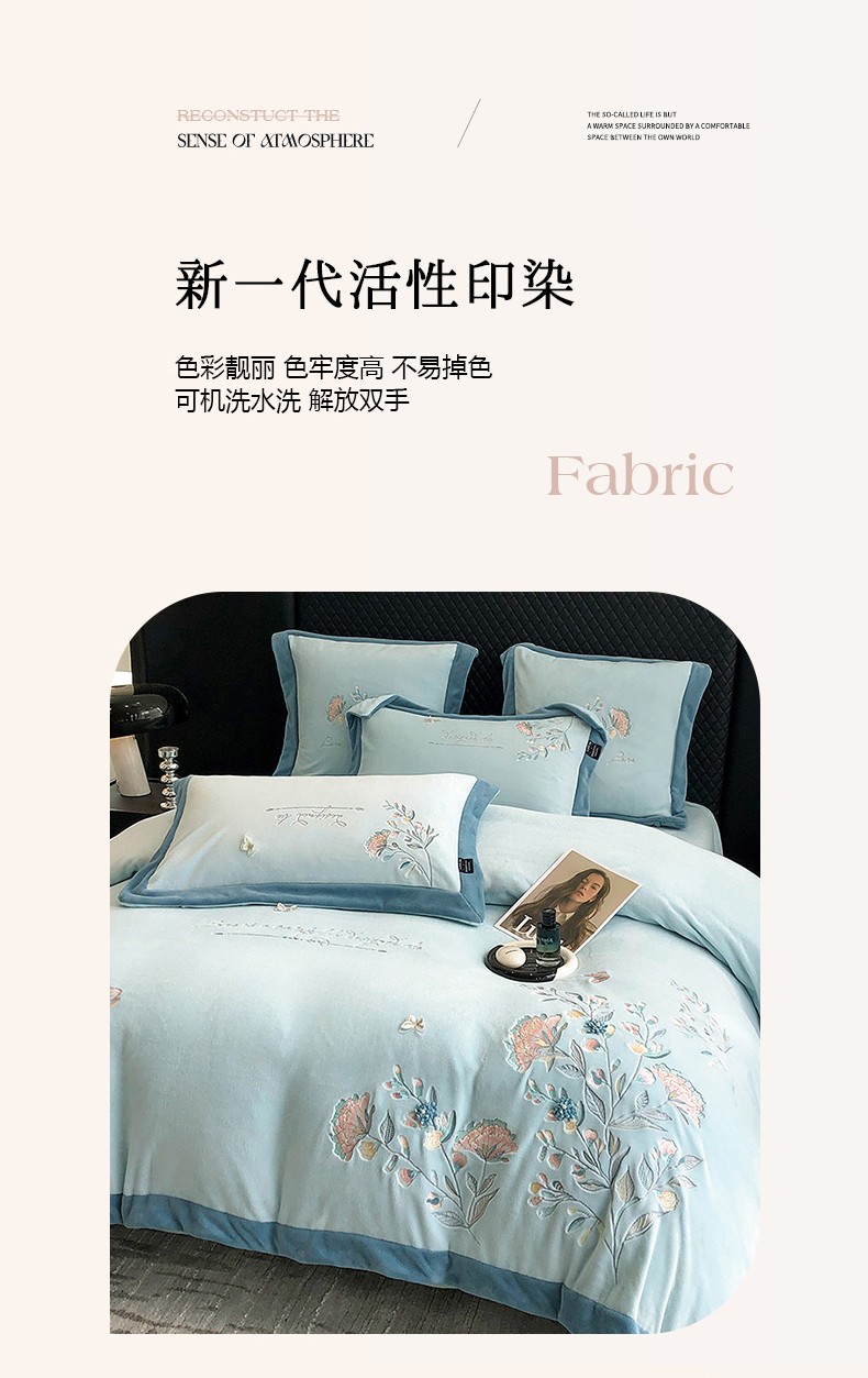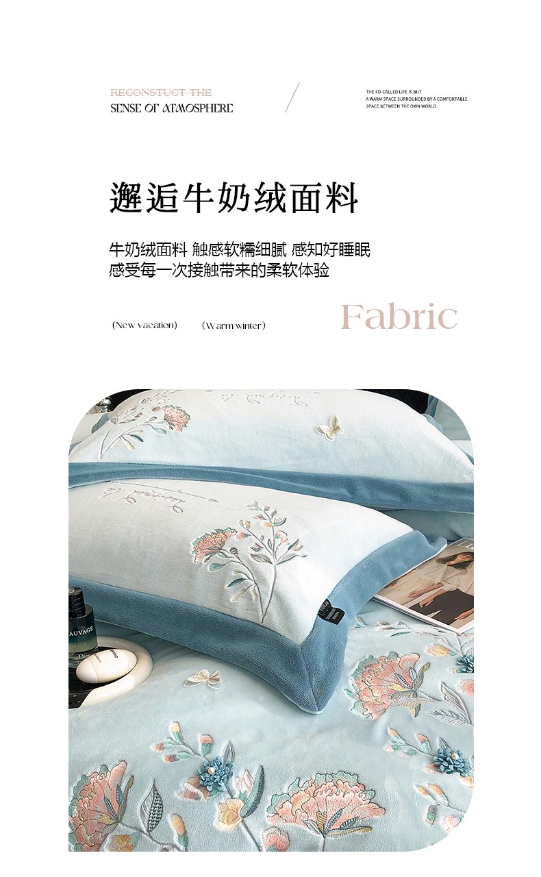 (总)品家居 2025新款5D雕花牛奶绒绣花大拼角四件套-岁月静好,粉色,蓝色,秋黄