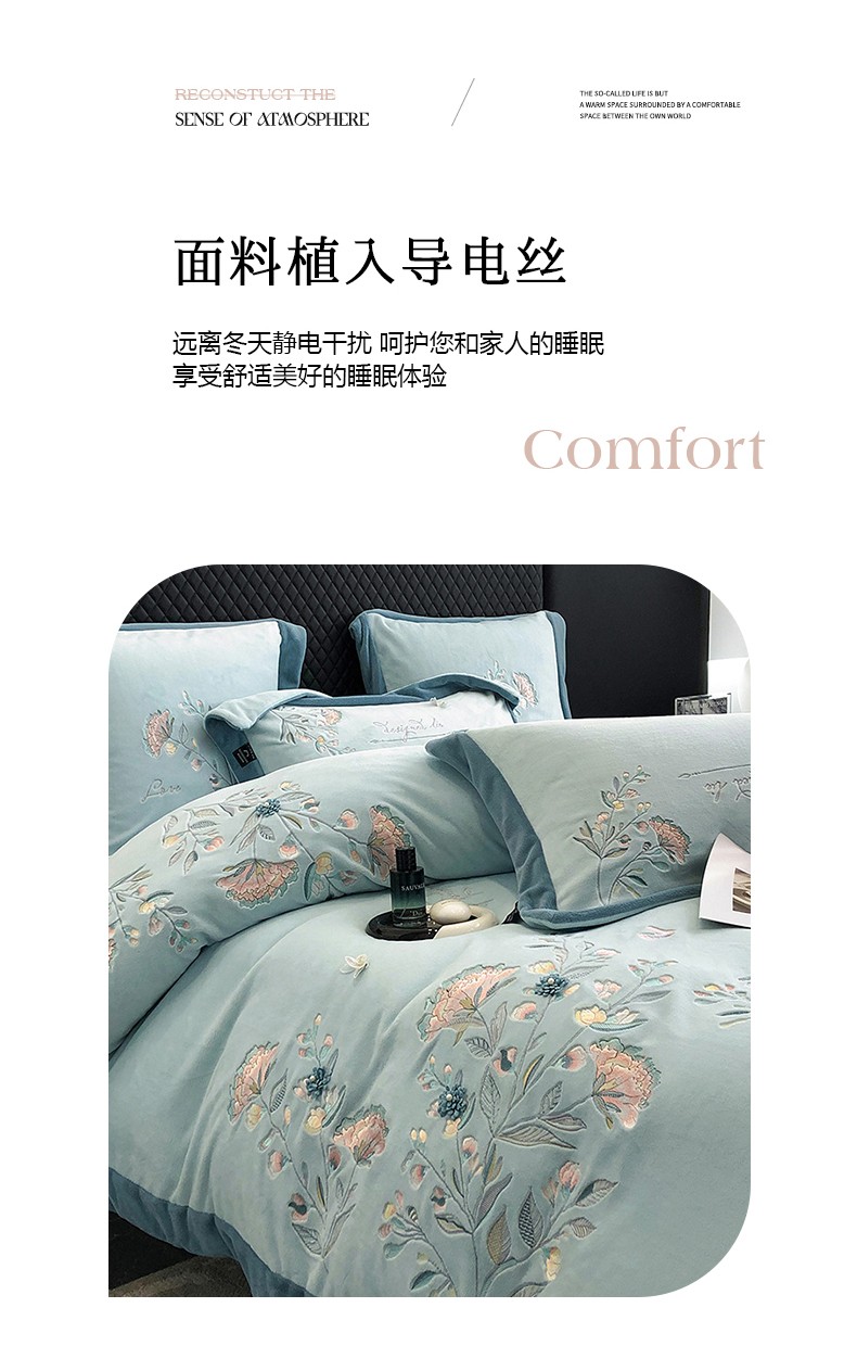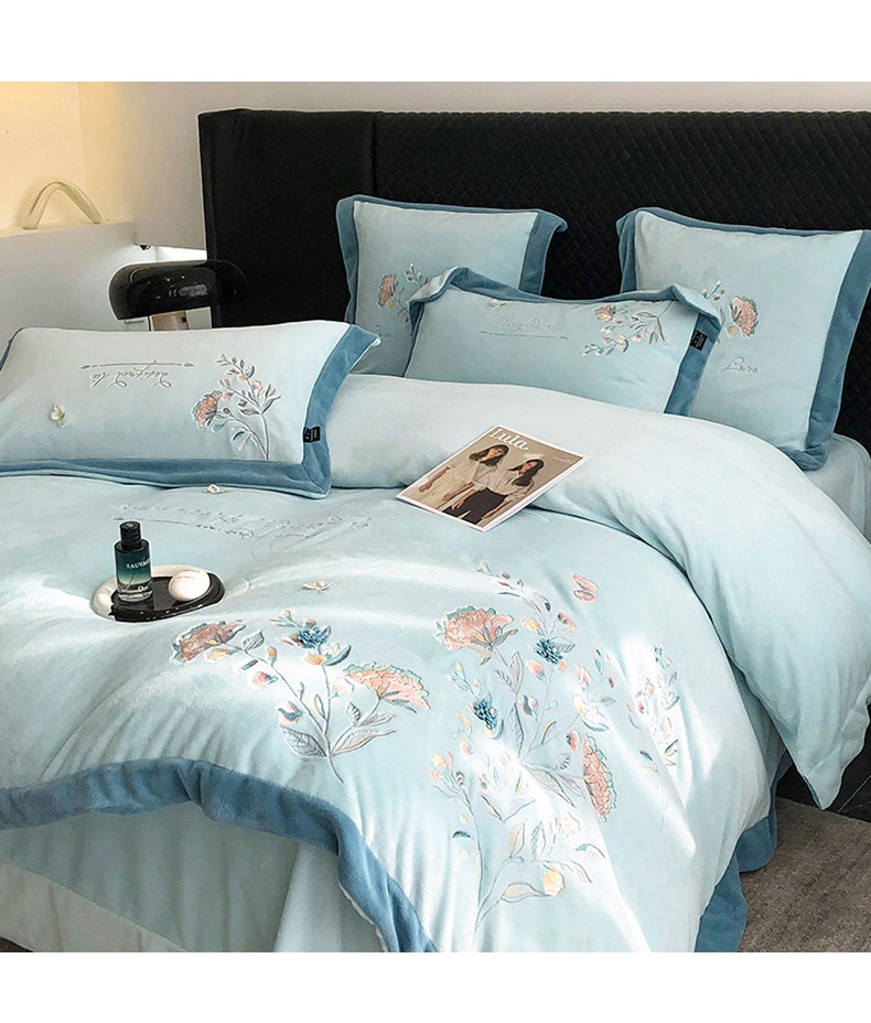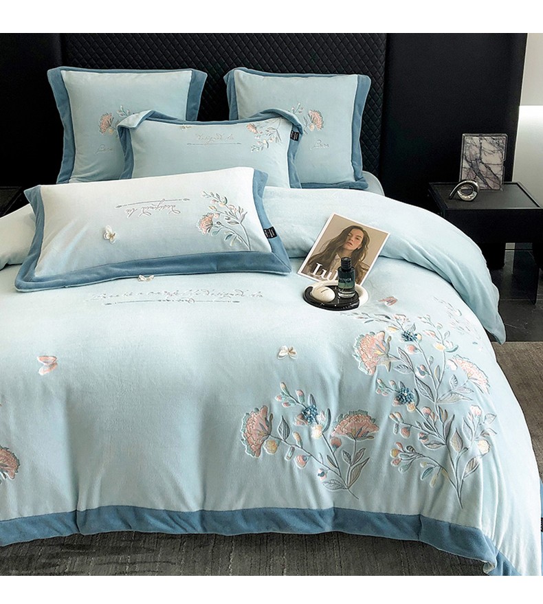商品名称:品家居 2025新款牛奶绒绣花四件套-蝶舞恋花 蓝色