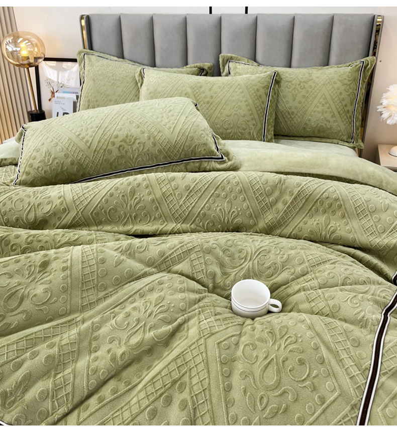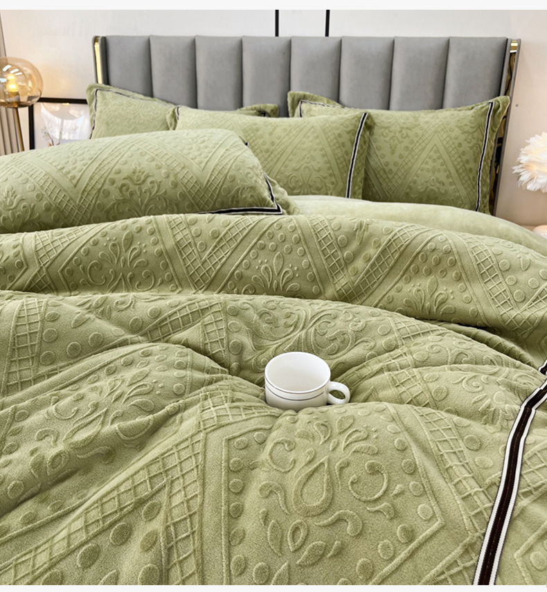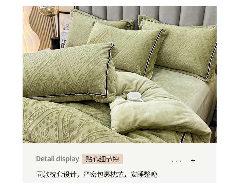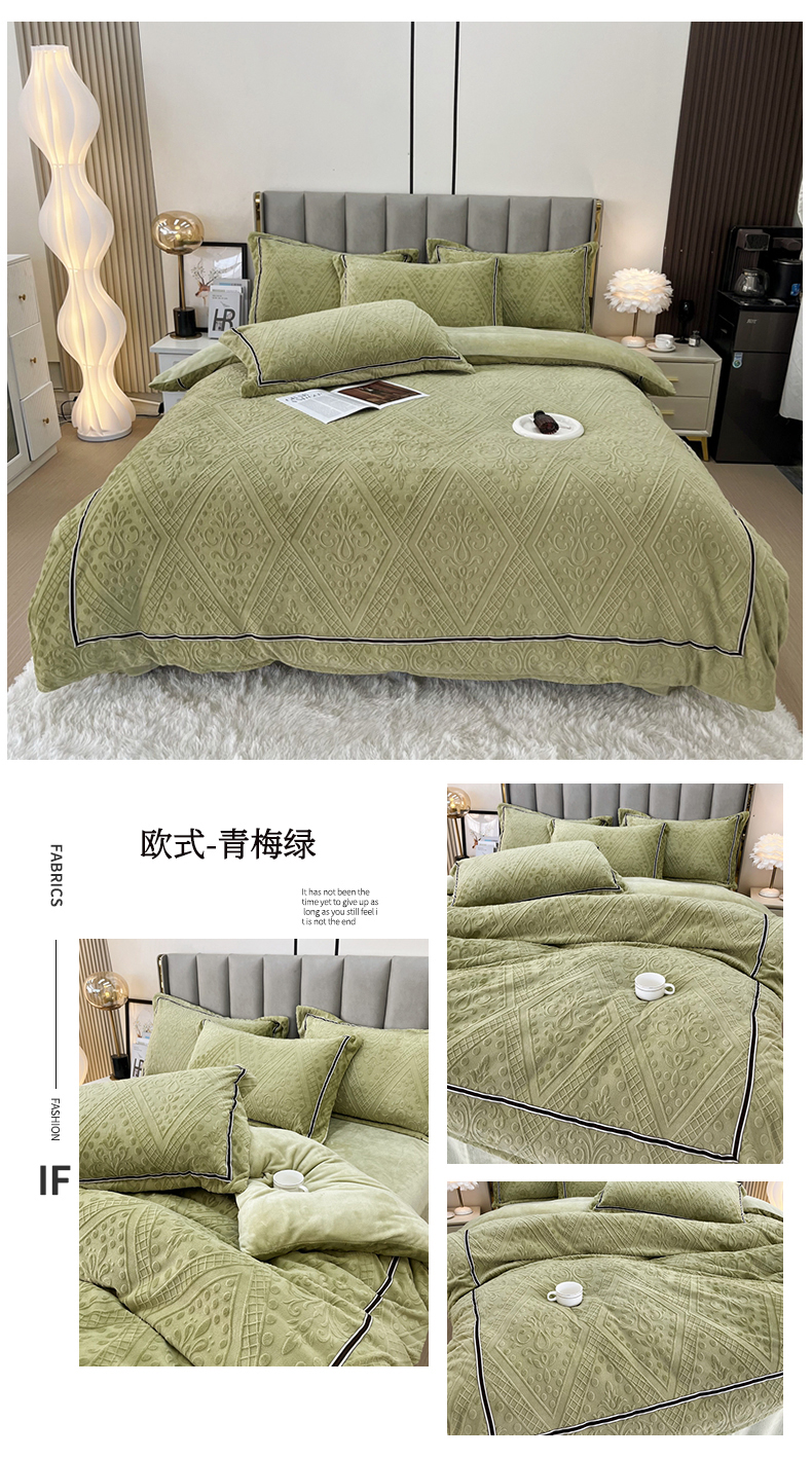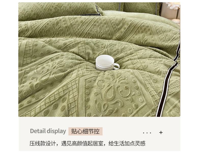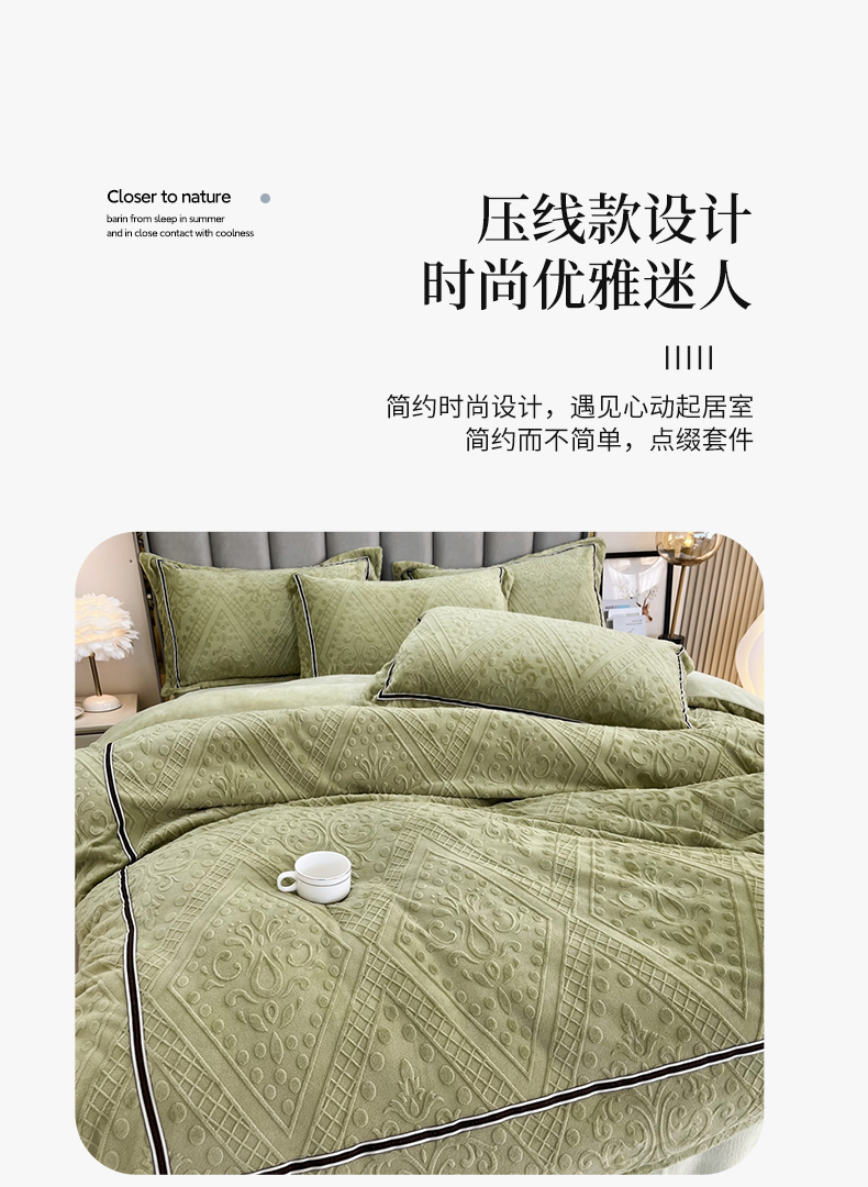 商品名称:逸林家纺《原希尔顿逸林》 2024新款牛奶绒雕花压线款四件套 欧式-青梅绿
