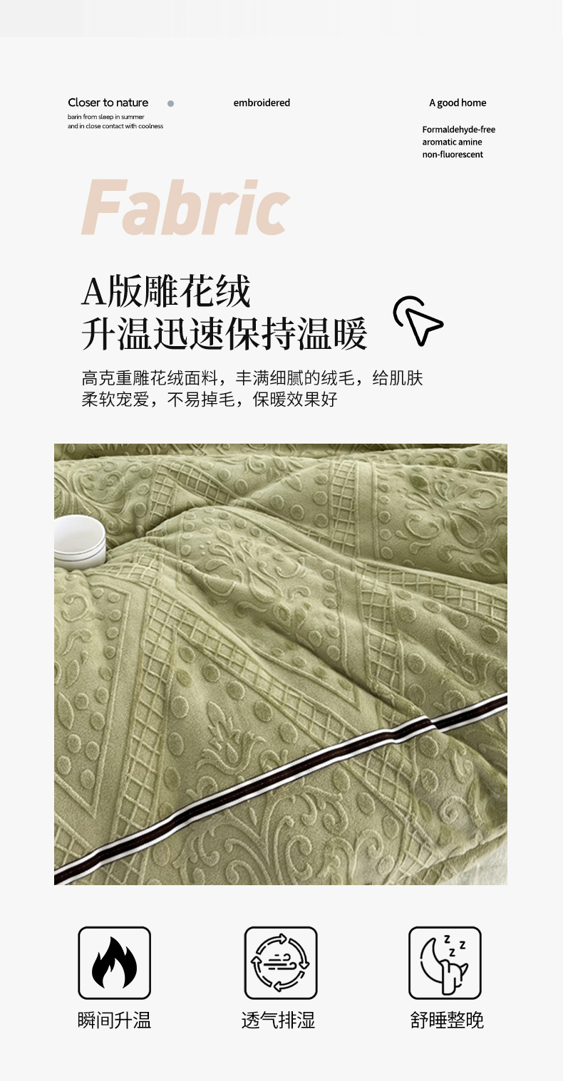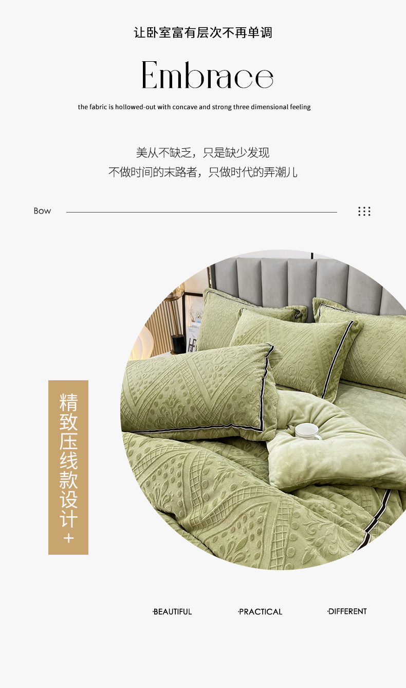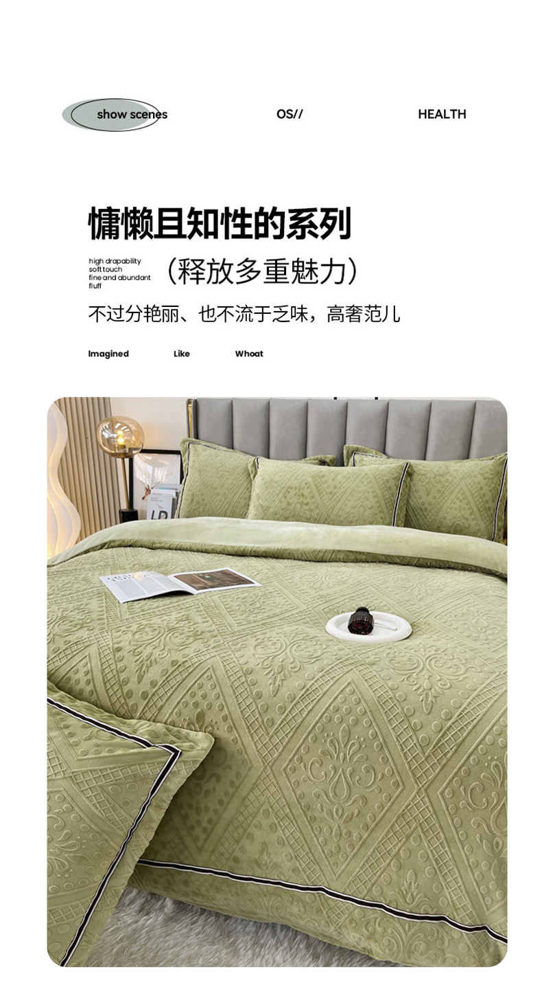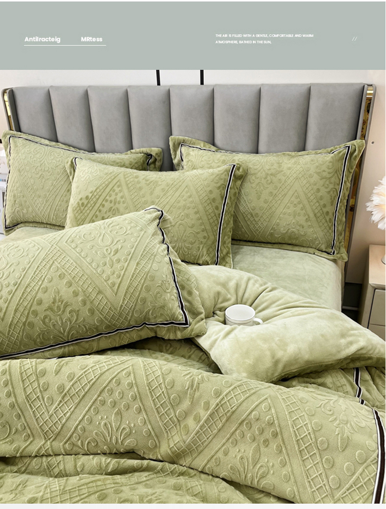 商品名称:逸林家纺《原希尔顿逸林》 2024新款牛奶绒雕花压线款四件套 欧式-青梅绿
