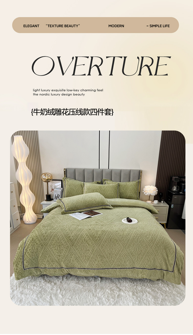 逸林家纺《原希尔顿逸林》 2024新款牛奶绒雕花压线款四件套 欧式-青梅绿