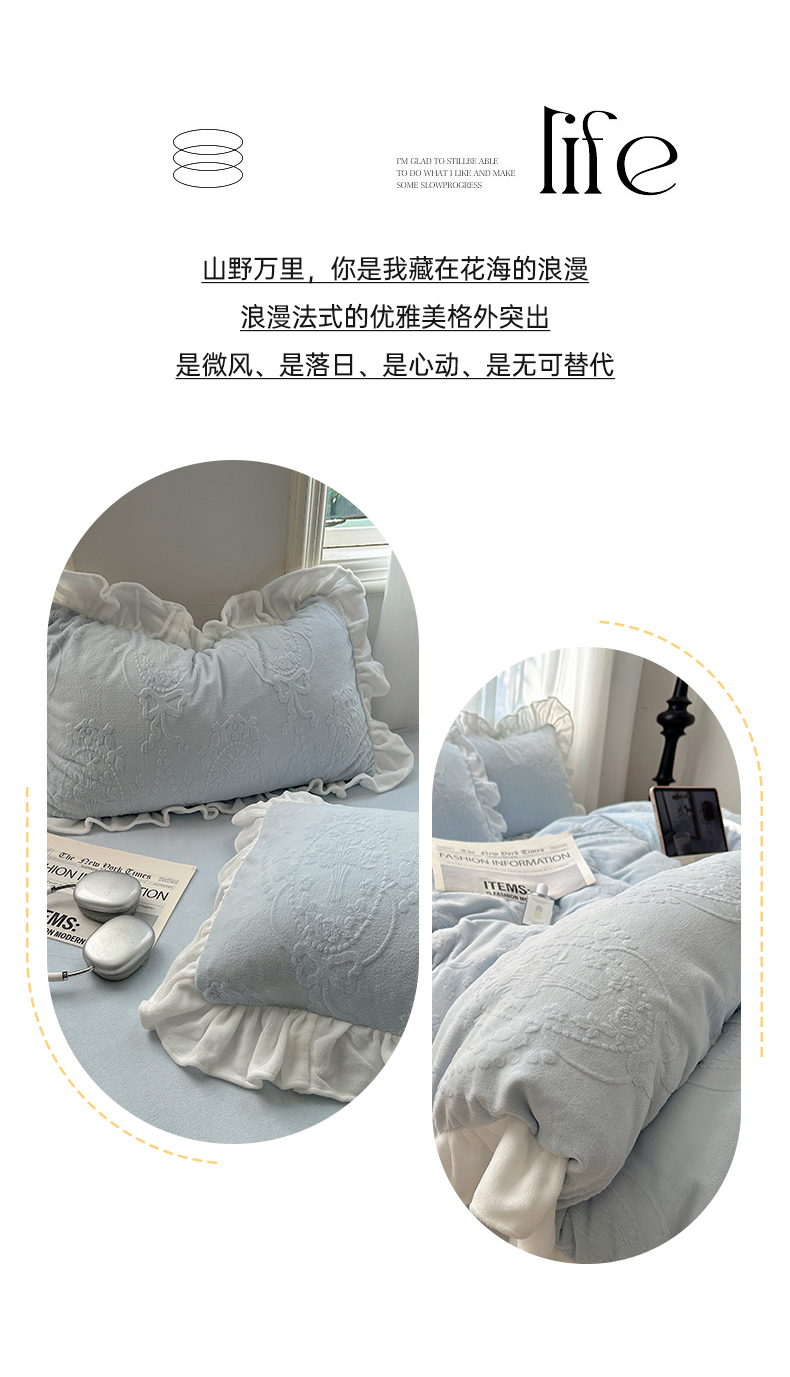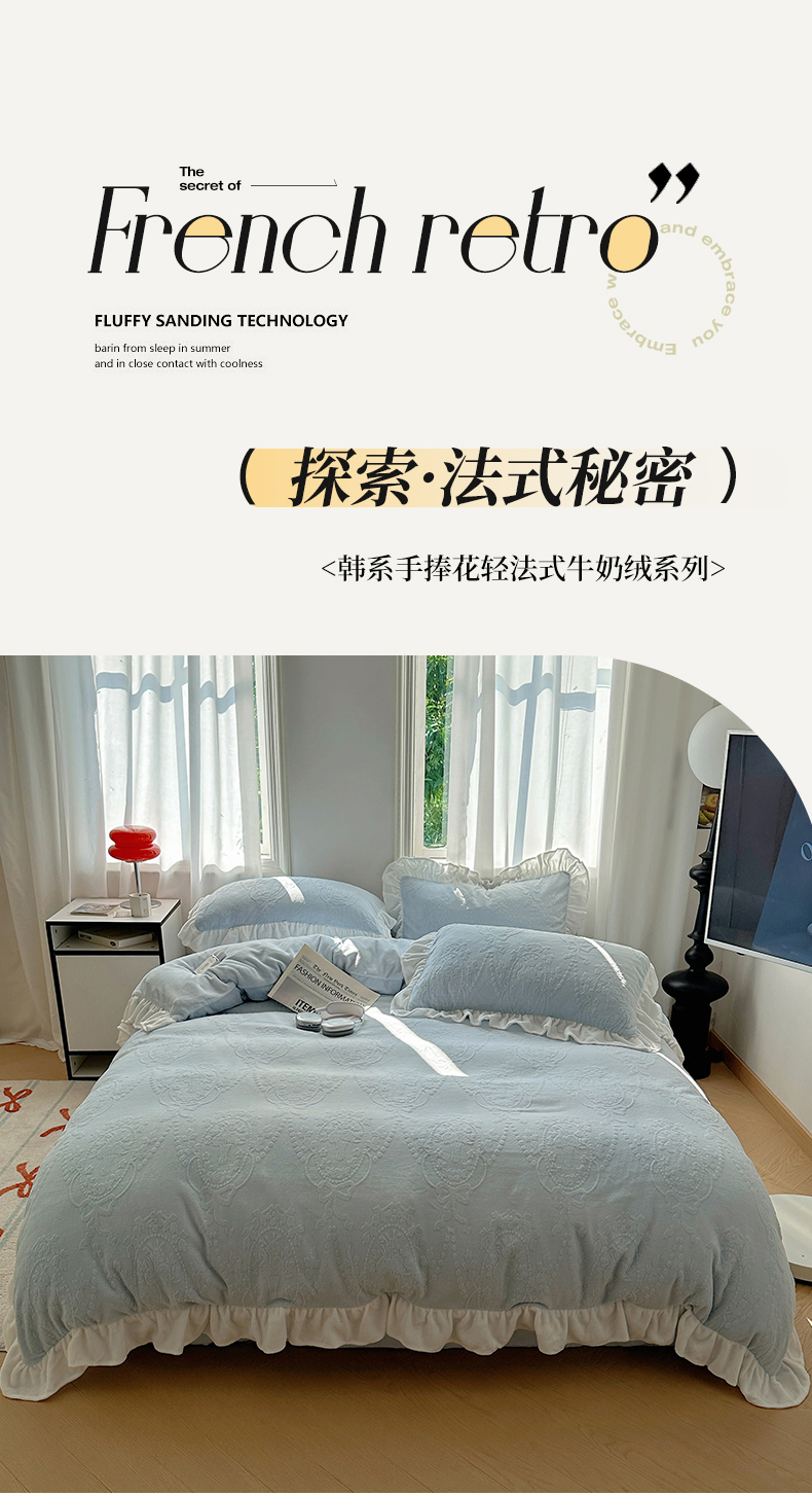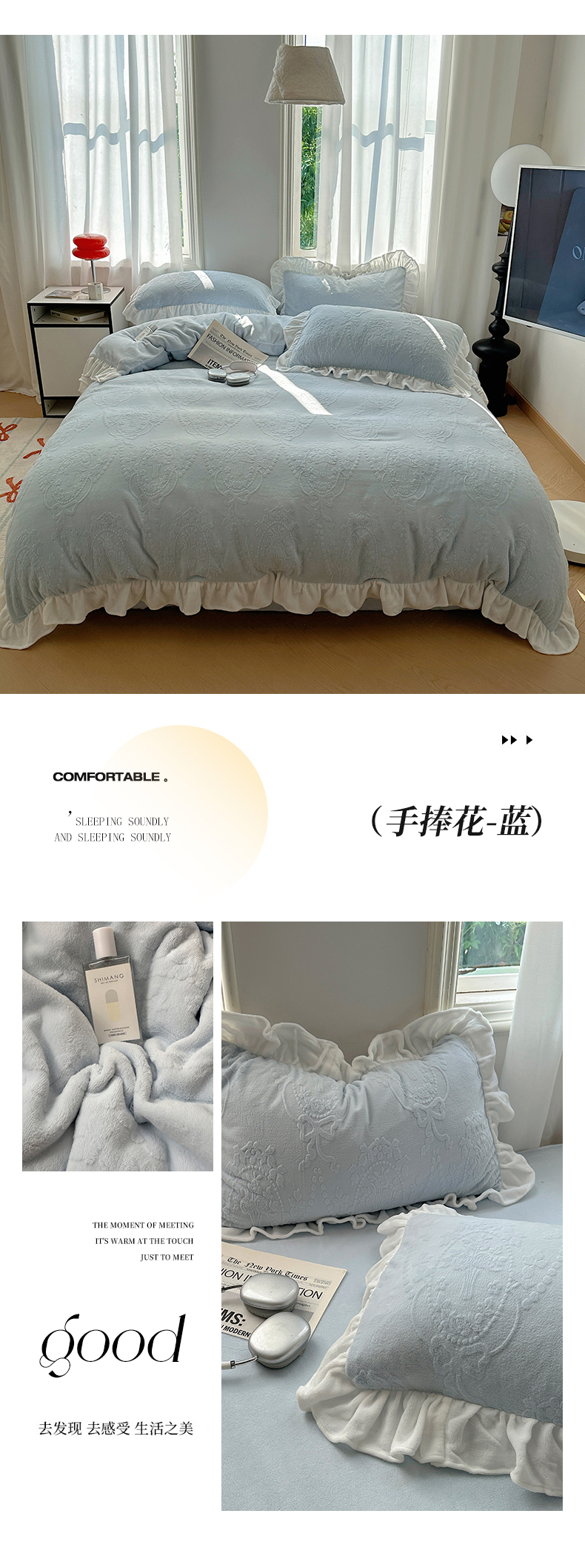 当前位置: 91家纺网 > 商品网购 > 床品套件 > 四件套 > 牛奶绒四件套 > 六巷胡同 2025新款韩系手捧花轻法式花边款牛奶绒四件套-风格一 手捧花-蓝