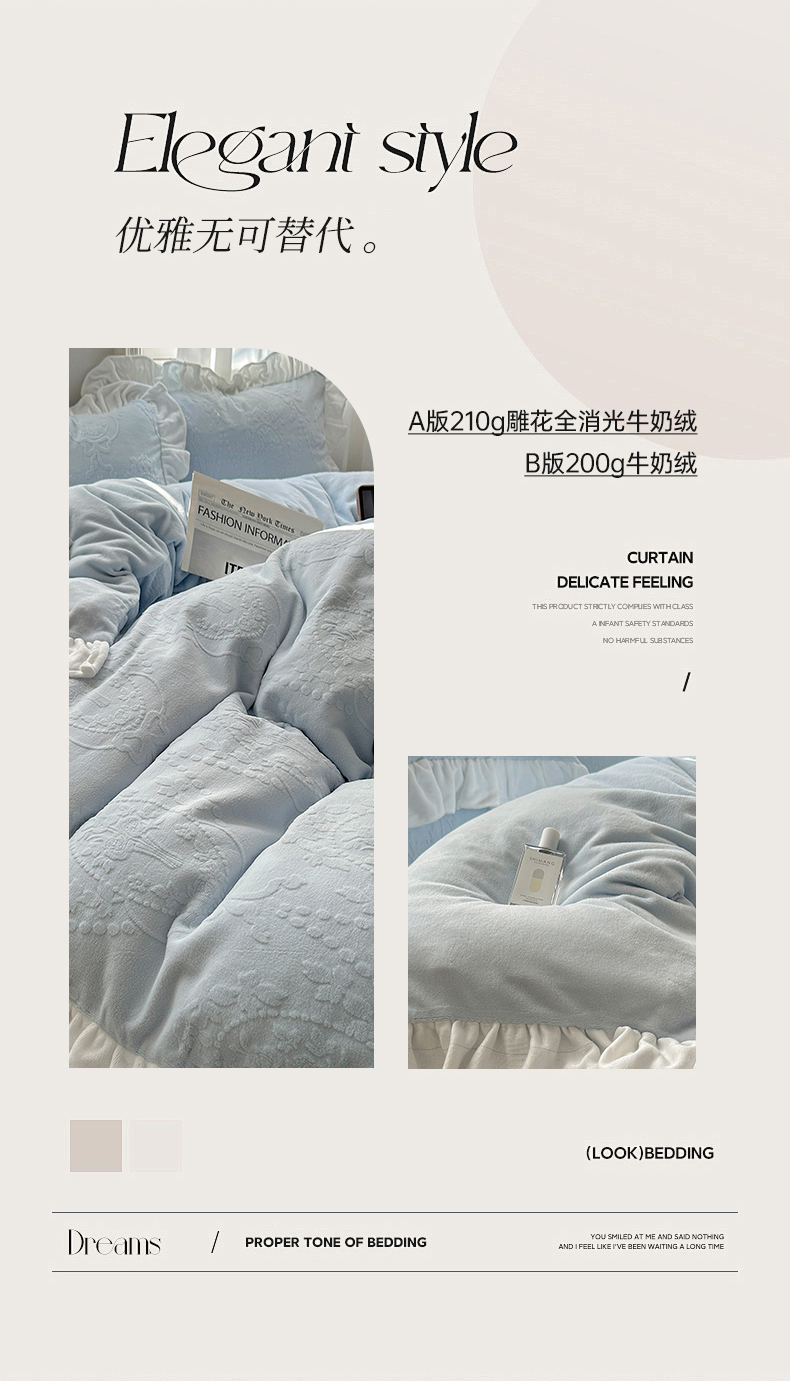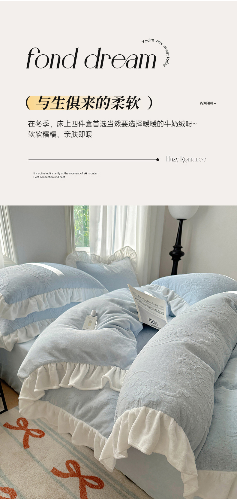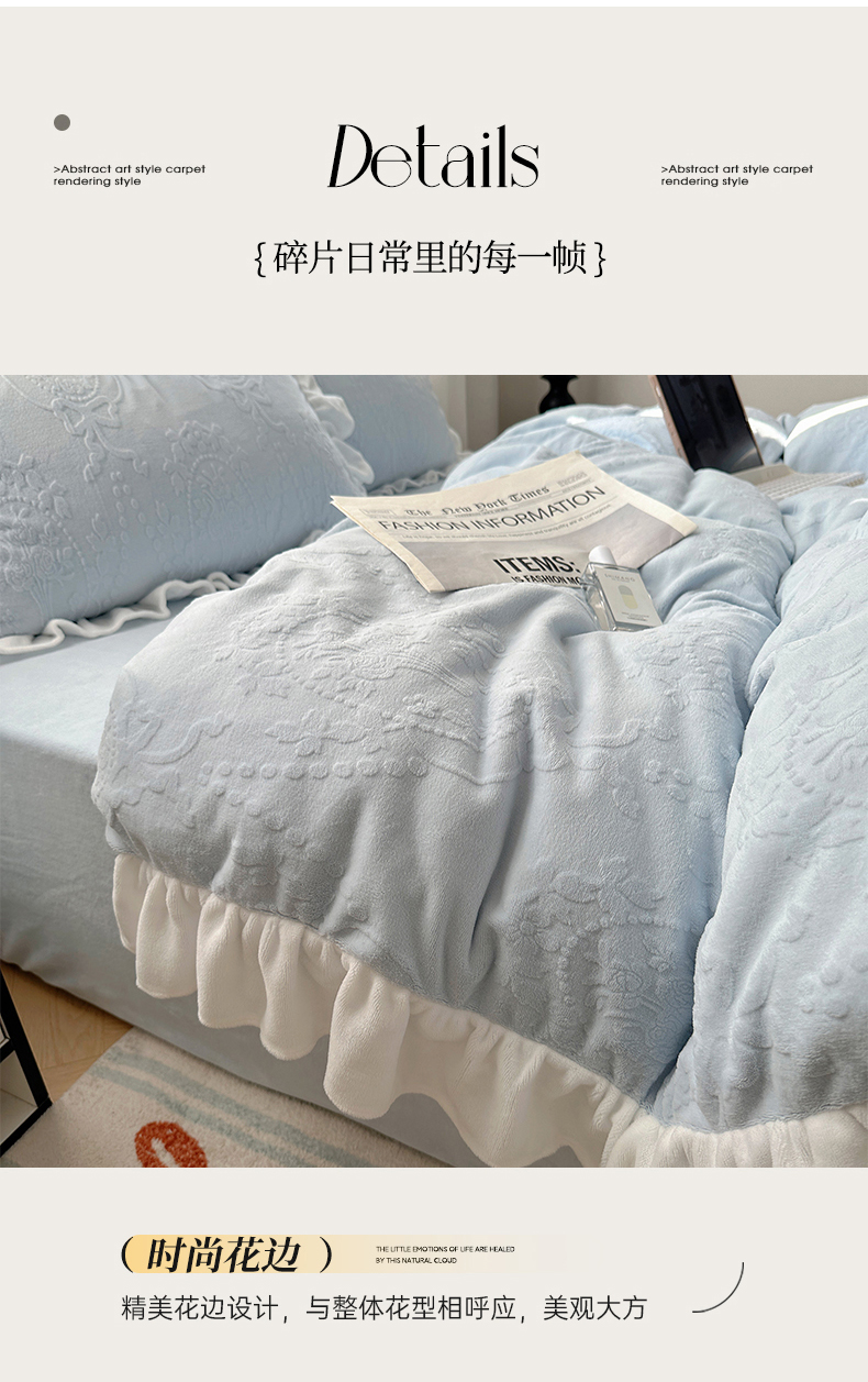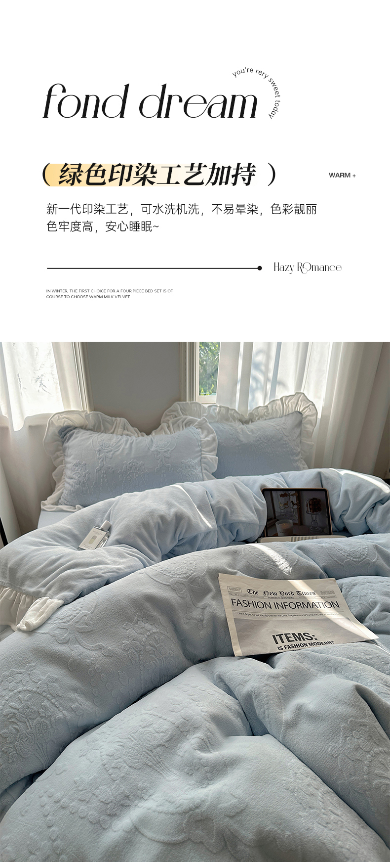 当前位置: 91家纺网 > 商品网购 > 床品套件 > 四件套 > 牛奶绒四件套 > 六巷胡同 2025新款韩系手捧花轻法式花边款牛奶绒四件套-风格一 手捧花-蓝