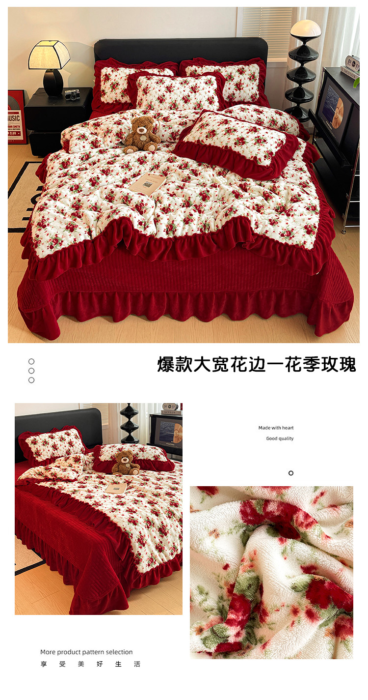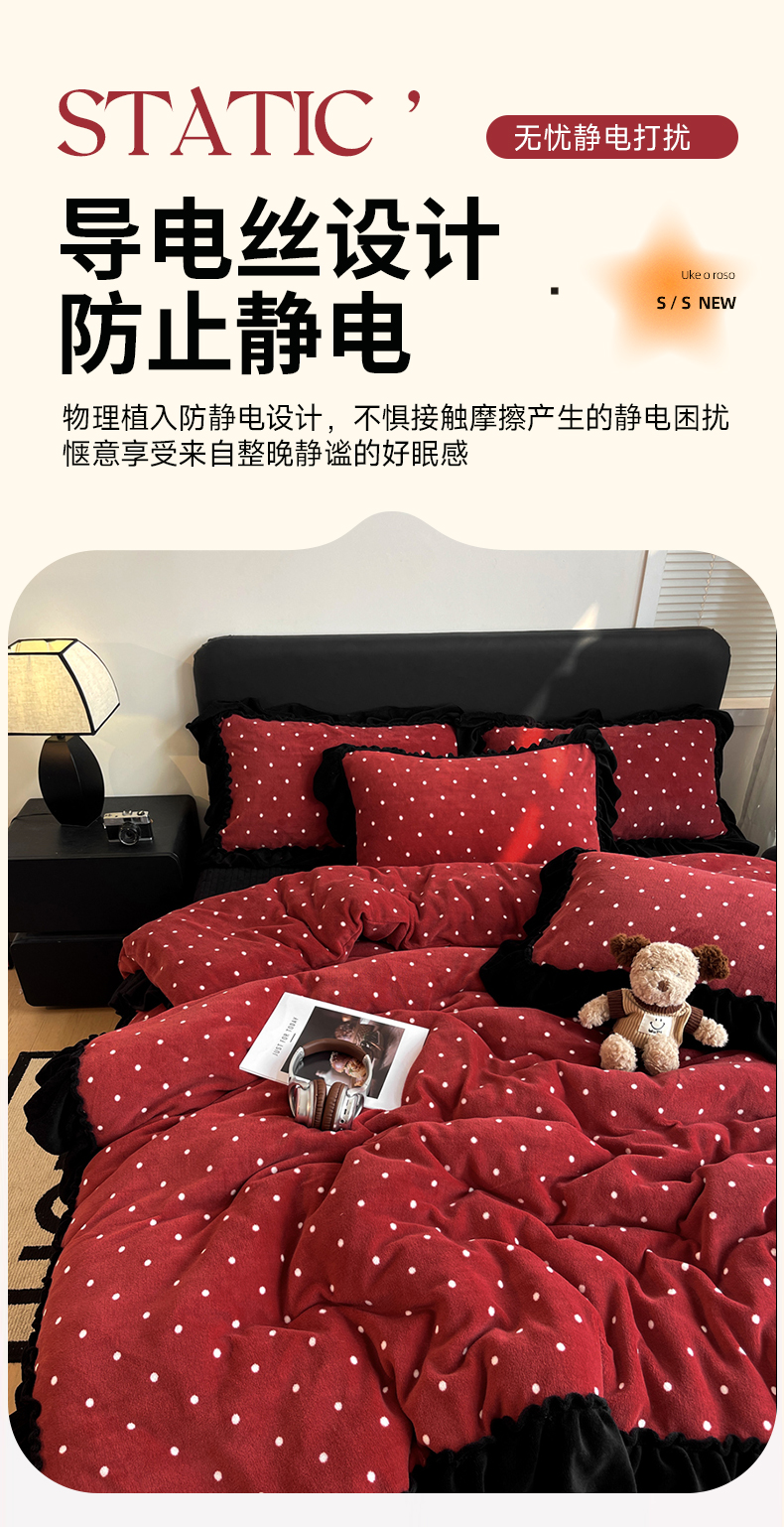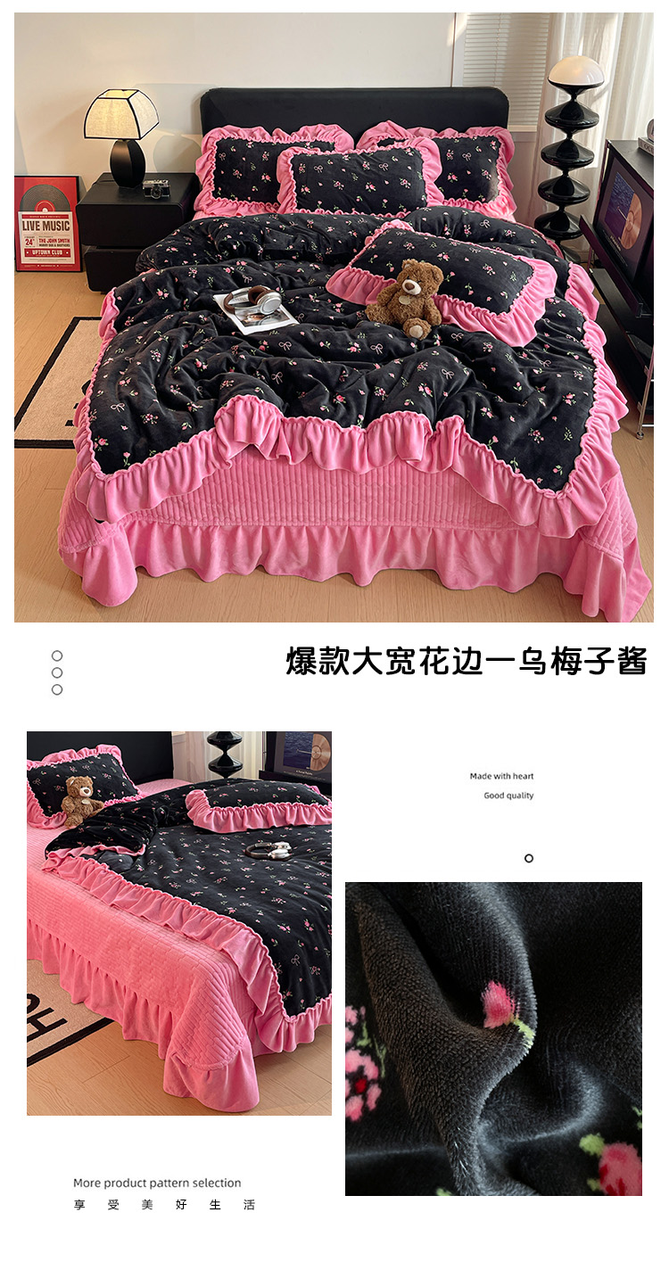 当前位置: 91家纺网 > 商品网购 > 床品套件 > 四件套 > 牛奶绒四件套 > 富米莱(原臻工厂) 2025新款热卖舒适大宽花边牛奶绒床盖床裙四件套 爆款大宽花边-黑波点
