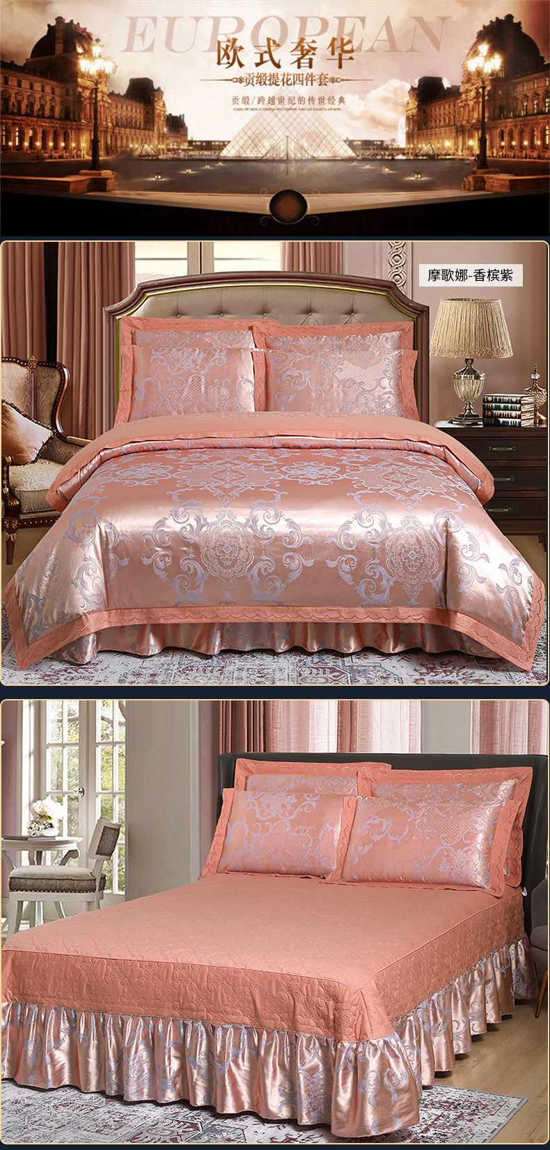(总) 福丽莱家纺 2019贡缎提花床裙四件套(单层),黛香-豆沙,典范欧风-蓝灰,菲洛嘉,国色佳人,花团锦簇-银灰,花团锦簇-粉玉,玛格丽特-金兰,玫瑰风情-大红,摩卡庄园-紫驼,暖心芳妍-大红,浅芳菲-粉紫,喜上眉梢-砖红,仙境青色