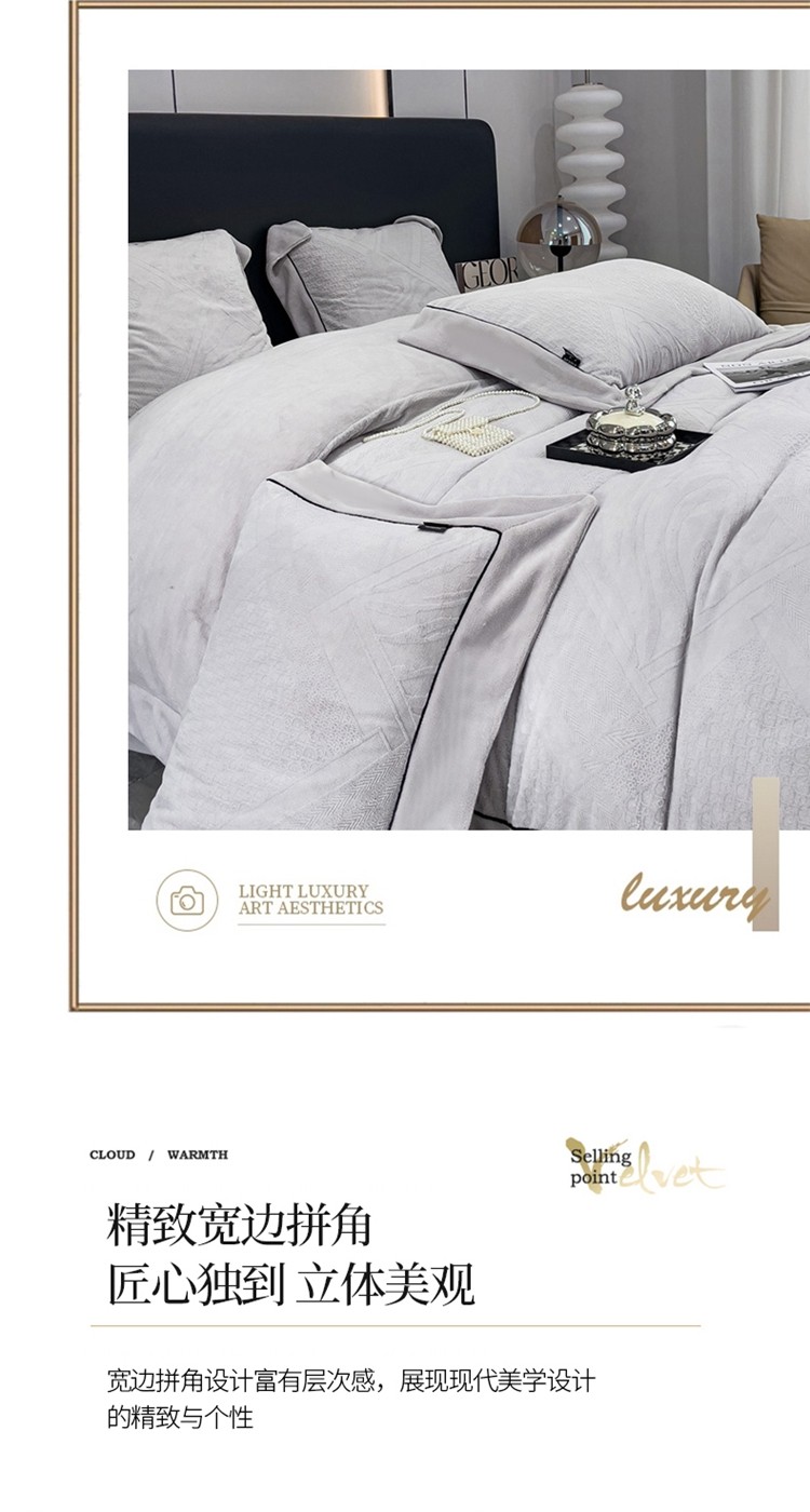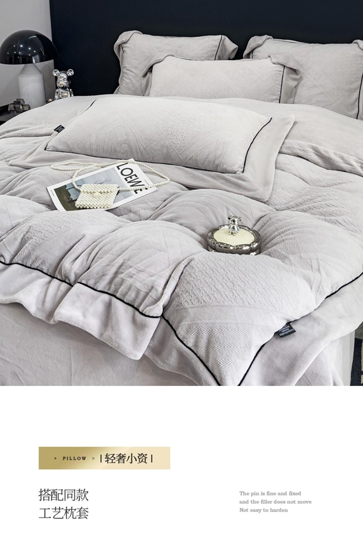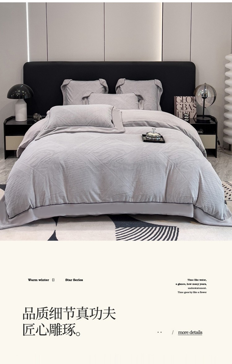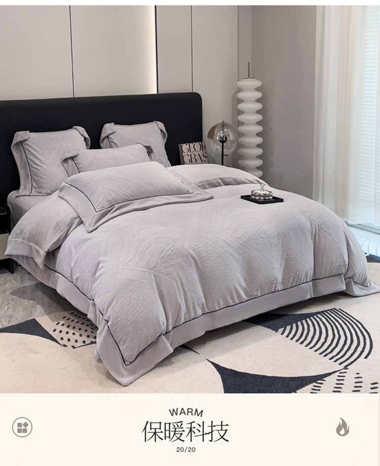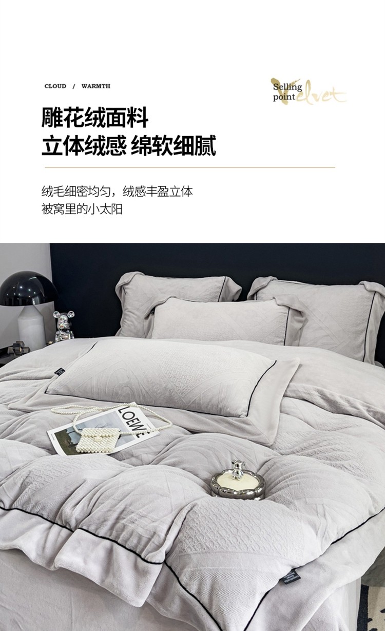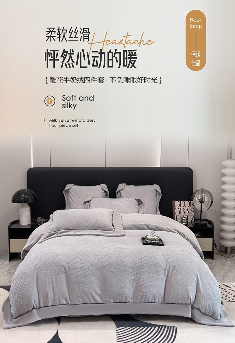 商品名称:2025新款牛奶绒雕花四件套-苏黎 浅灰色