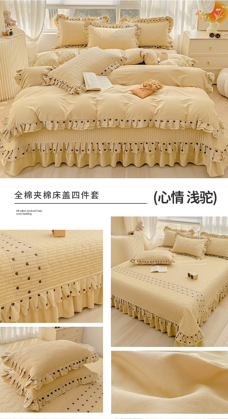 当前位置: 91家纺网 > 商品网购 > 床品套件 > 四件套 > 全棉普通四件套 > 宜凡家纺 2024新品全棉夹棉双层花边床盖四件套-心情 心情 浅驼