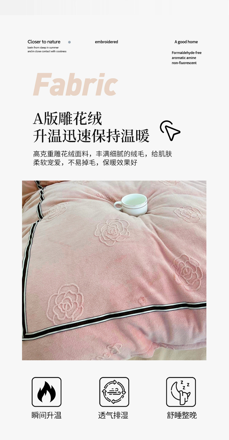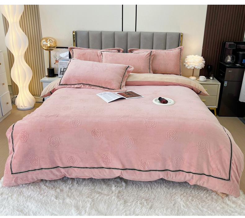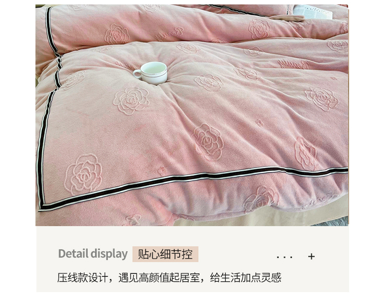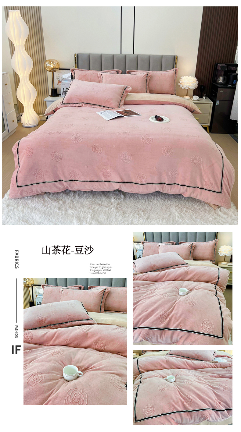 商品名称:逸林家纺《原希尔顿逸林》 2024新款牛奶绒雕花压线款四件套 山茶花-豆沙