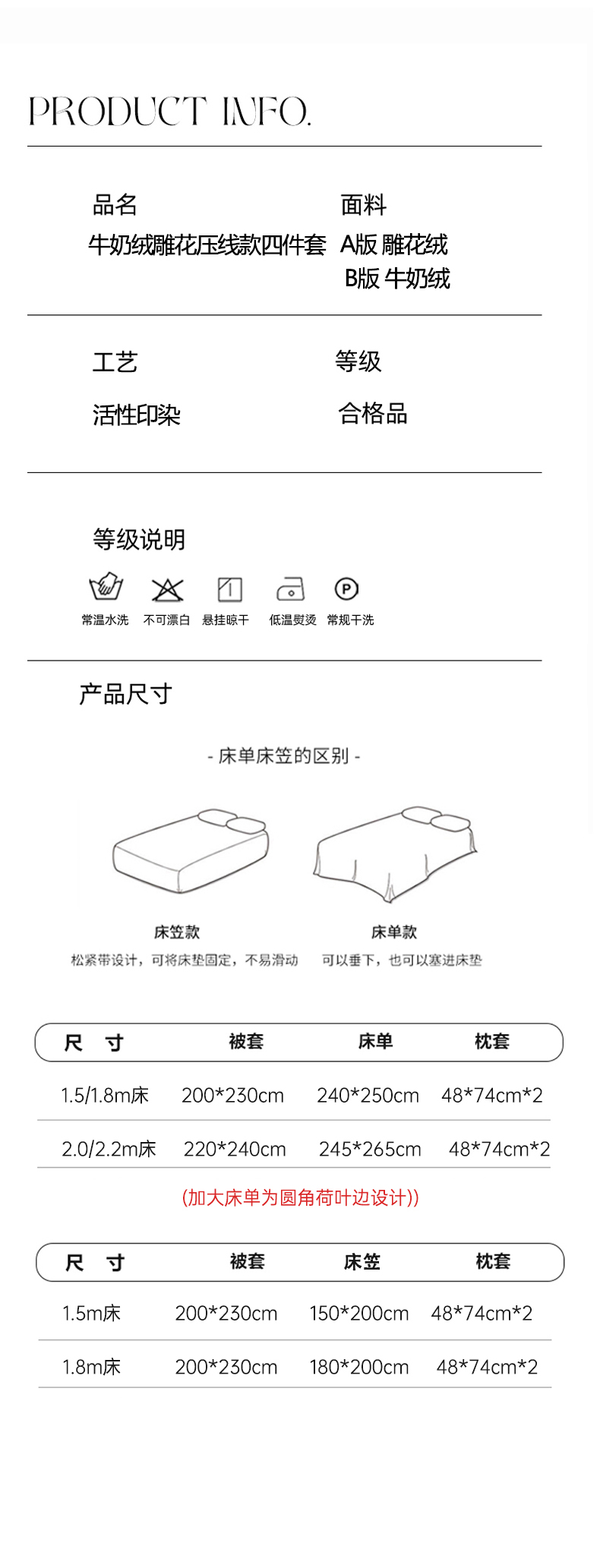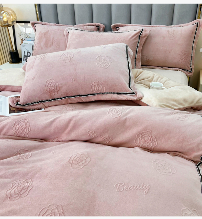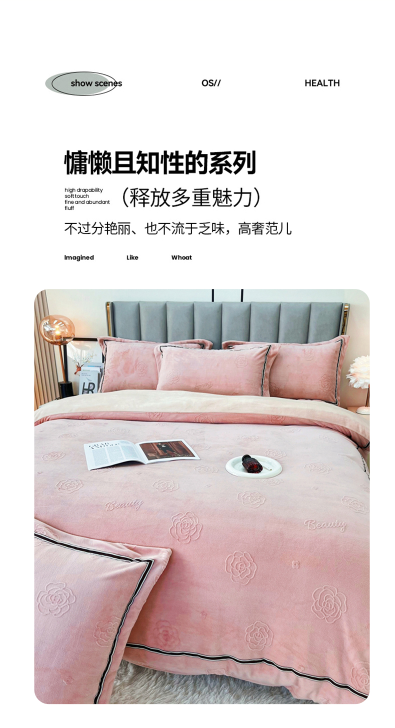 商品名称:逸林家纺《原希尔顿逸林》 2024新款牛奶绒雕花压线款四件套 山茶花-豆沙