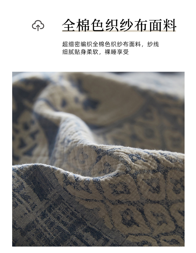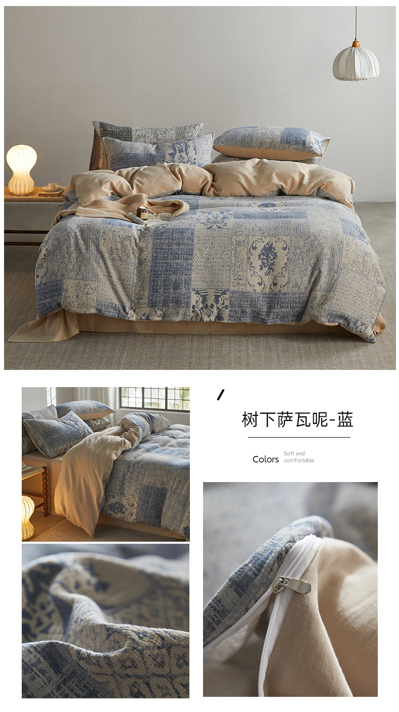 商品名称:山舍家居 2025新款全棉纯棉色织纱布四件套系列-树下萨瓦呢(棚拍二) 树下萨瓦呢-蓝