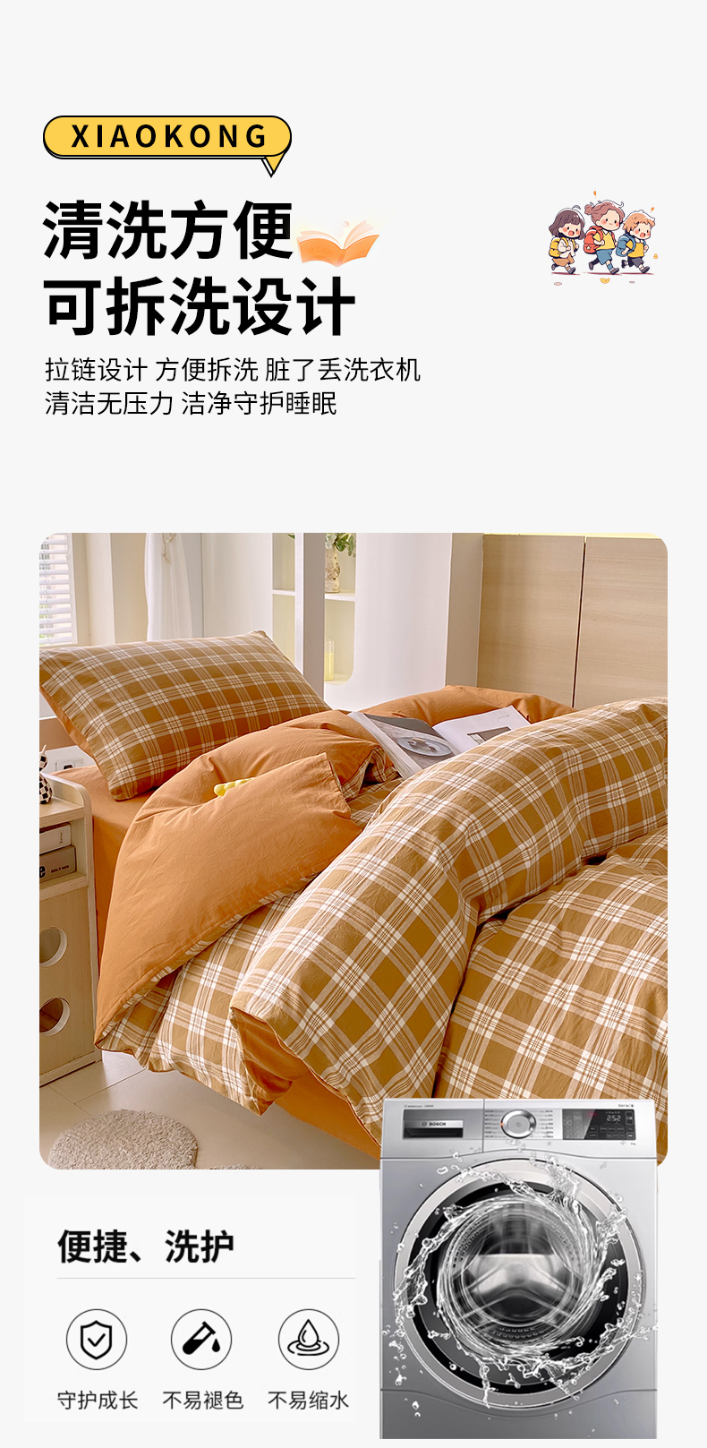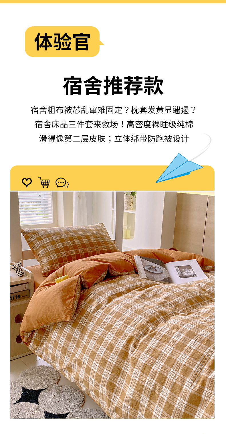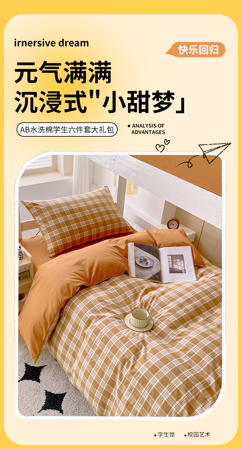 当前位置: 91家纺网 > 商品网购 > 床品套件 > 四件套 > 全棉普通四件套 > 春皖家纺 2025春夏新款AB版全棉纯棉色织水洗棉学生三件套六件套 素雅-黄格