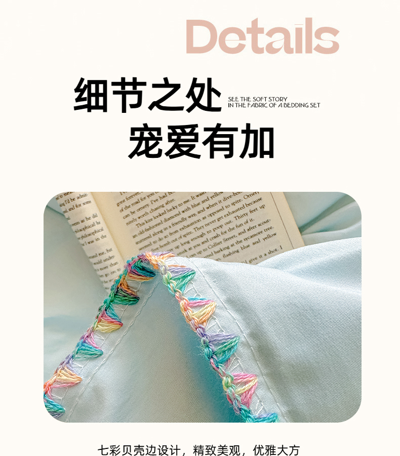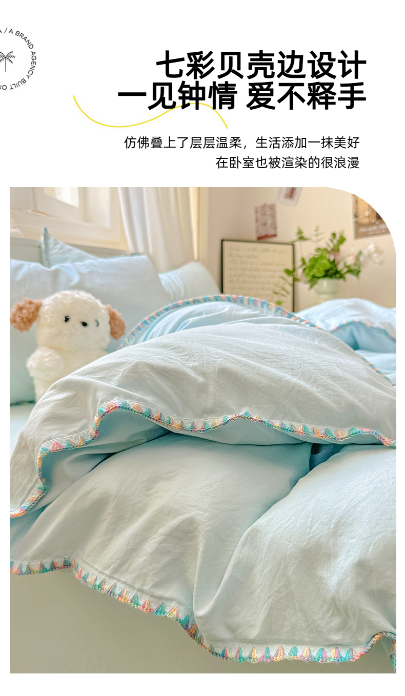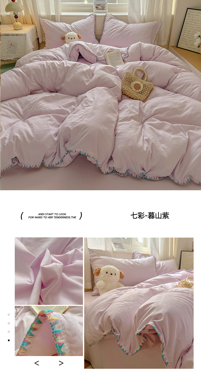 当前位置: 91家纺网 > 商品网购 > 床品套件 > 四件套 > 水洗棉四件套 > 冕悠家纺 2025新款A类七彩贝壳边水洗棉四件套 七彩-奶白暮山紫