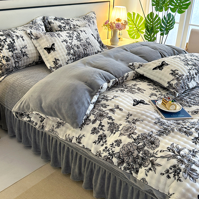 富缦庭 2025新款泡泡牛奶绒床盖款四件套 花蝶情缘