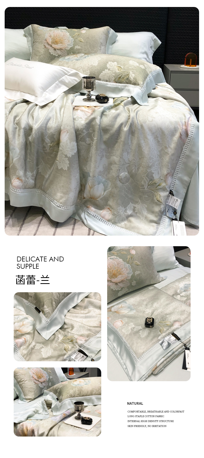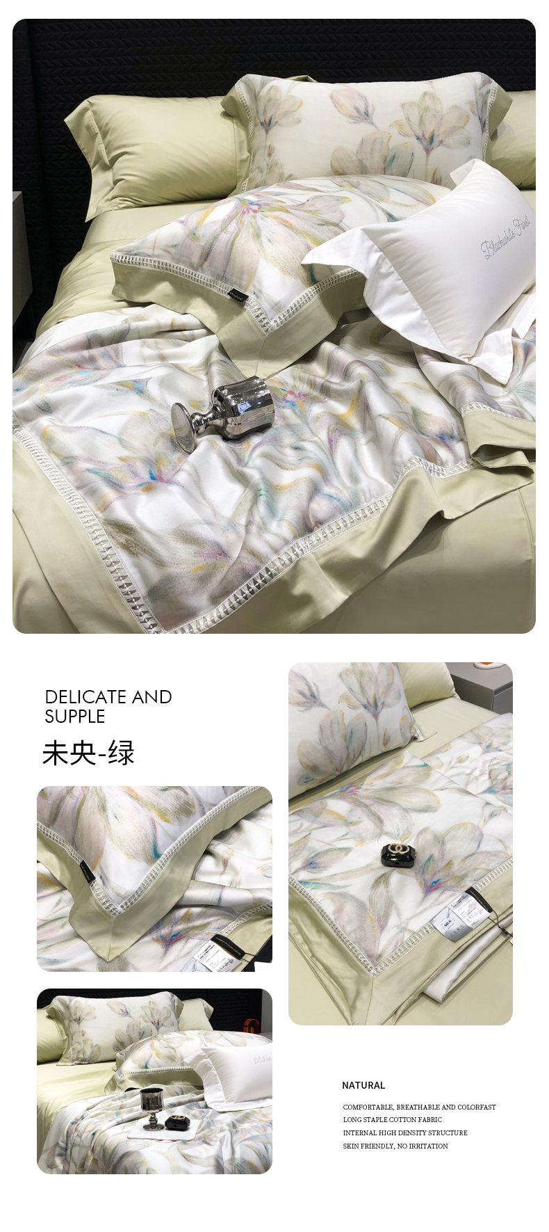 (总)黑白森林2024款 80X80S高支天丝棉四件套镂空蕾丝花边天丝全棉,尚美-晨夕粉,尚美-古象白,尚美-青砂绿,尚美-银雪灰