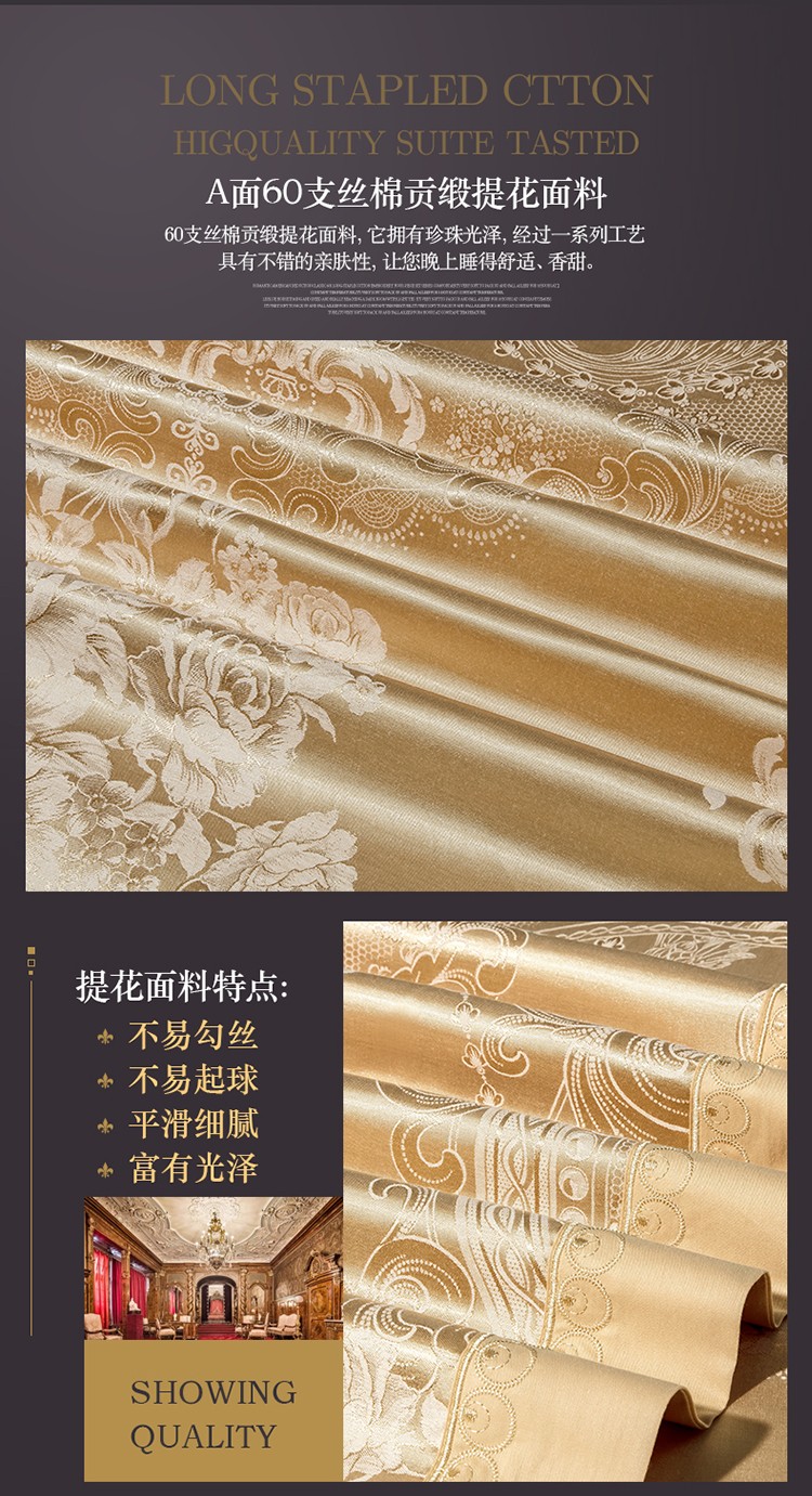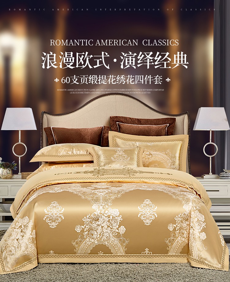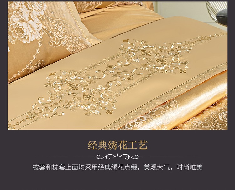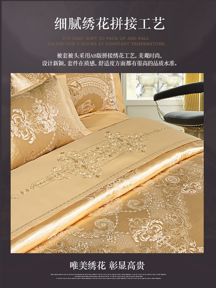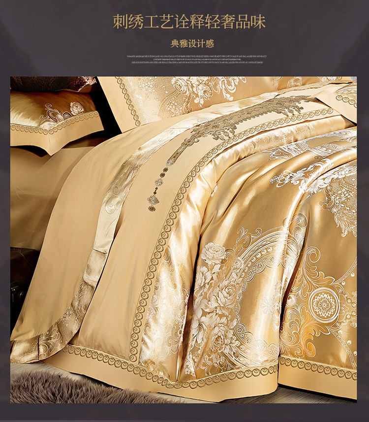 柔觉家纺 天丝刺绣贡缎提花全棉四件套,科西利亚-金色