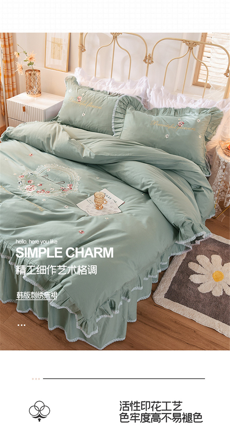 迪欧芙 2020新款全棉花蔓系列床裙款四件套韩版四件套 蓝绿