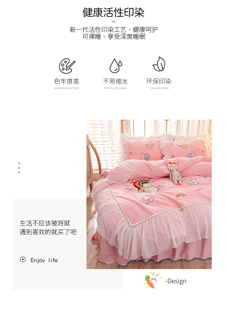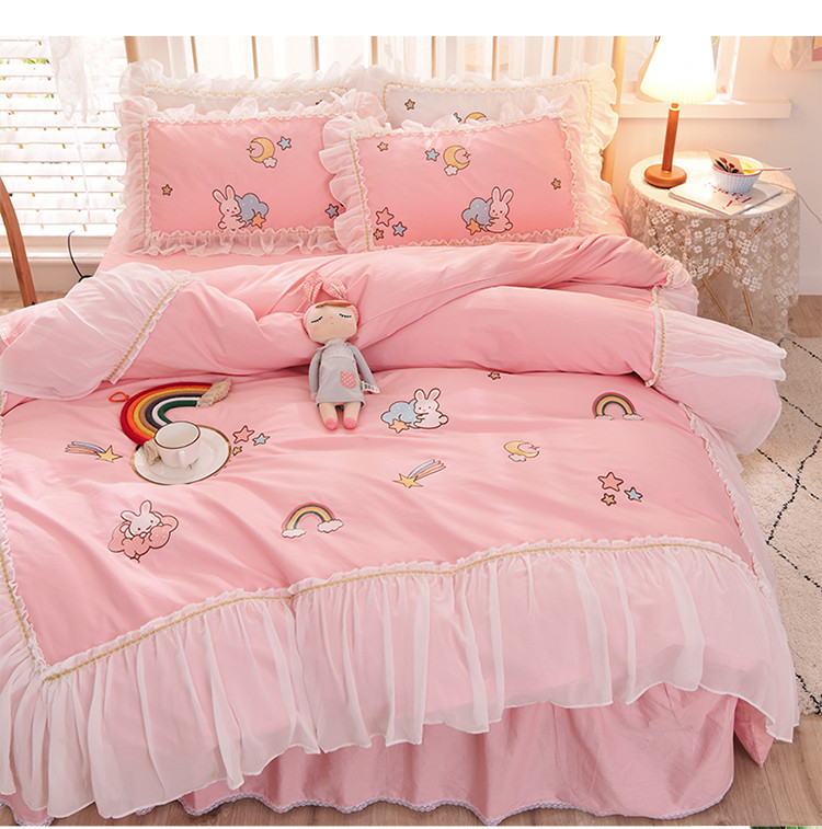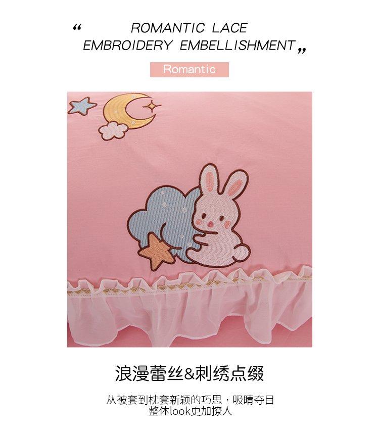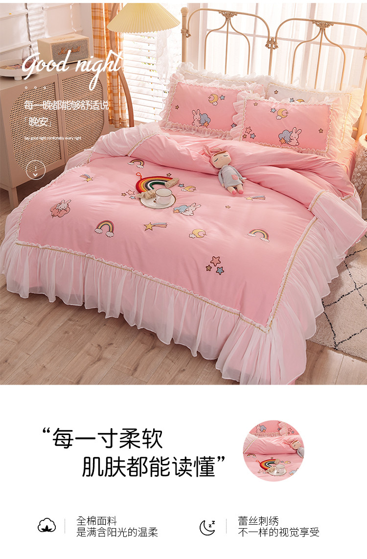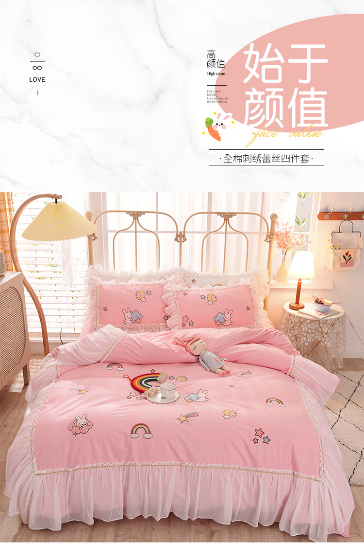 迪欧芙 2020新款全棉蕾丝公主风彩虹兔系列四件套彩虹兔-粉