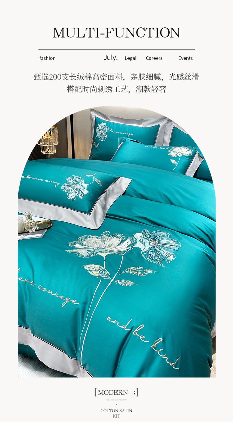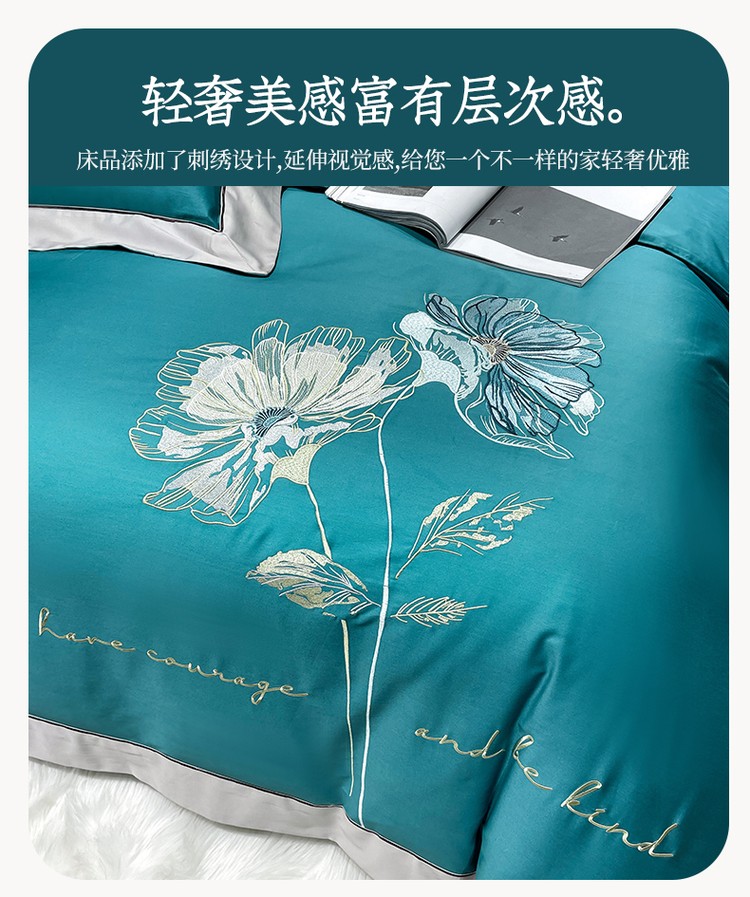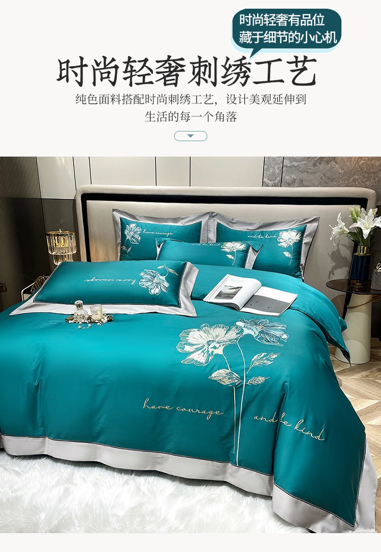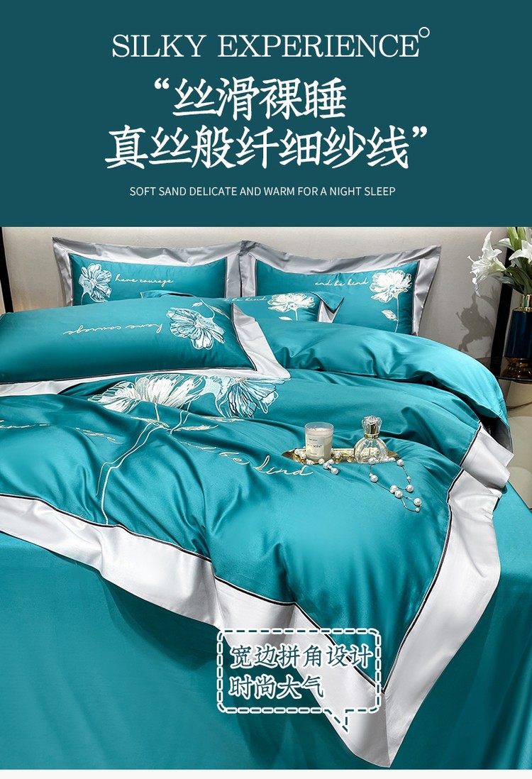 柔觉家纺 天丝刺绣贡缎提花全棉四件套,水汐-绸缎兰