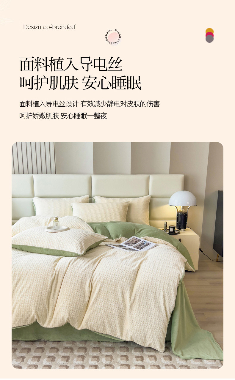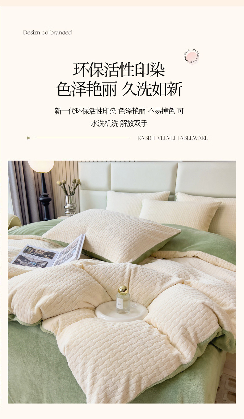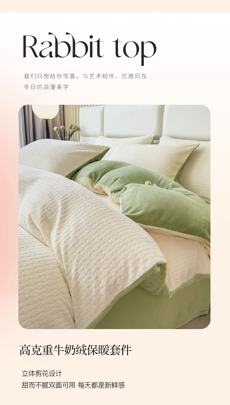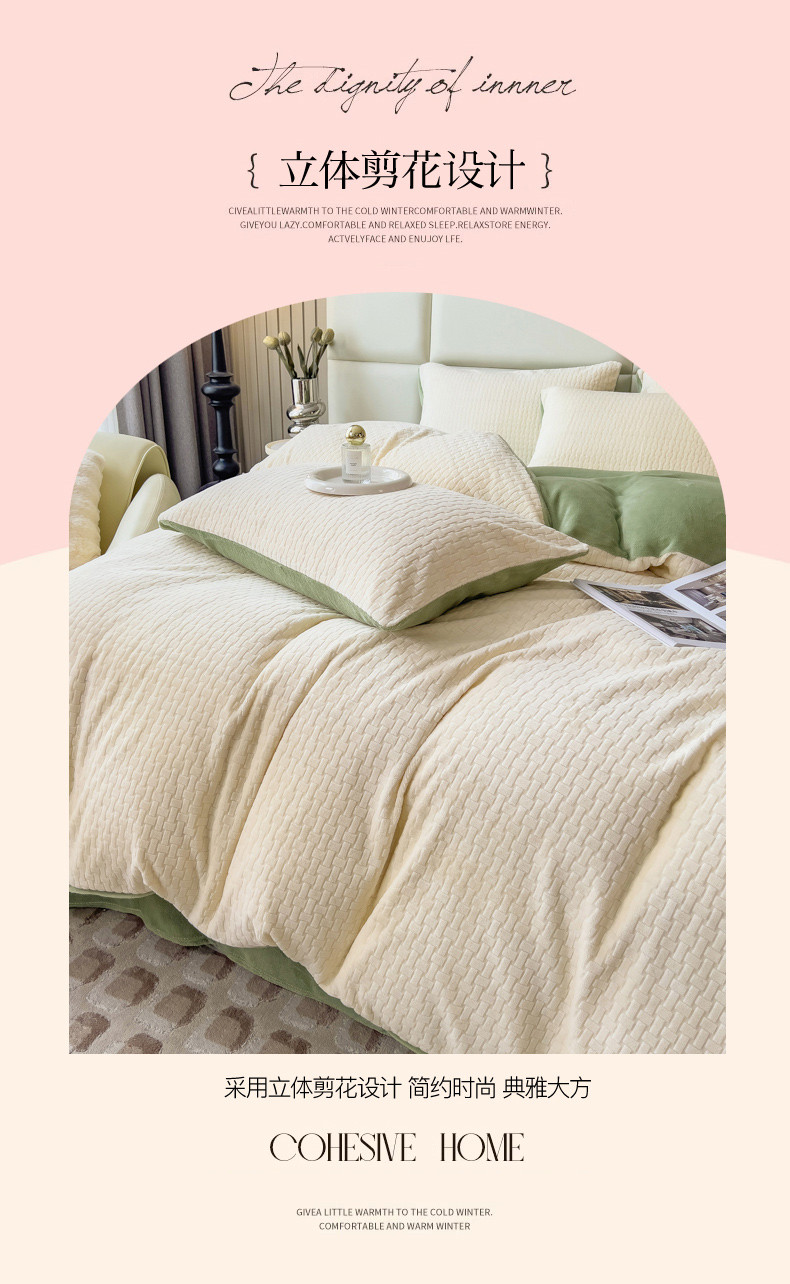 商品名称:印季 2024新款立体剪花牛奶绒保暖四件套-十字结 奶白-草绿