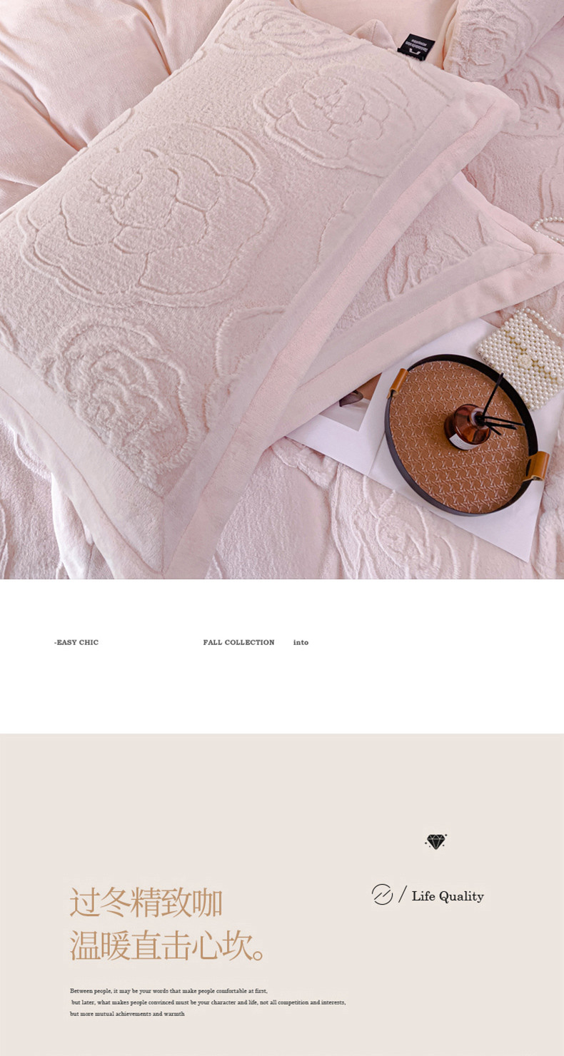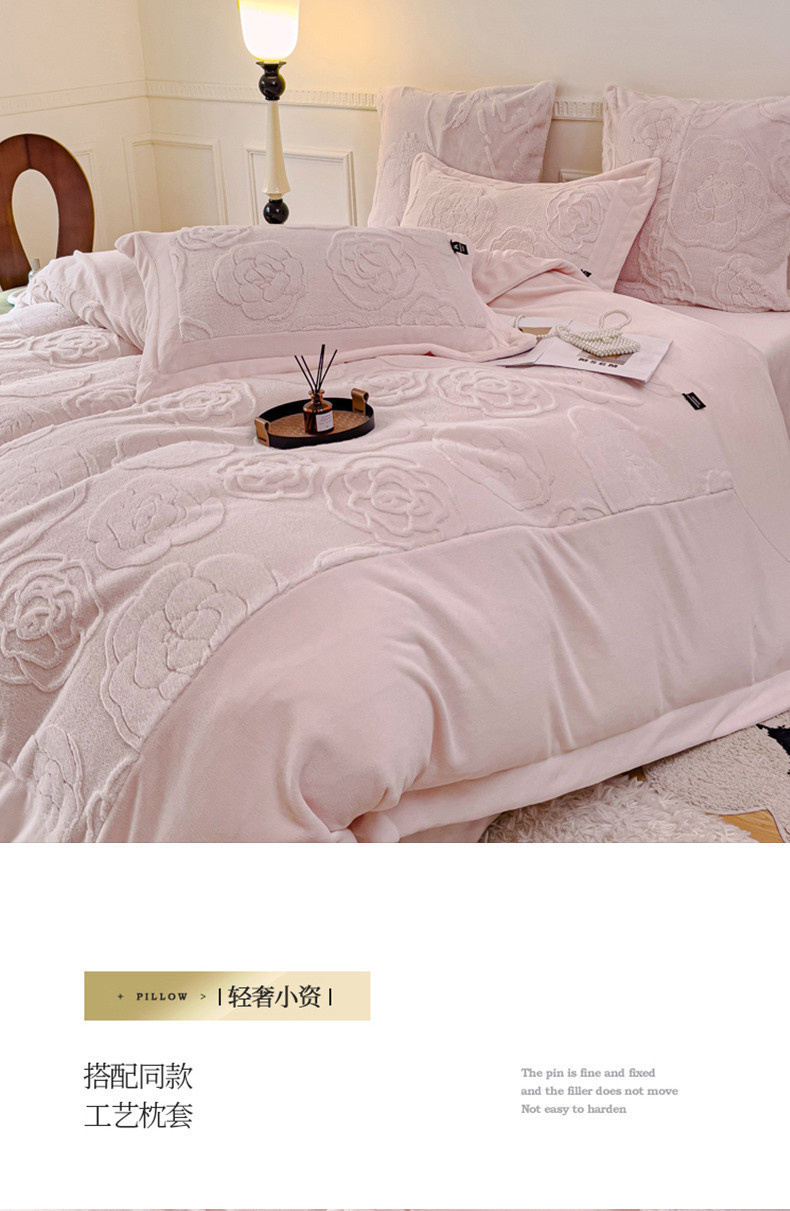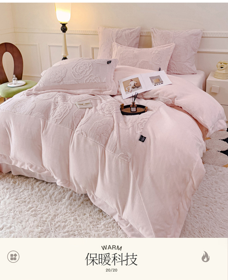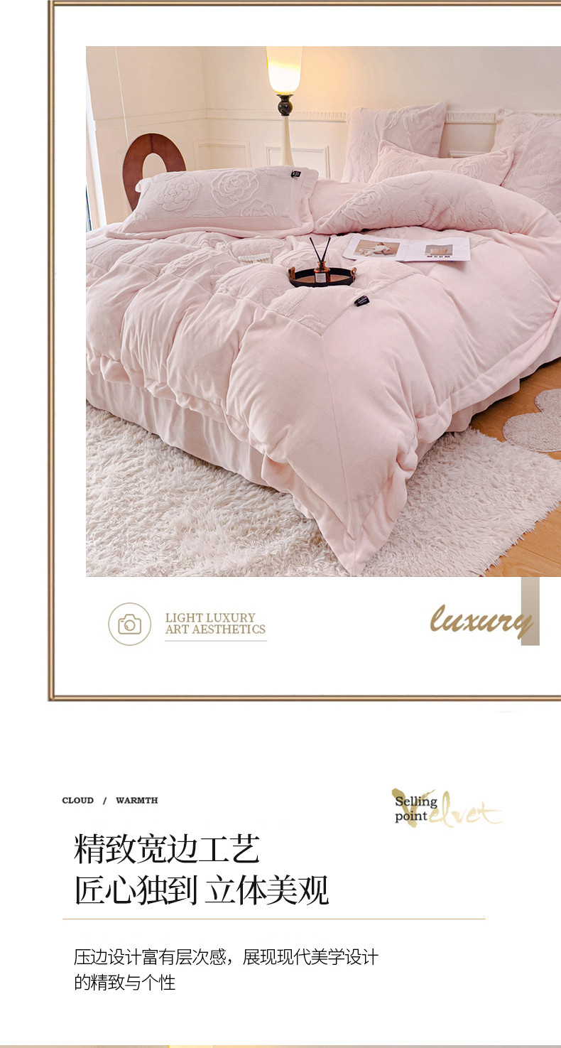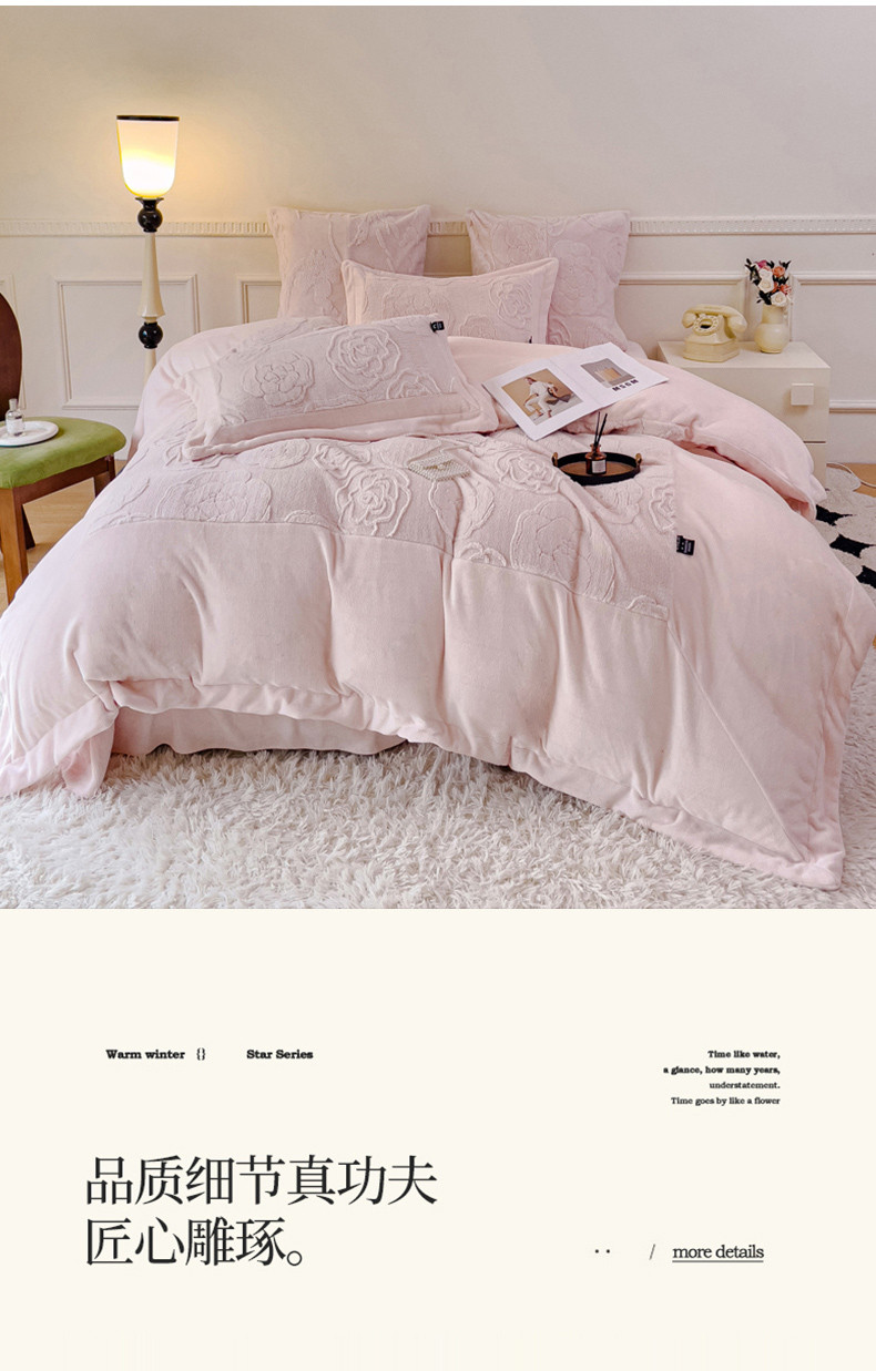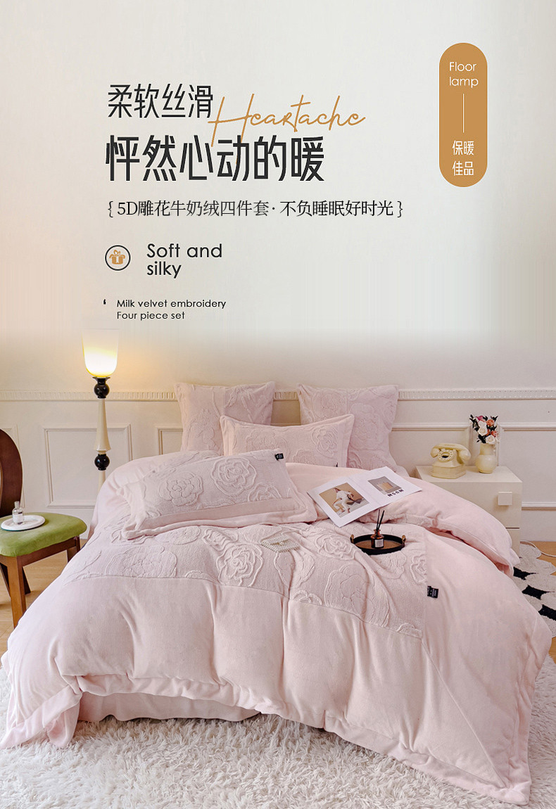 (总)品家居 2025新款5D雕花牛奶绒绣花大拼角四件套-岁月静好,粉色,蓝色,秋黄