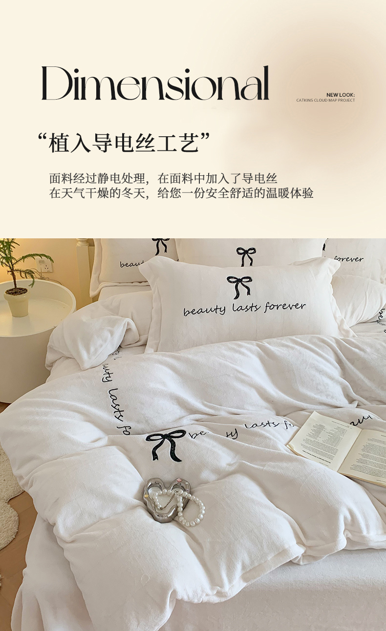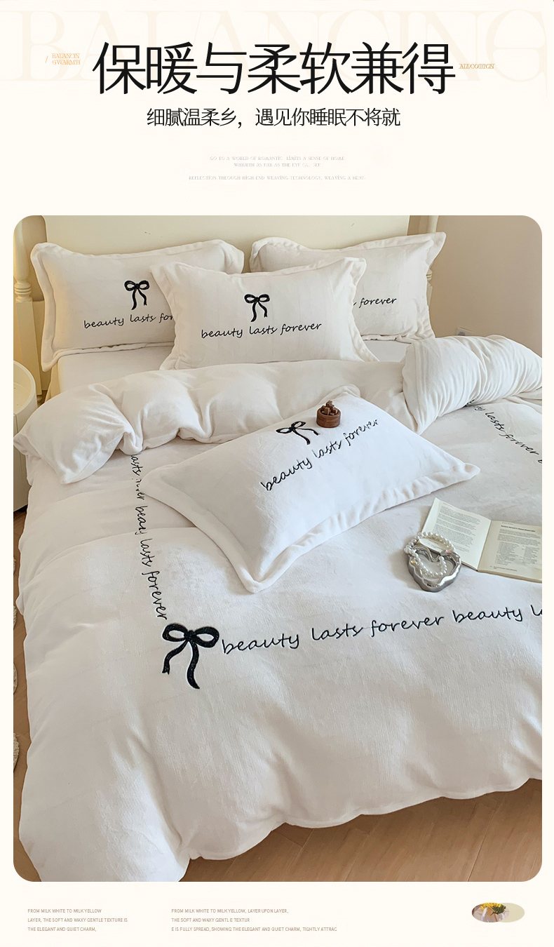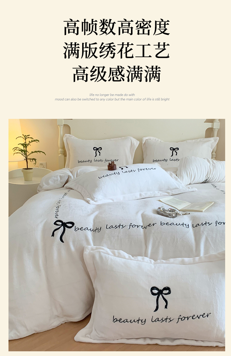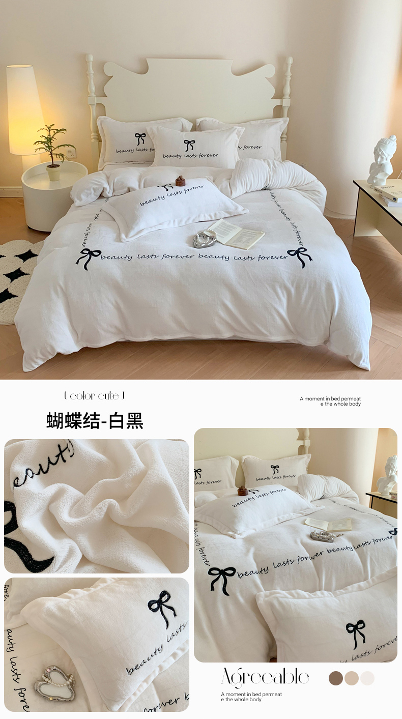当前位置: 91家纺网 > 商品网购 > 床品套件 > 四件套 > 牛奶绒四件套 > 你好美丽 2025新款200克牛奶绒四件套--蝴蝶结 蝴蝶机白黑