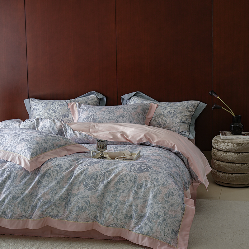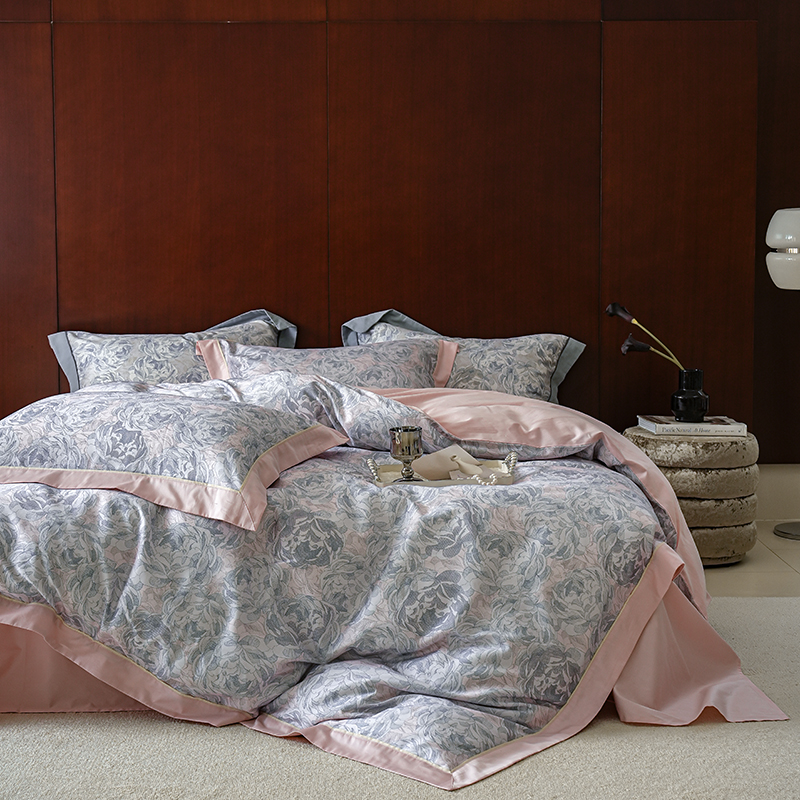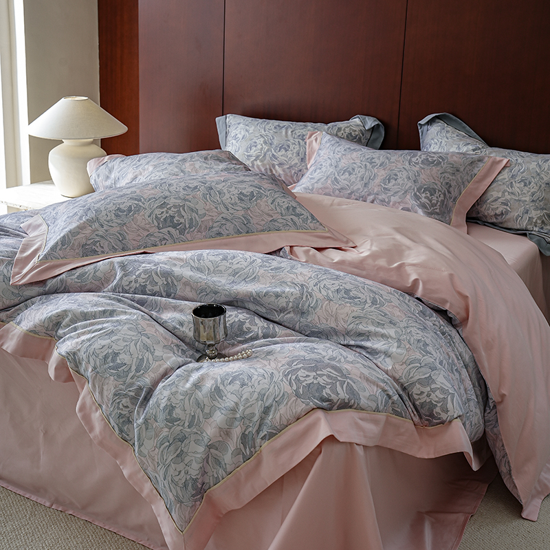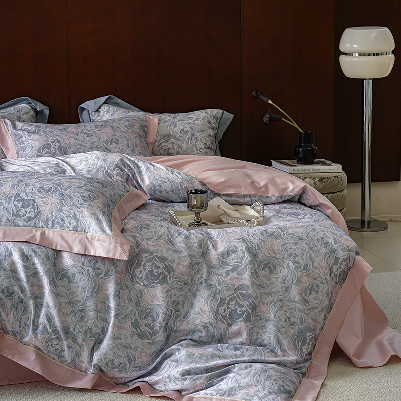 商品名称:2024新款天丝棉磨毛宽边+嵌条印花四件套 繁花予槿-灰