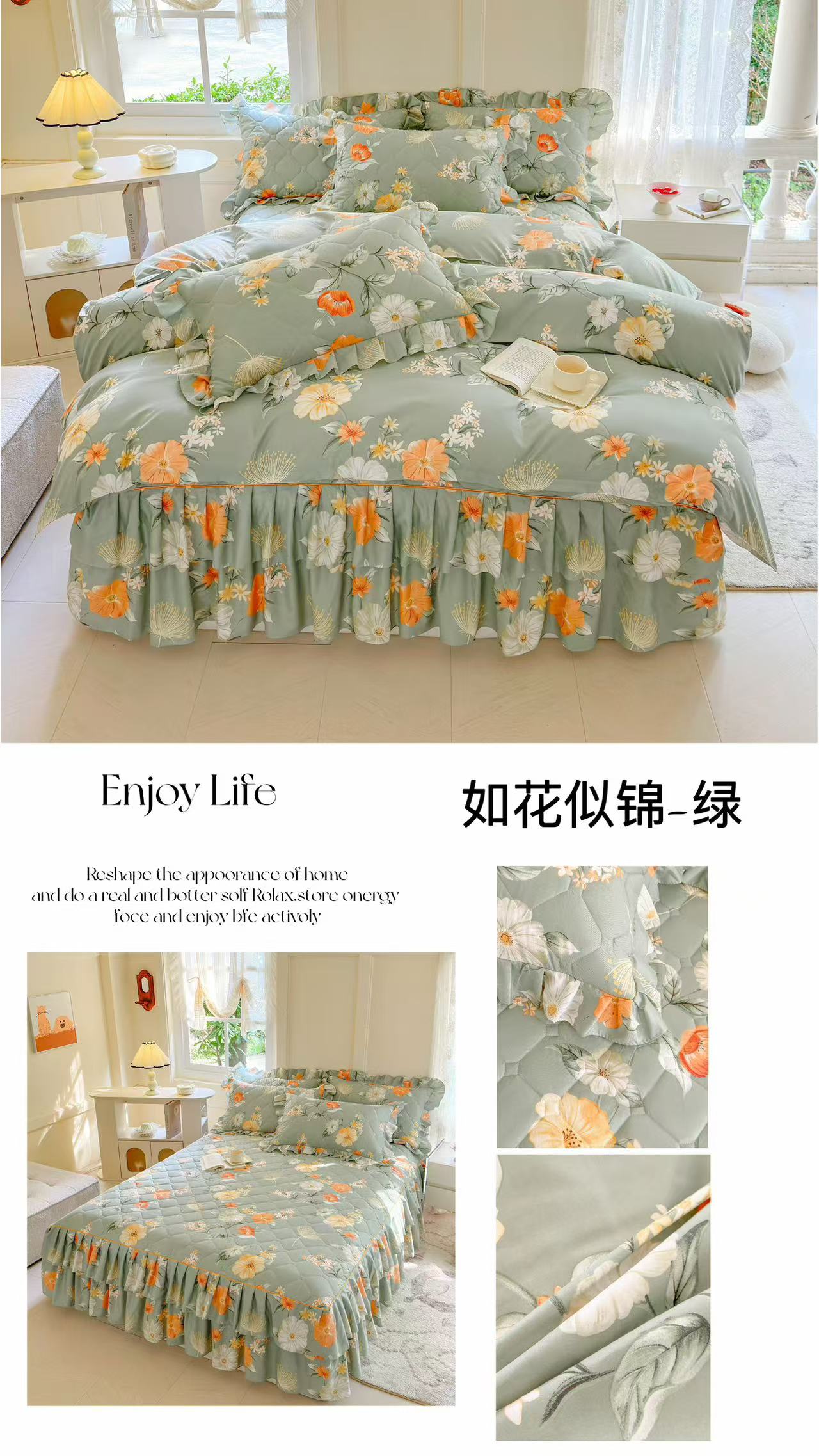 商品名称:2024新款印花夹棉床裙三件套如花似锦-绿