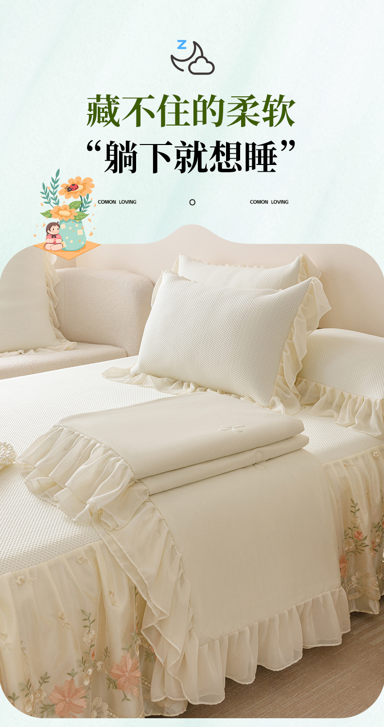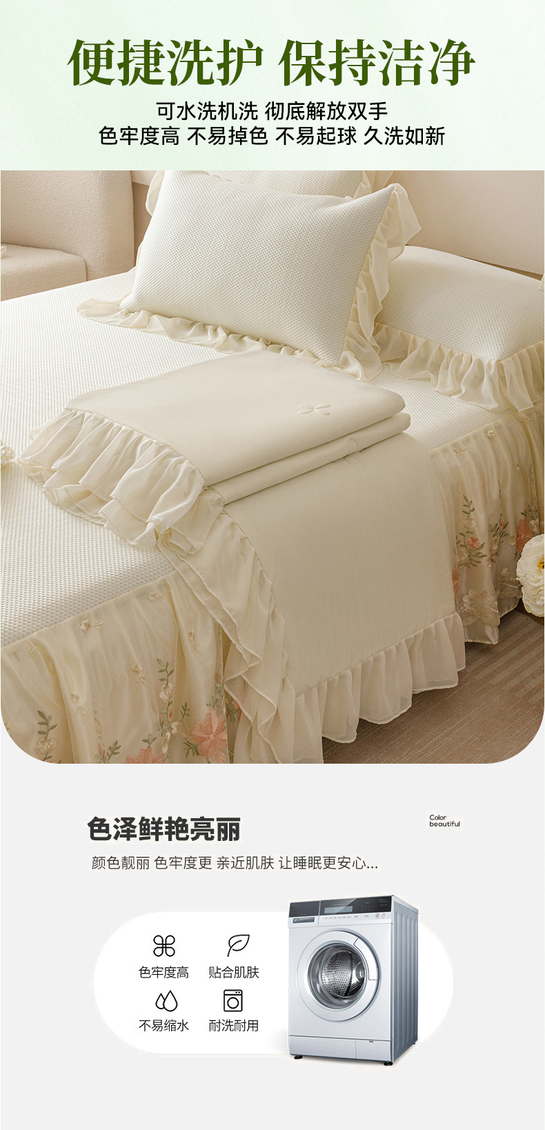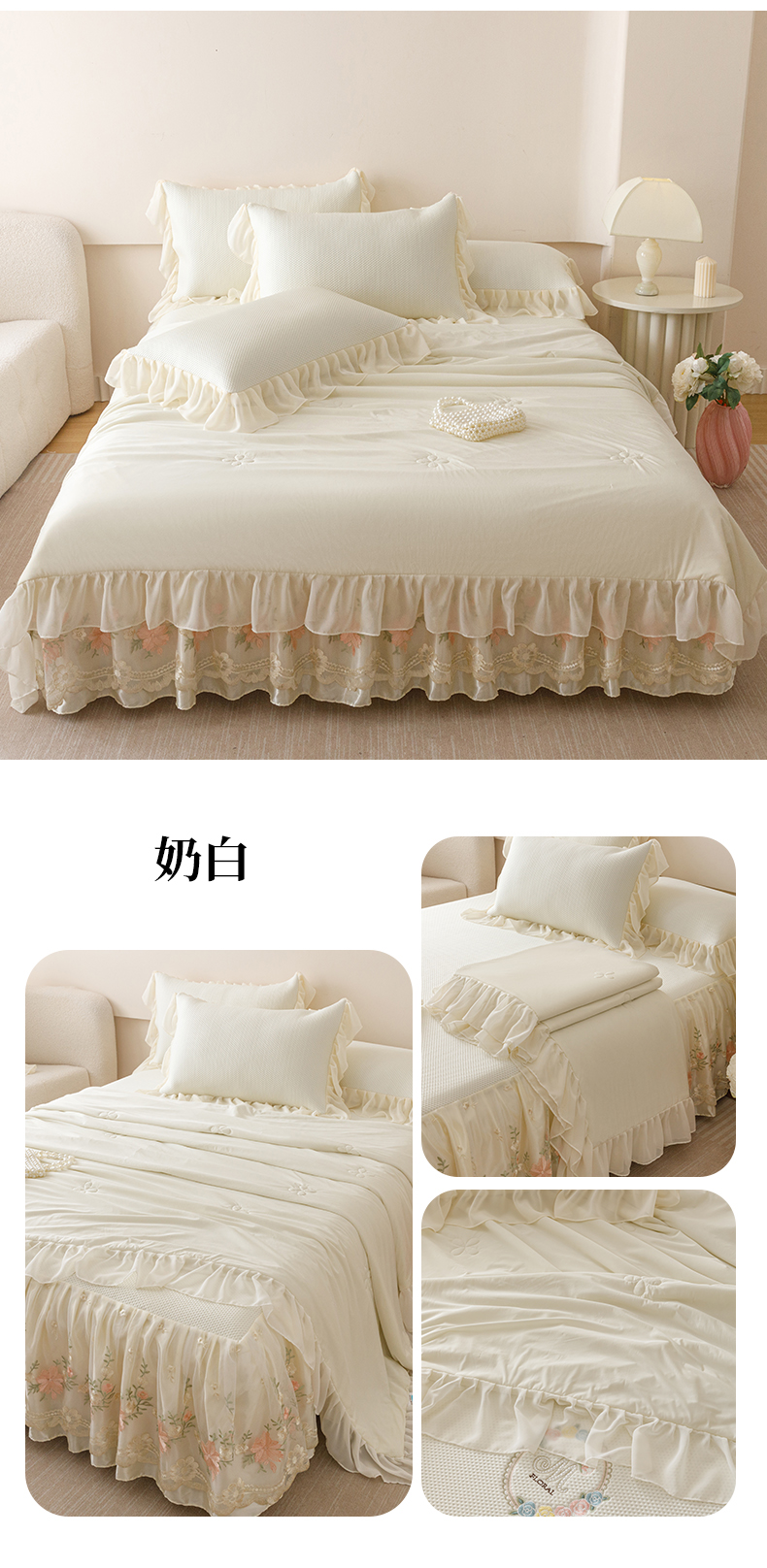 (总)好儿喜家纺 2024新款伊芙琳夏被凉席床裙四件套,浅绿,橄榄绿,奶白,浅粉,浅蓝
