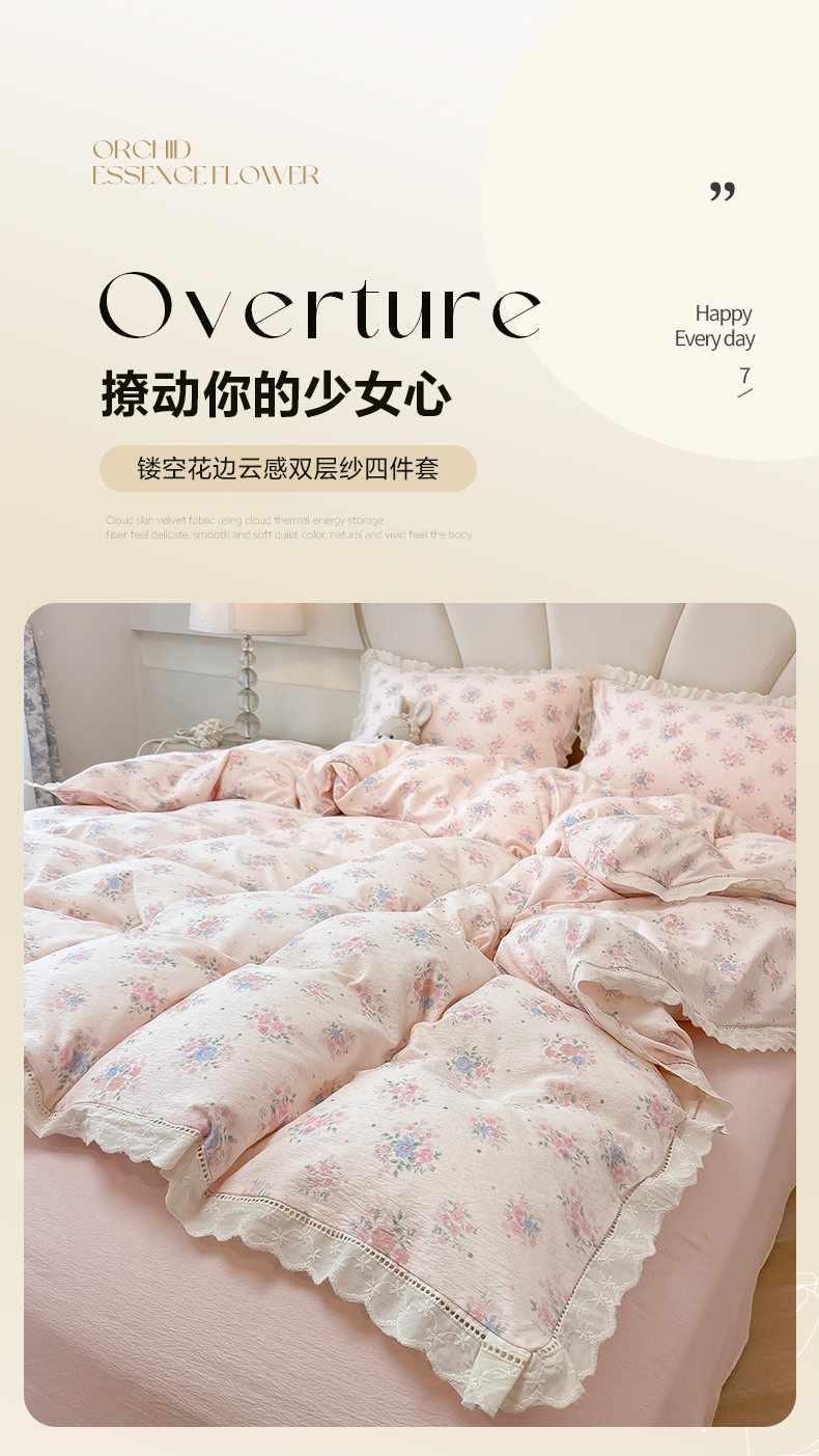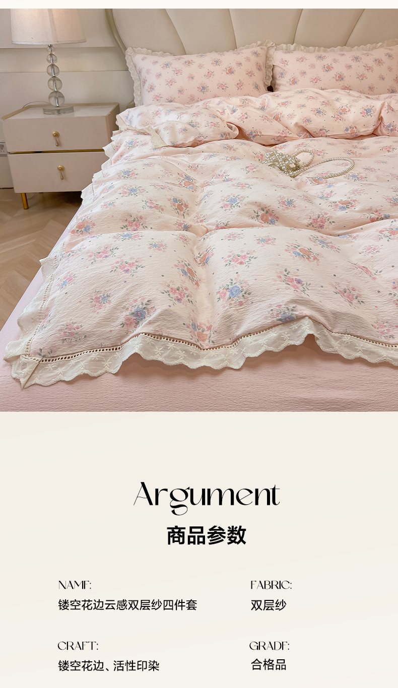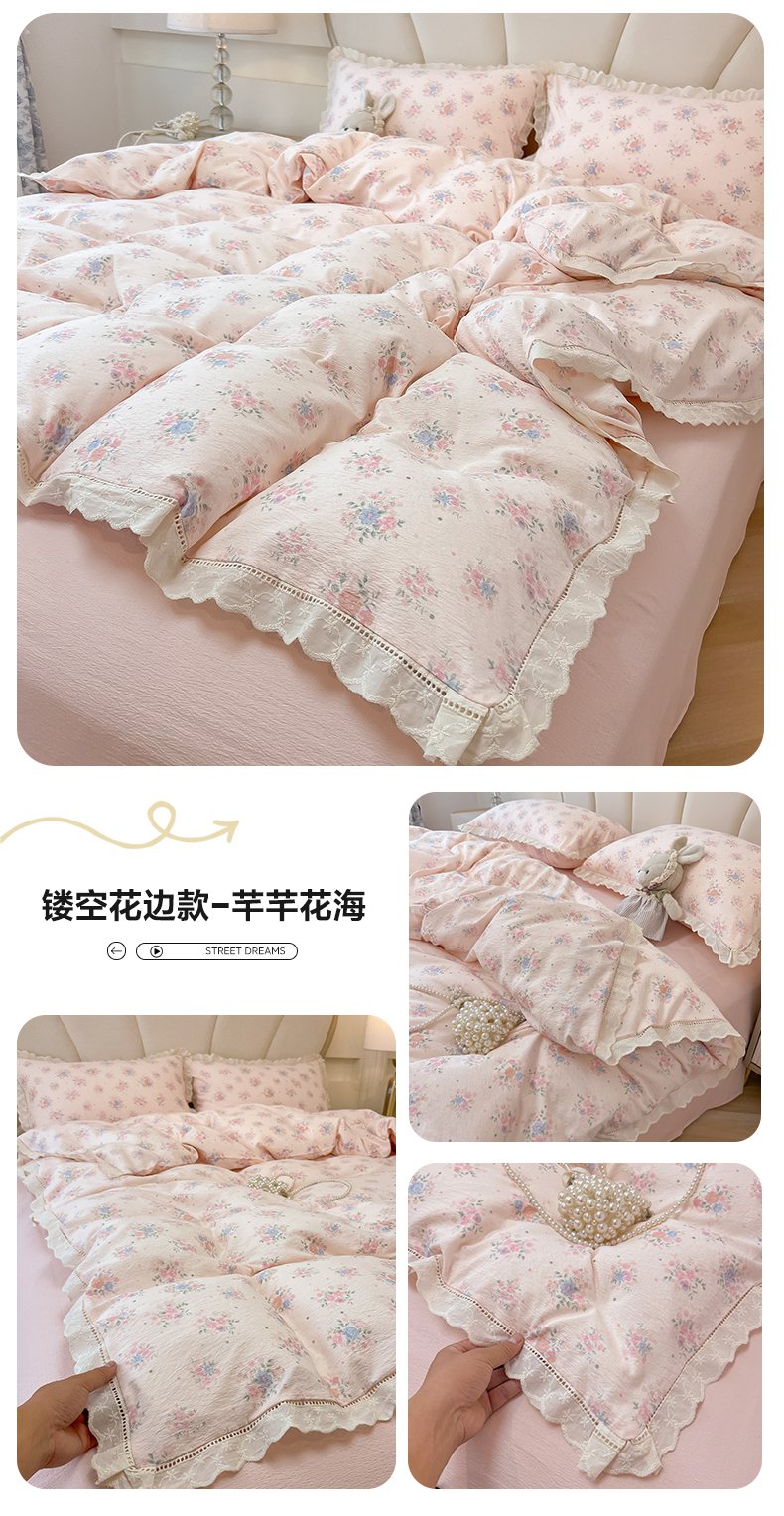 当前位置: 91家纺网 > 商品网购 > 床品套件 > 四件套 > 其它四件套 > 韩巢家纺 2025新款双层纱镂空花边被套直播热销款四件套(提供卖家秀) 镂空花边款-芊芊花海