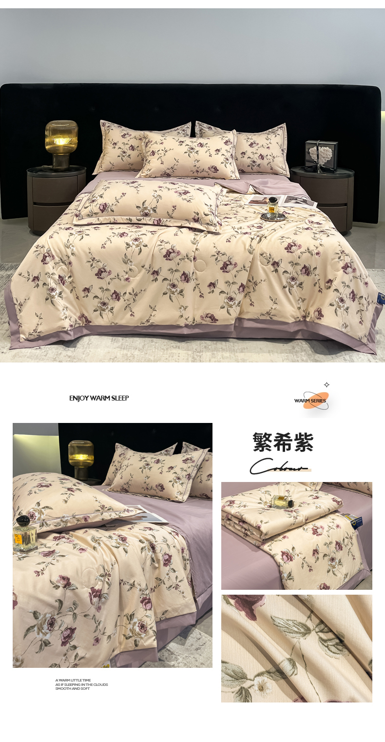 商品名称:金梦拉家纺 2026新款凉感天丝竹节纱大宽边一字绣夏被空调被夏凉被四件套 繁希紫