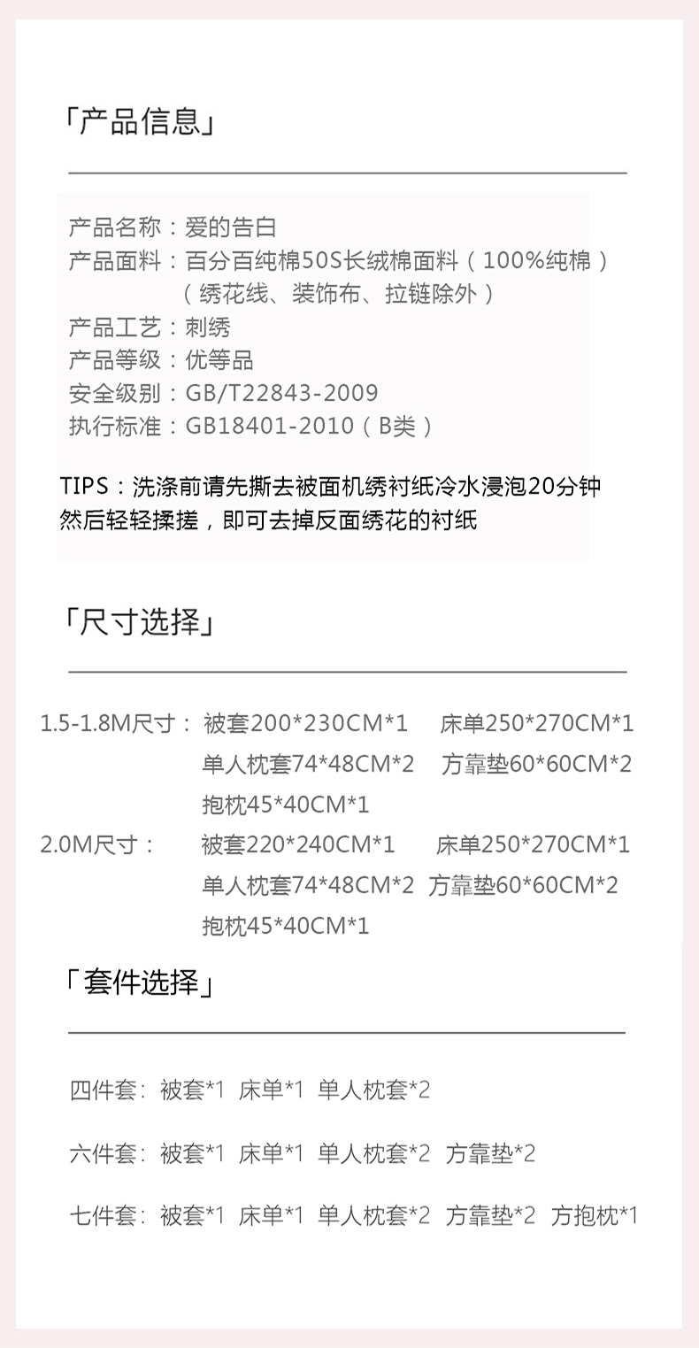 [{"sp_id":11,"sp_name":"\u989c\u8272","sp_format":2,"sp_list":[{"sp_value_id":1663,"sp_value_name":"\u7231\u7684\u544a\u767d","sp_value_image":{"id":999,"path":"https:\/\/img3.91jf.com\/ghelp\/2026\/20260407\/20260407125824_159250.jpg"},"sp_value_video":{"id":0,"img":"","path":"","time":0,"download_num":0,"play_num":0},"price":"220.00","storage":2500,"weight":"3.000","is_check_weight":0,"plus_price":"","sp_sort":0}]},{"sp_id":10,"sp_name":"\u5c3a\u5bf8","sp_format":1,"sp_list":[{"sp_value_id":41,"sp_value_name":"1.5m\u5e8a\u5355\u6b3e\u56db\u4ef6\u5957","sp_value_image":{"id":0,"path":""},"sp_value_video":{"id":0,"img":"","path":"","time":0,"download_num":0,"play_num":0},"price":"220.00","storage":500,"weight":"3.000","is_check_weight":0,"plus_price":"","sp_sort":5},{"sp_value_id":42,"sp_value_name":"1.8m\u5e8a\u5355\u6b3e\u56db\u4ef6\u5957","sp_value_image":{"id":0,"path":""},"sp_value_video":{"id":0,"img":"","path":"","time":0,"download_num":0,"play_num":0},"price":"220.00","storage":500,"weight":"3.000","is_check_weight":0,"plus_price":"","sp_sort":6},{"sp_value_id":43,"sp_value_name":"2.0m\u5e8a\u5355\u6b3e\u56db\u4ef6\u5957","sp_value_image":{"id":0,"path":""},"sp_value_video":{"id":0,"img":"","path":"","time":0,"download_num":0,"play_num":0},"price":"235.00","storage":500,"weight":"3.000","is_check_weight":0,"plus_price":"","sp_sort":7},{"sp_value_id":44,"sp_value_name":"\u65b9\u57ab\u5957\/\u5bf9","sp_value_image":{"id":0,"path":""},"sp_value_video":{"id":0,"img":"","path":"","time":0,"download_num":0,"play_num":0},"price":"45.00","storage":500,"weight":"0.500","is_check_weight":0,"plus_price":"","sp_sort":8},{"sp_value_id":45,"sp_value_name":"\u5c0f\u62b1\u6795\/\u53ea","sp_value_image":{"id":0,"path":""},"sp_value_video":{"id":0,"img":"","path":"","time":0,"download_num":0,"play_num":0},"price":"35.00","storage":500,"weight":"0.500","is_check_weight":0,"plus_price":"","sp_sort":9}]}]