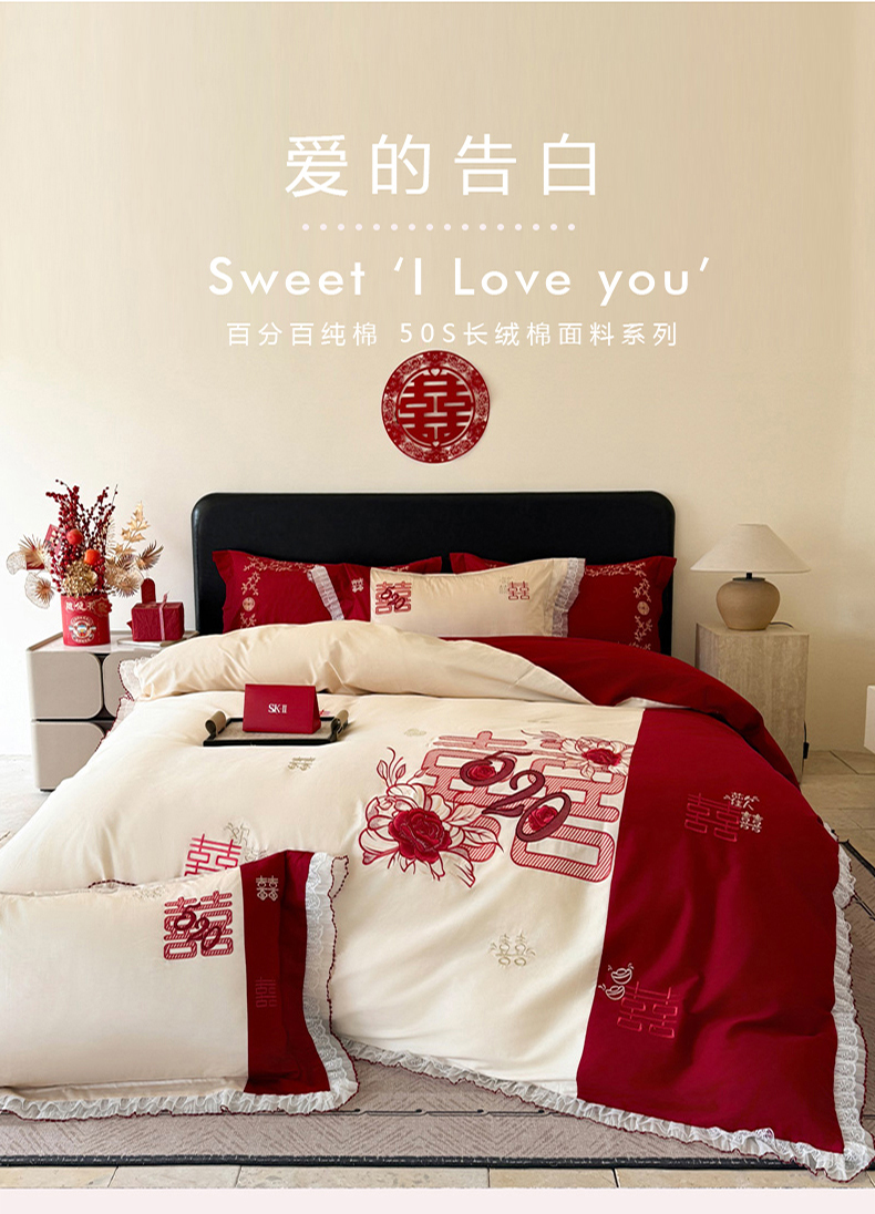 商品名称:甜咪咪婚庆 2026新款长绒棉全棉绣花结婚婚庆四件套多件套床单款 爱的告白