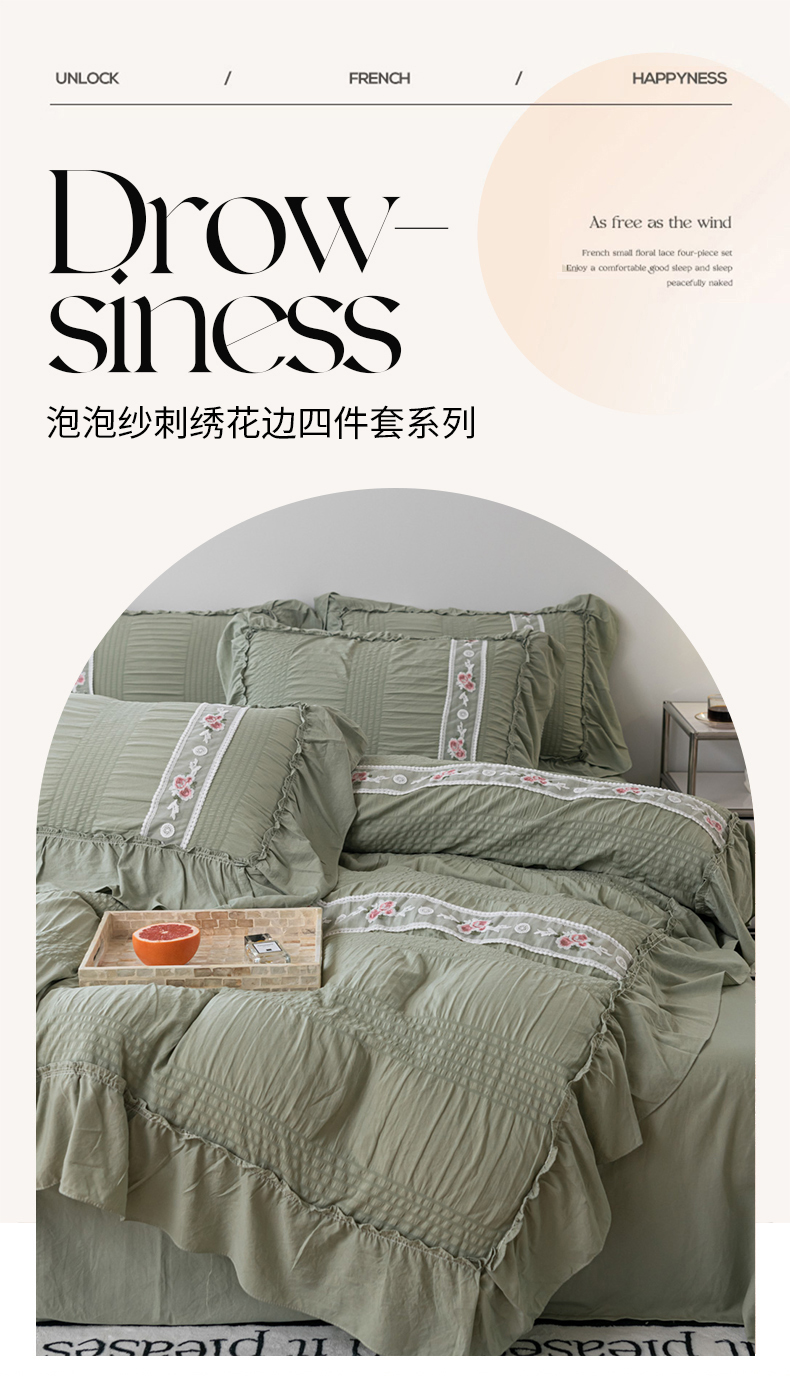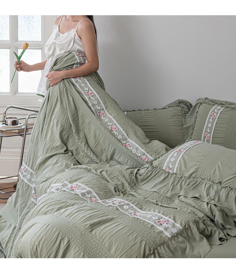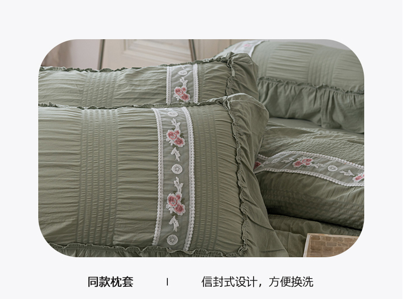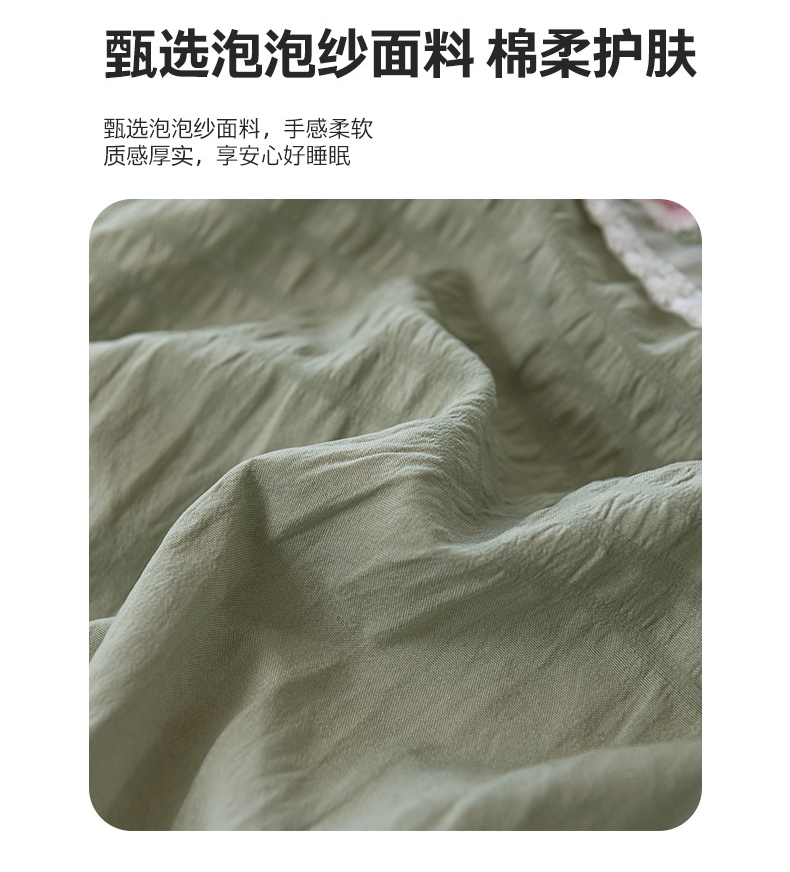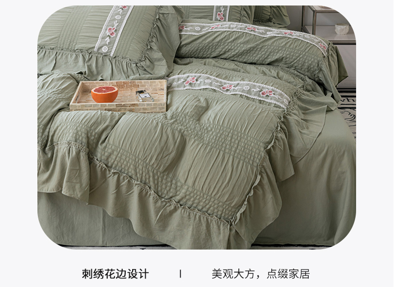 当前位置: 91家纺网 > 商品网购 > 床品套件 > 四件套 > 水洗棉四件套 > 你好美丽 2025新款泡泡纱刺绣花边四件套 泡泡纱-抹茶绿
