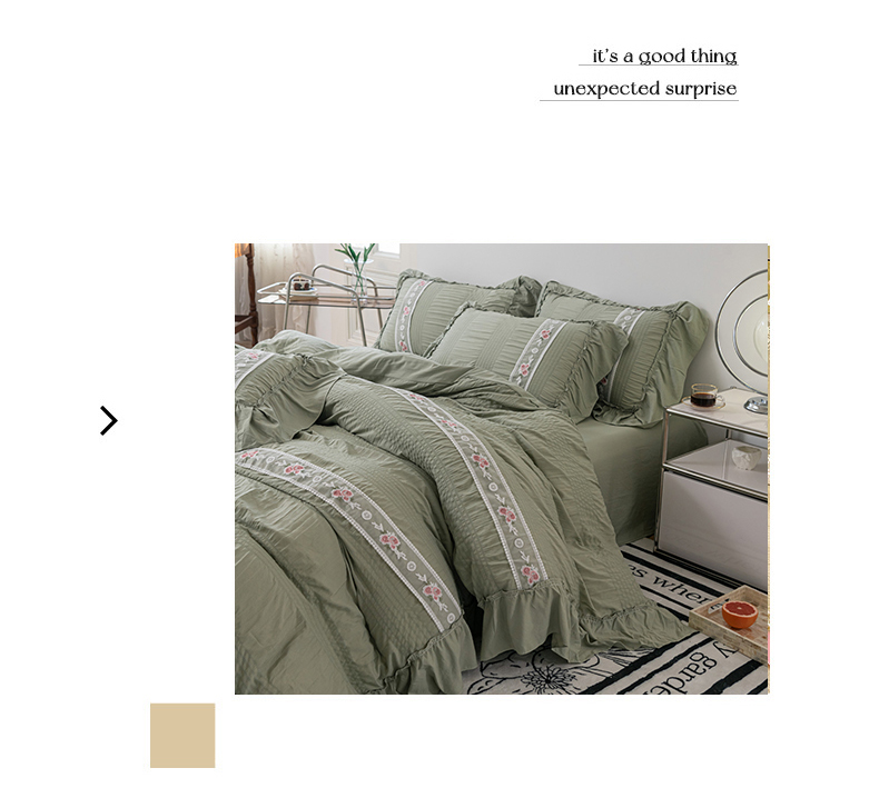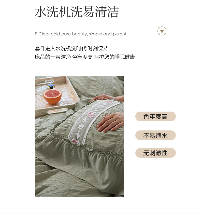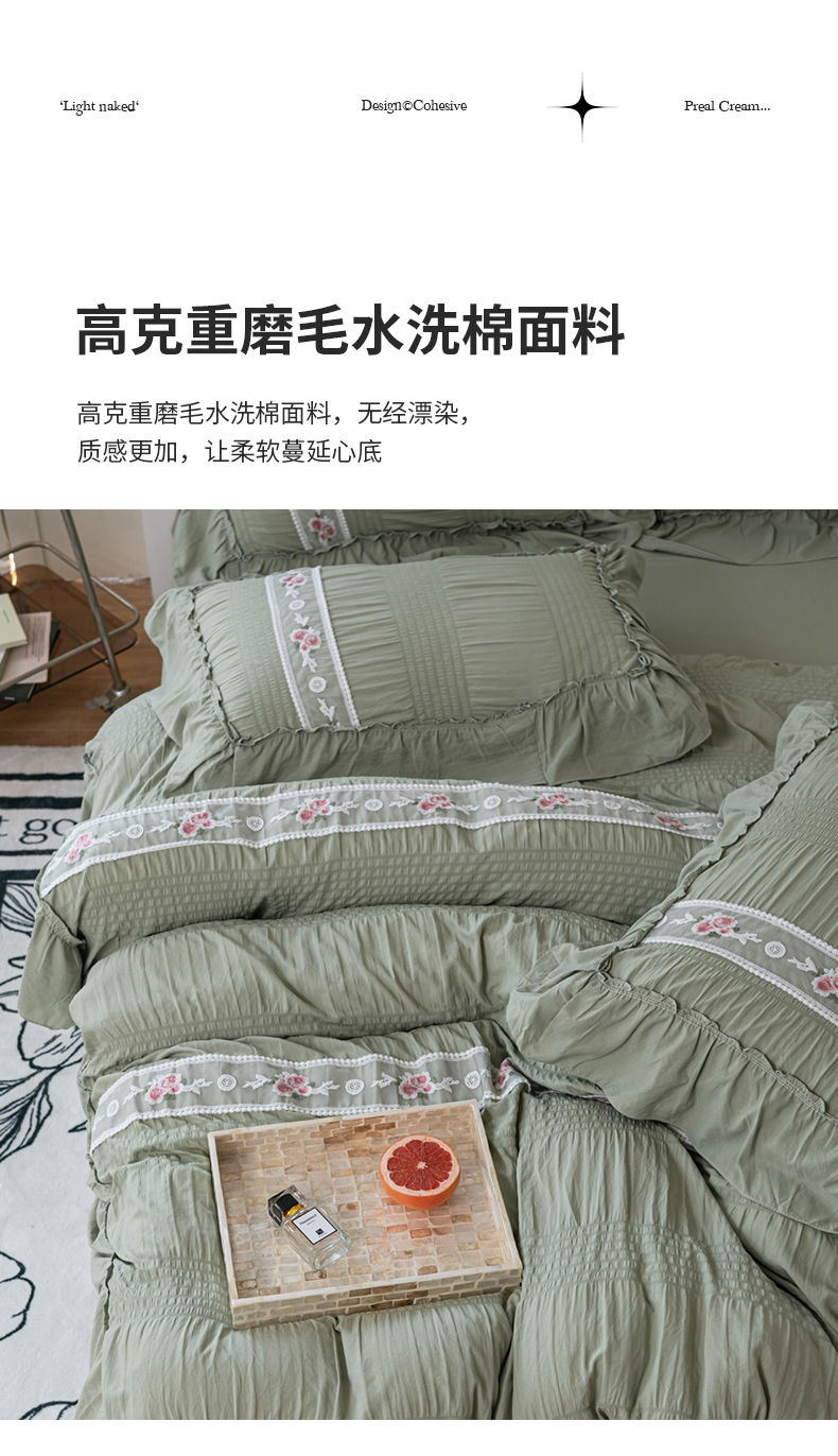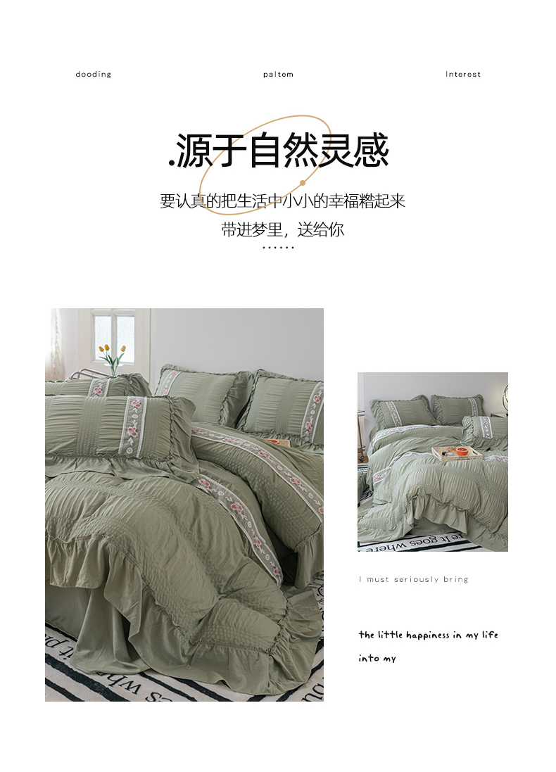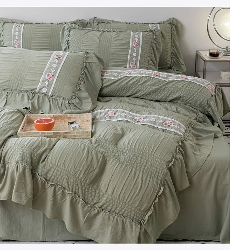 当前位置: 91家纺网 > 商品网购 > 床品套件 > 四件套 > 水洗棉四件套 > 你好美丽 2025新款泡泡纱刺绣花边四件套 泡泡纱-抹茶绿