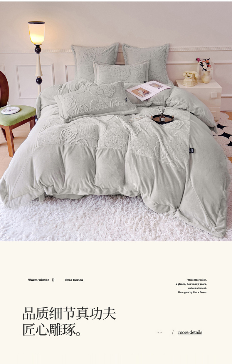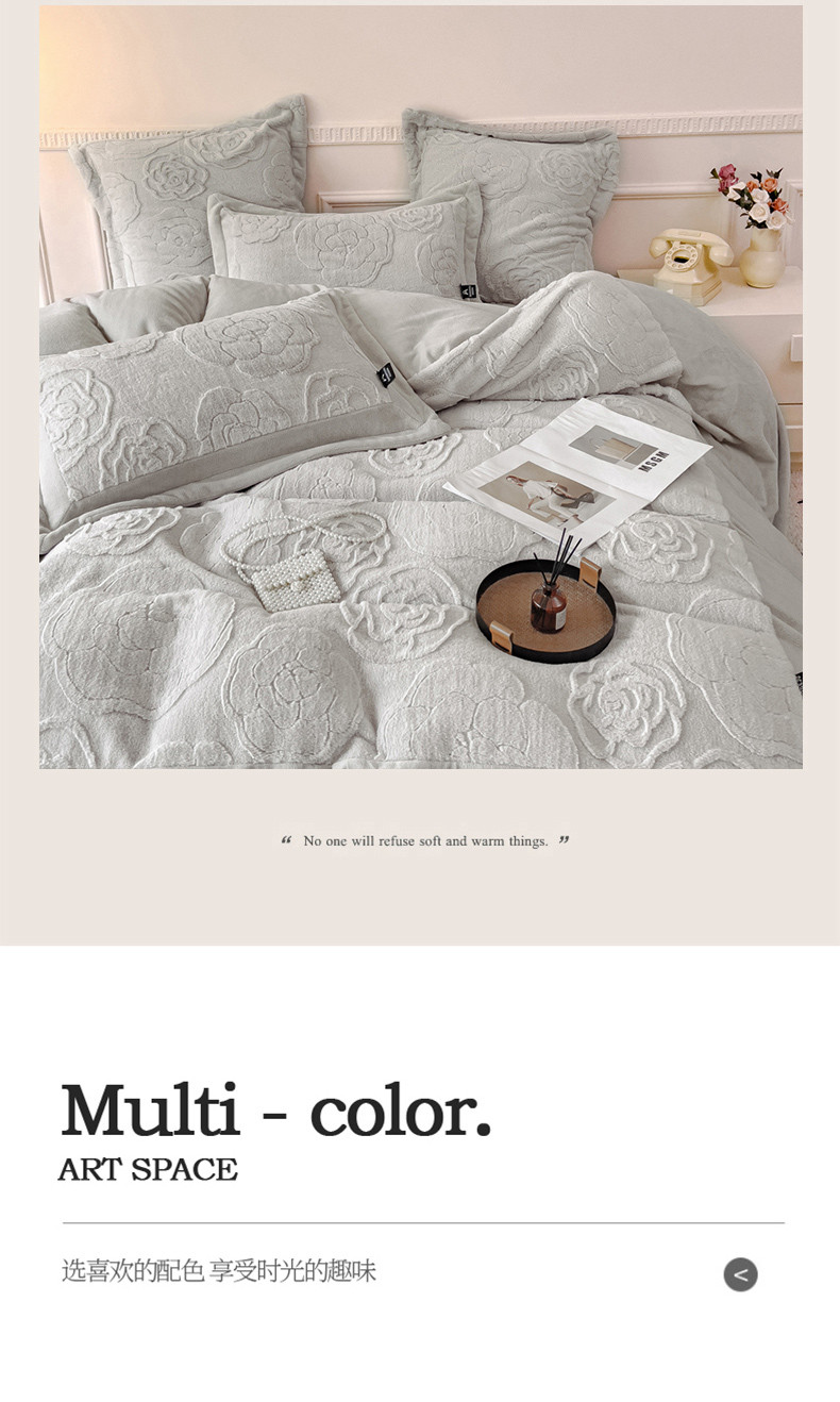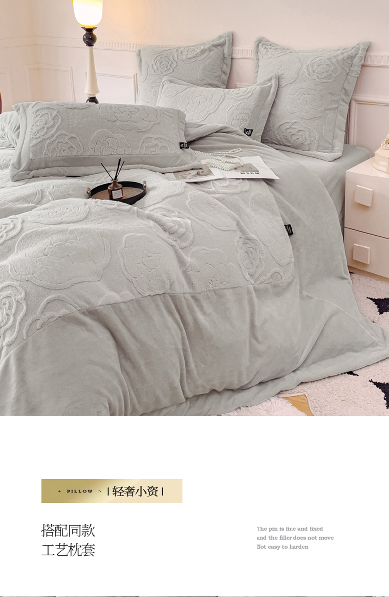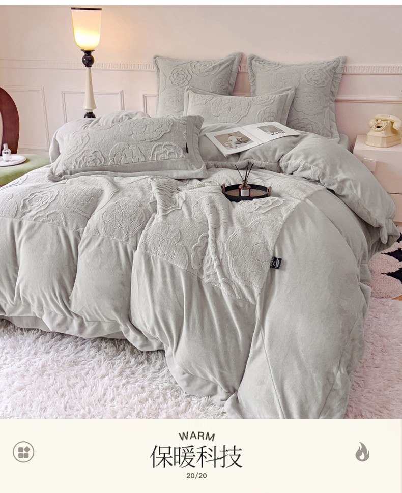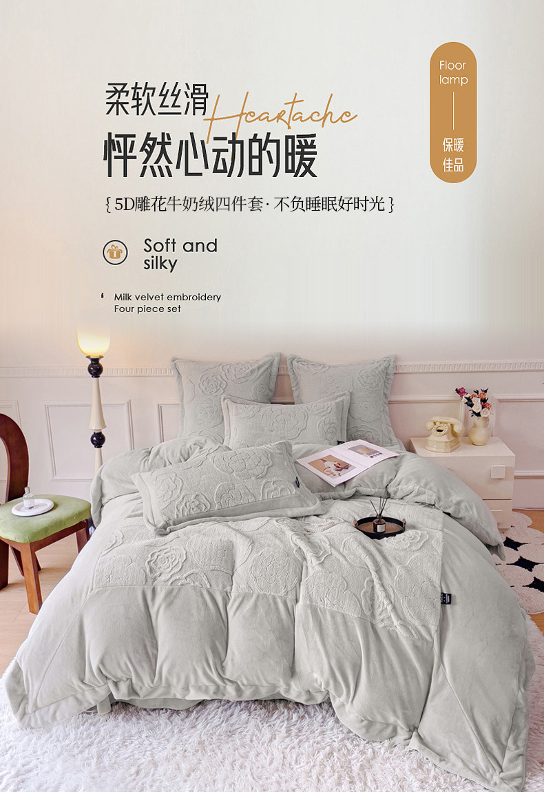 (总) 品家居 2025新款5D雕花牛奶绒四件套-心动玫瑰,粉拼灰,黄拼灰,蓝拼灰