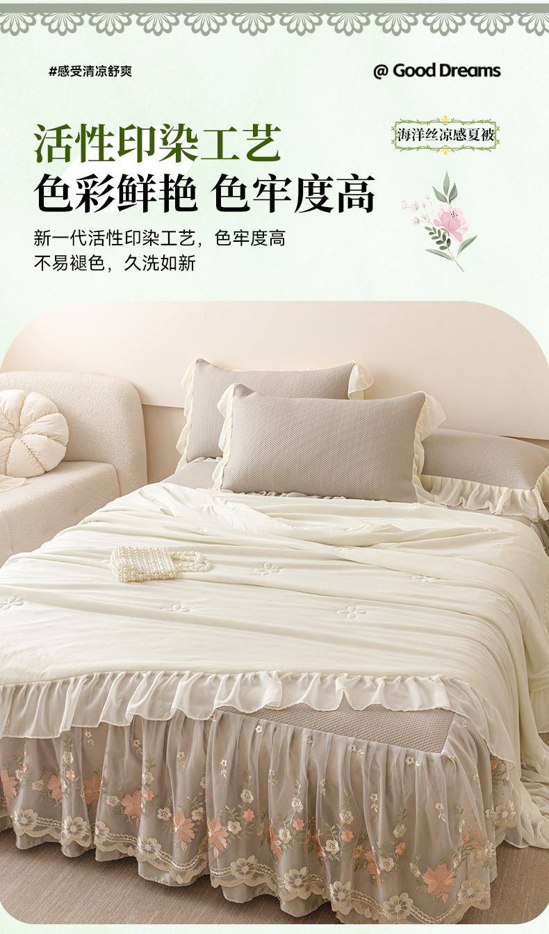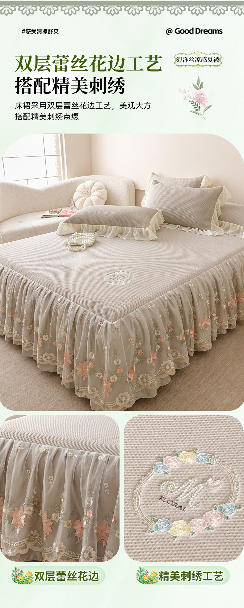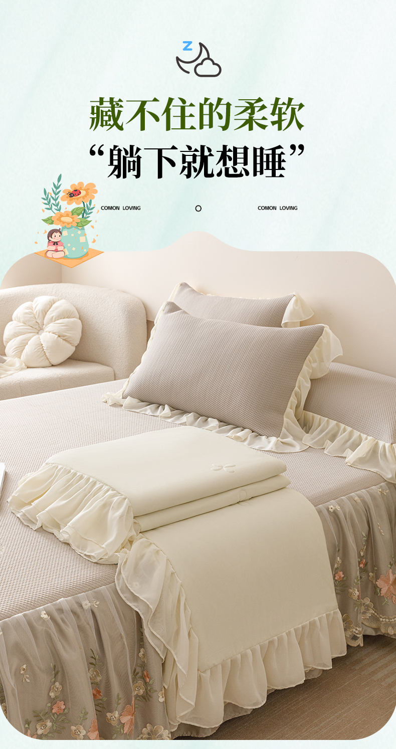 (总)好儿喜家纺 2024新款伊芙琳夏被凉席床裙四件套,浅绿,橄榄绿,奶白,浅粉,浅蓝