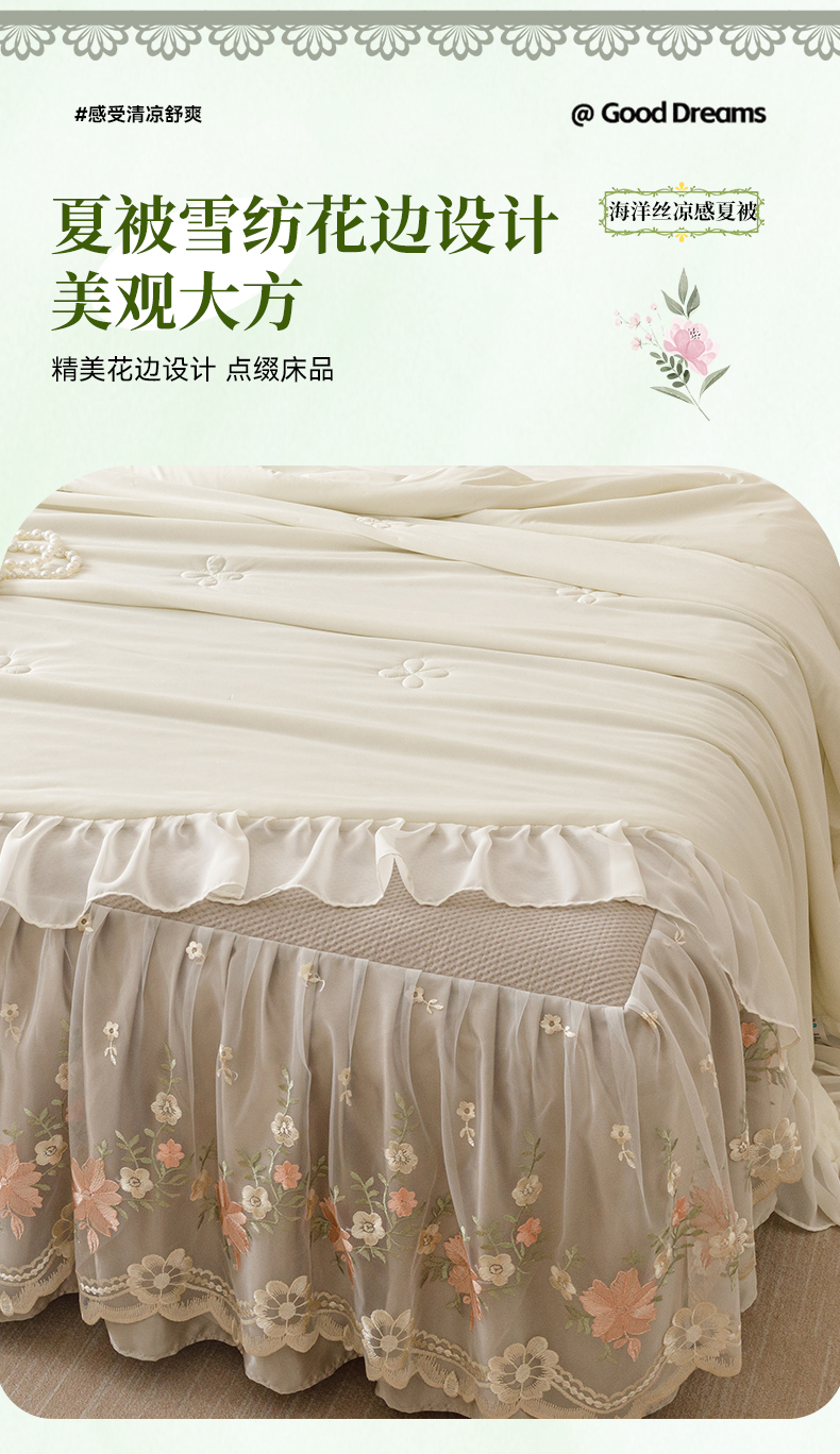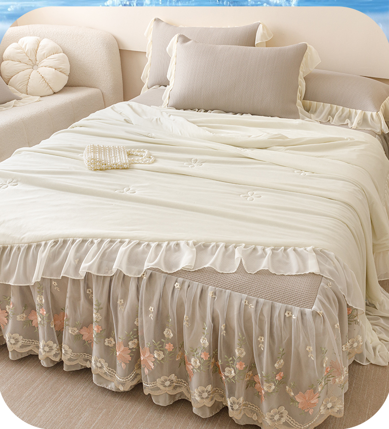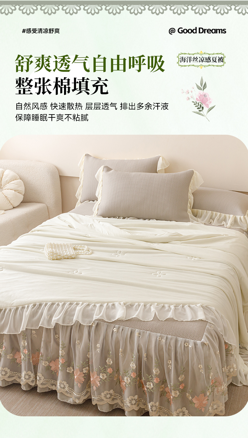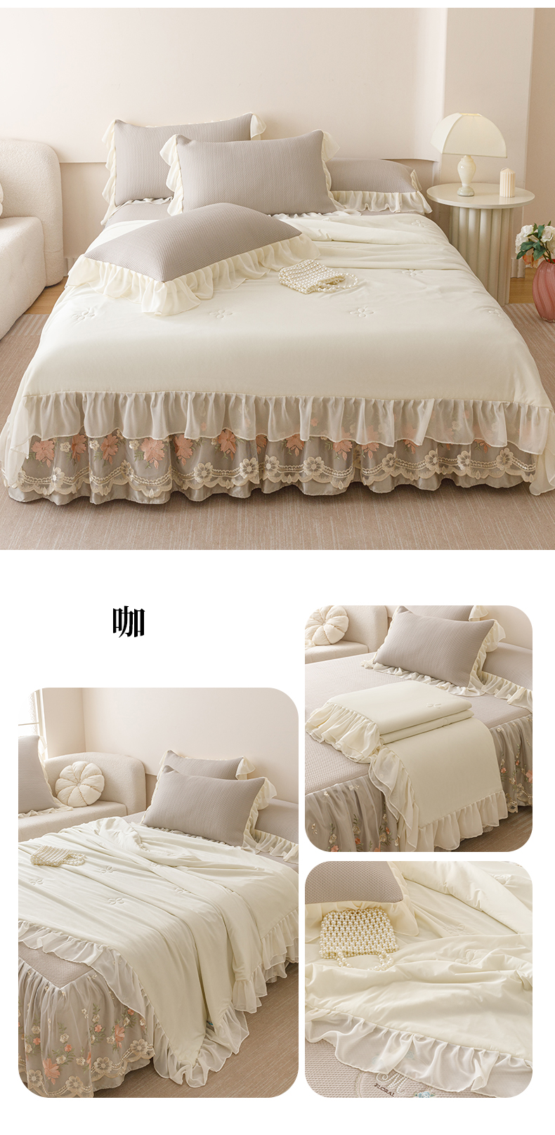 (总)好儿喜家纺 2024新款伊芙琳夏被凉席床裙四件套,浅绿,橄榄绿,奶白,浅粉,浅蓝