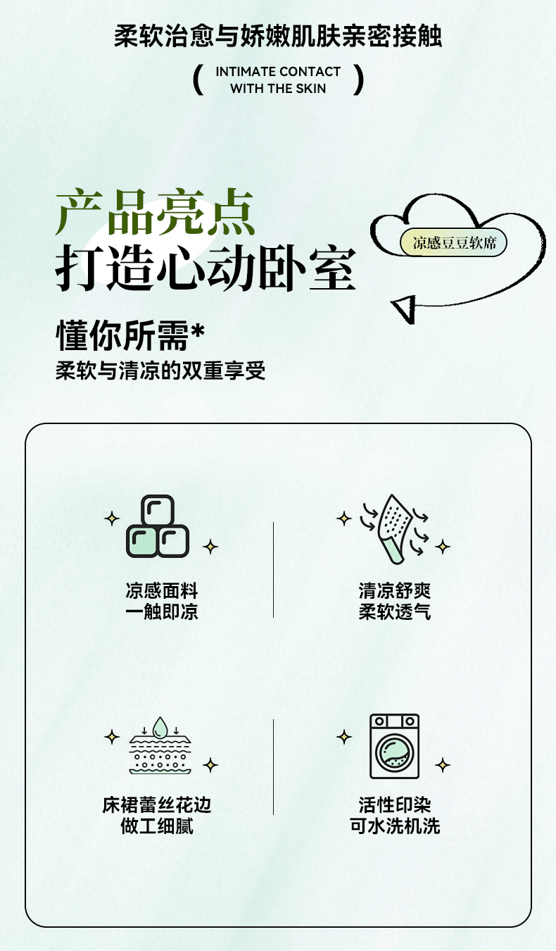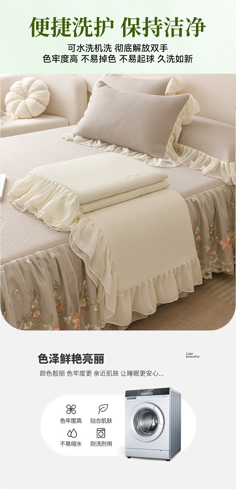 (总)好儿喜家纺 2024新款伊芙琳凉席床裙三件套,浅绿,橄榄绿,奶白,浅粉,浅蓝