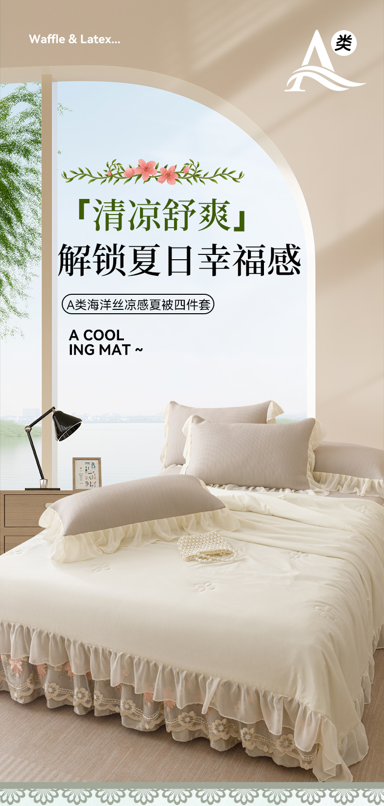 (总)好儿喜家纺 2024新款A类海洋丝奥德利夏被凉席四件套,橄榄绿,奶白,浅粉,浅蓝,浅绿
