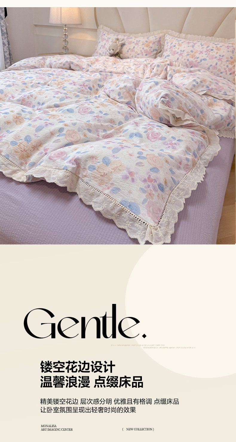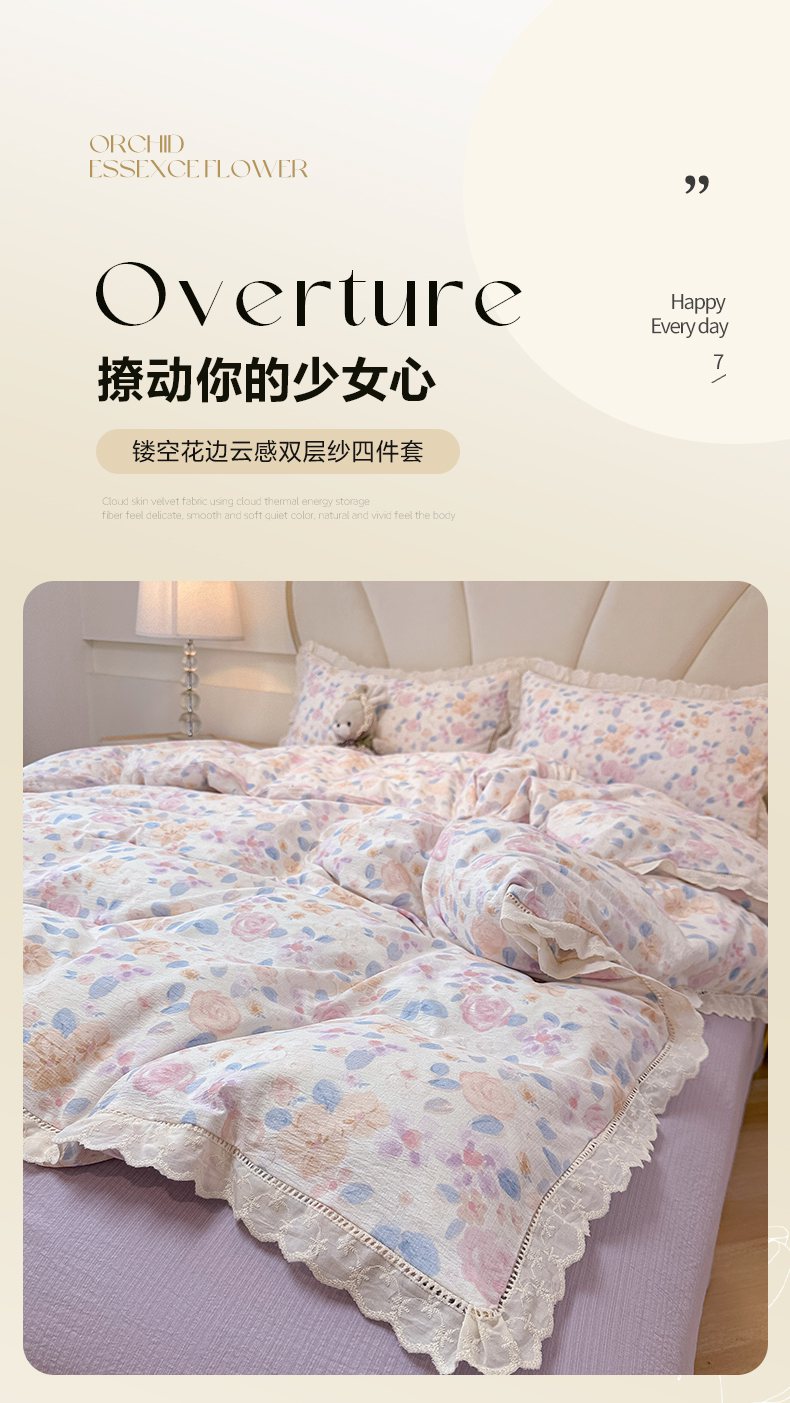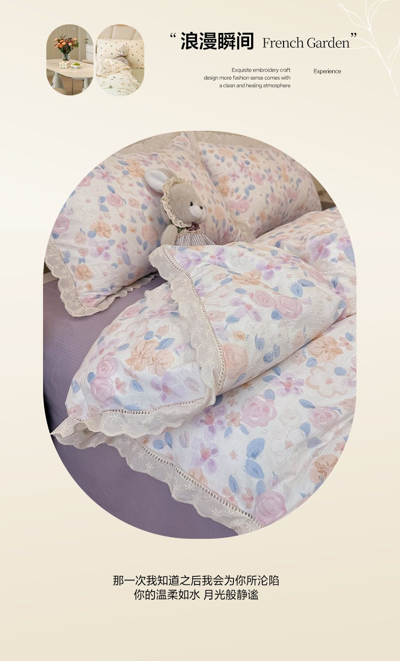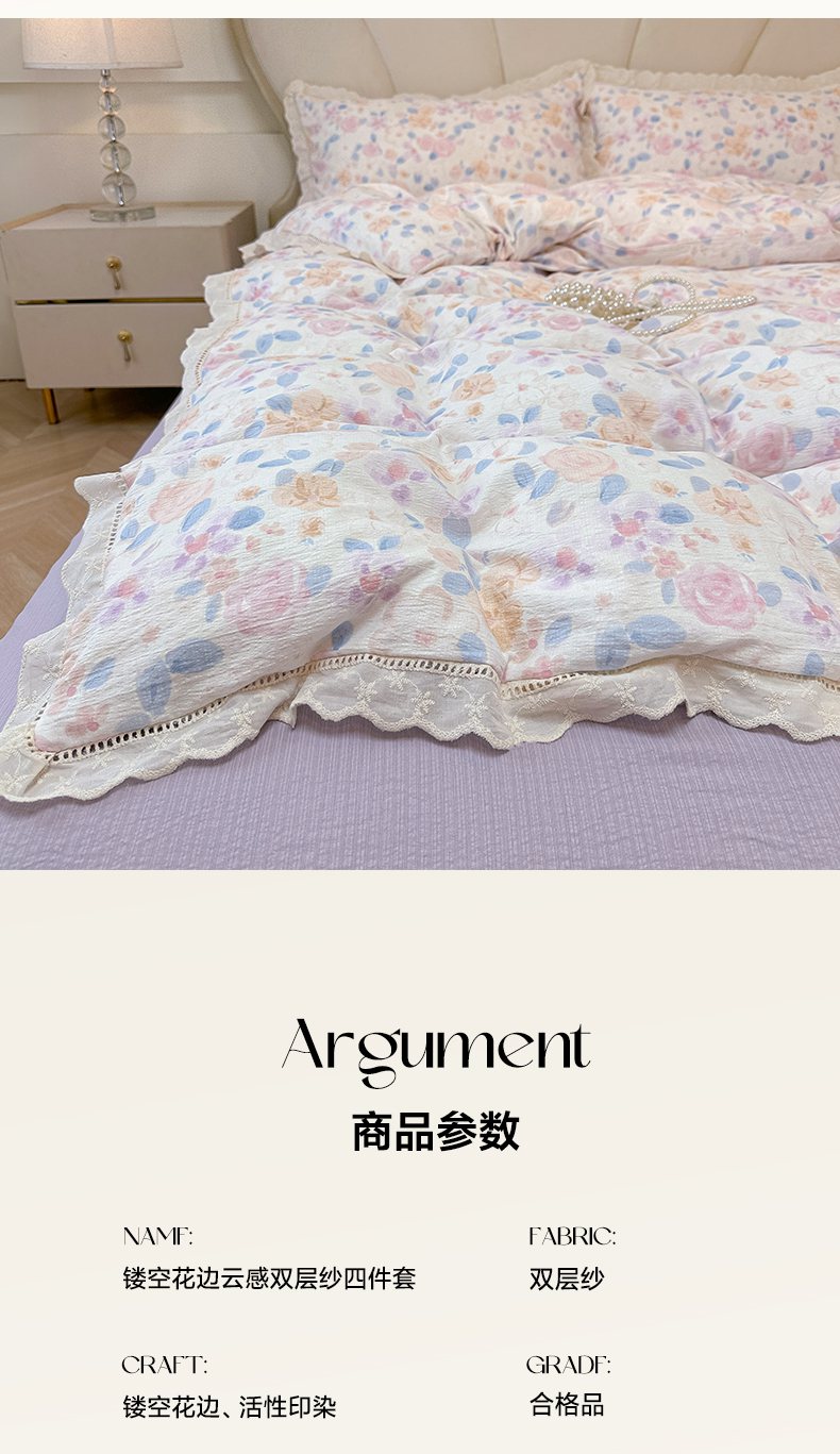 当前位置: 91家纺网 > 商品网购 > 床品套件 > 四件套 > 其它四件套 > 韩巢家纺 2025新款双层纱镂空花边被套直播热销款四件套(提供卖家秀) 镂空花边款-时间画报-米