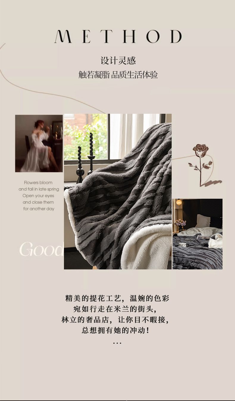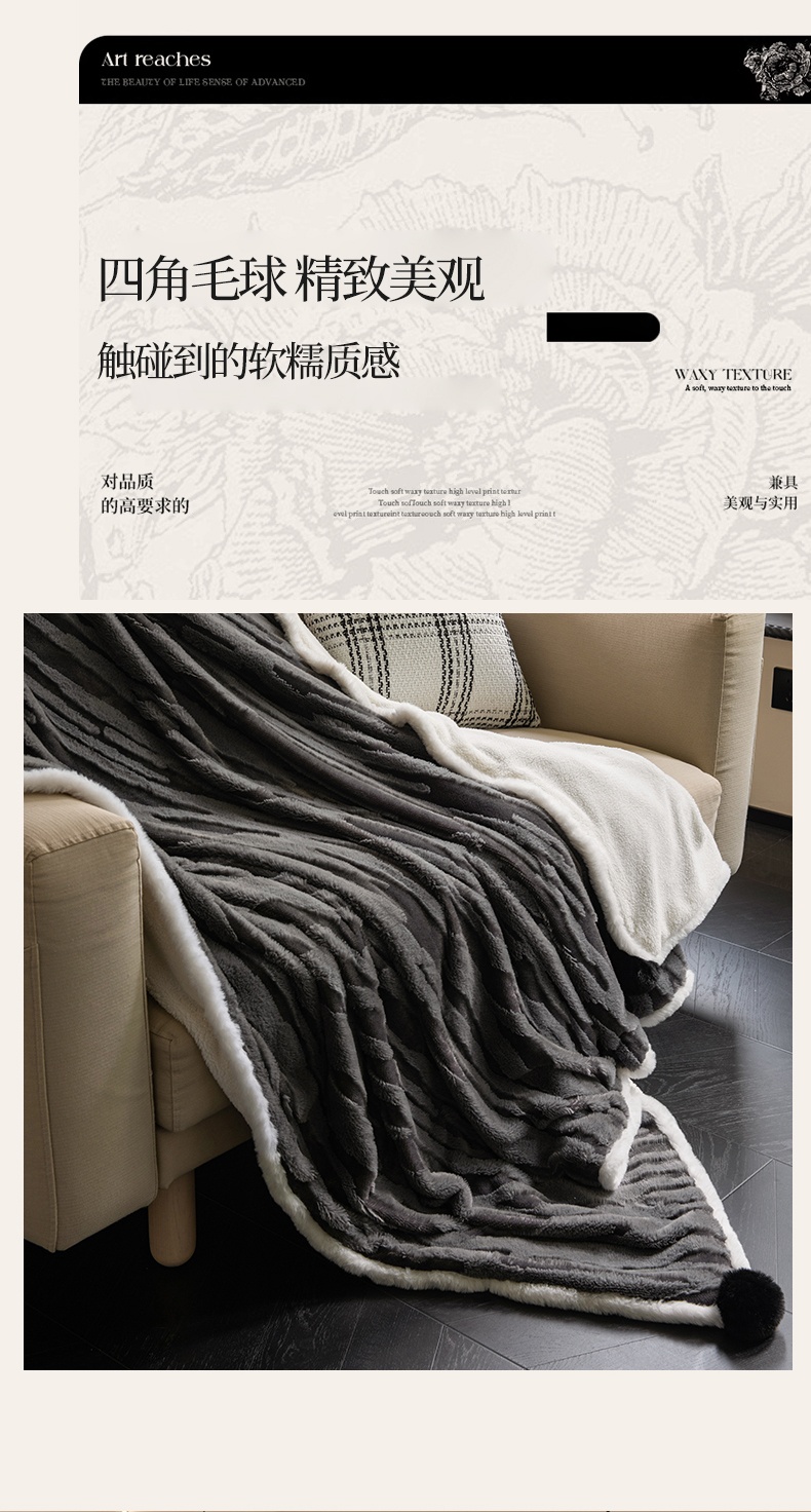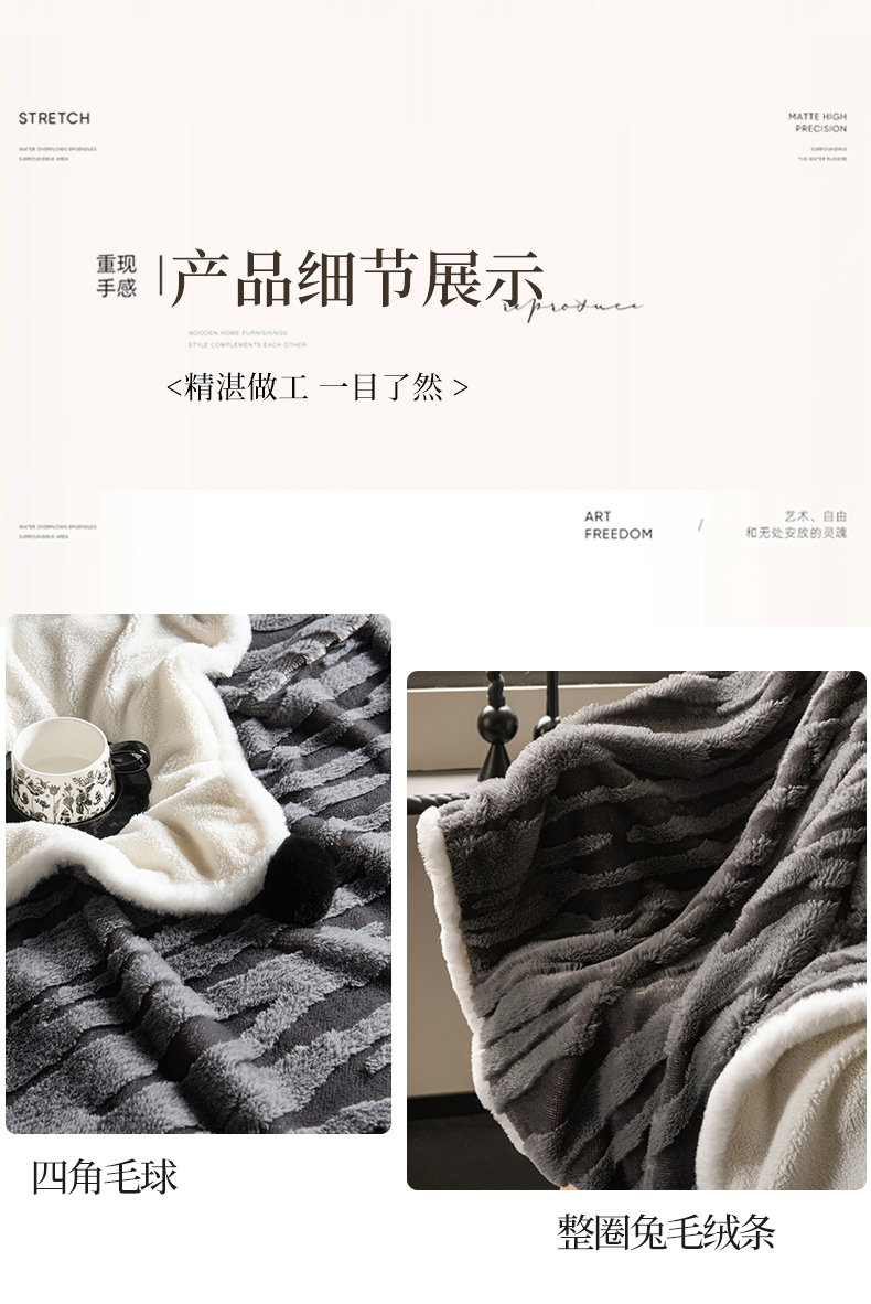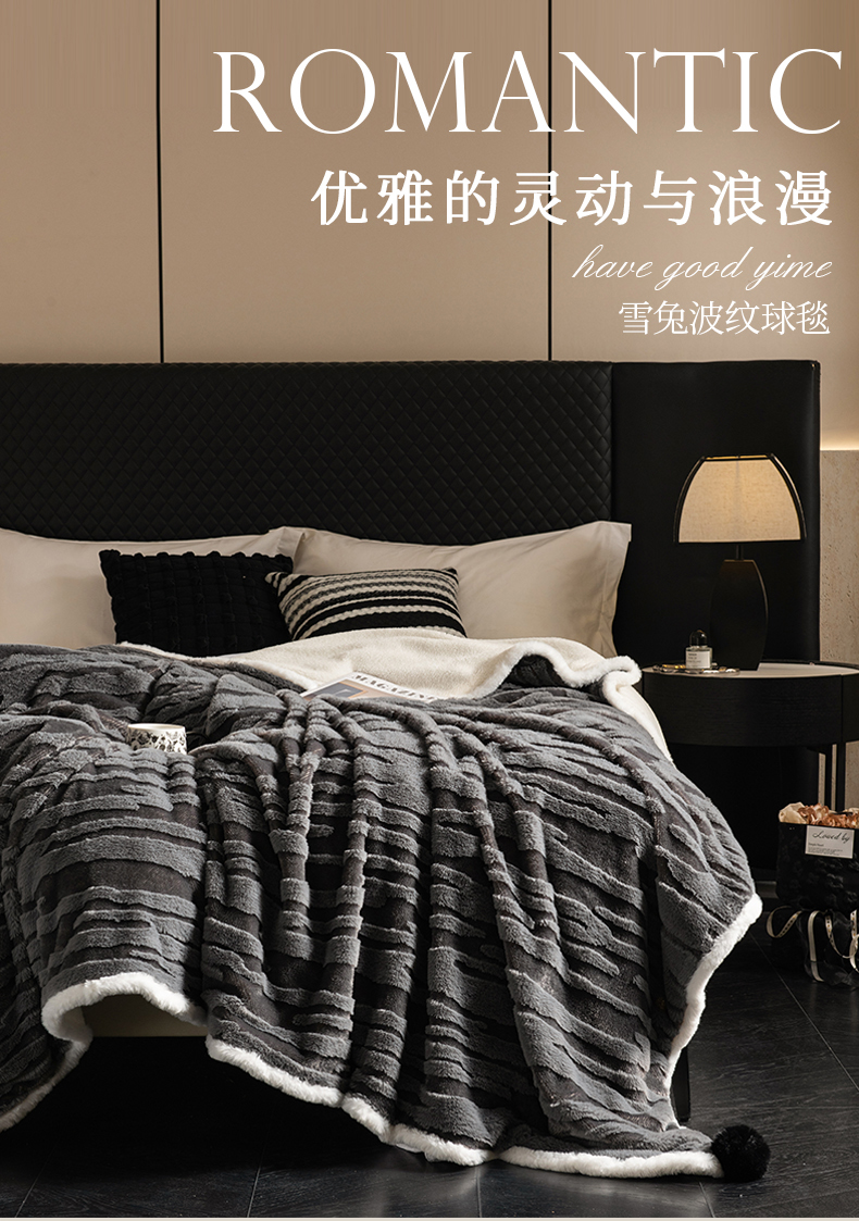 潮邦创意家居 2025全新升级阳离子提花兔毛球毯毯子-雪兔波纹系列轻奢风格图 雪兔波纹-墨分灰