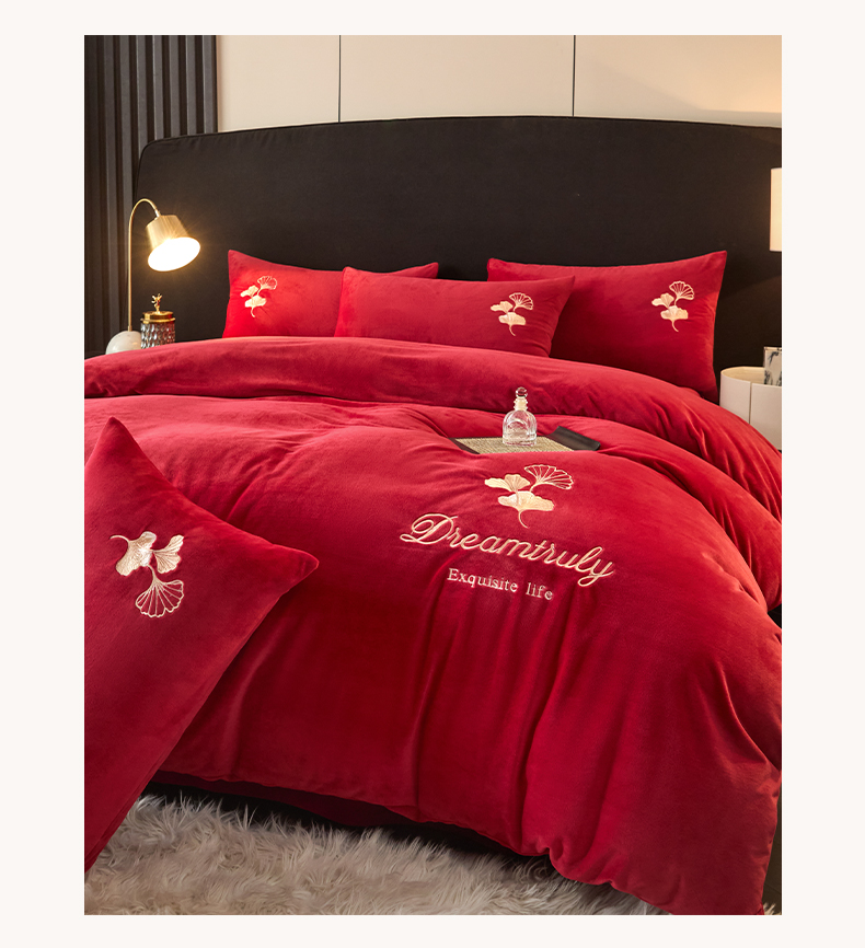 如一 2025新款水晶绒纯色刺绣四件套-银杏系列 银杏-中国红