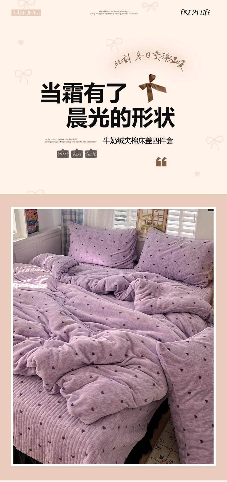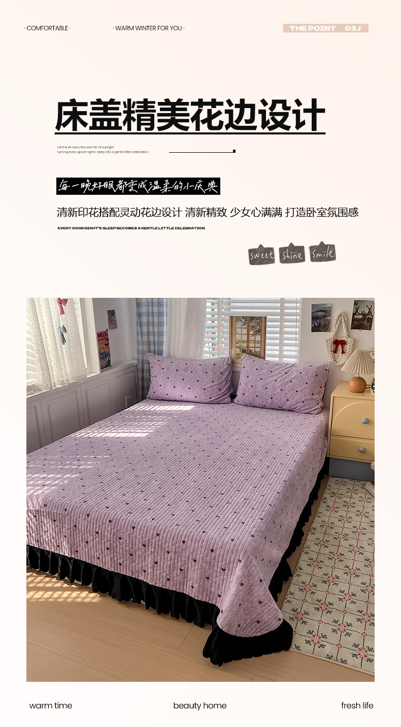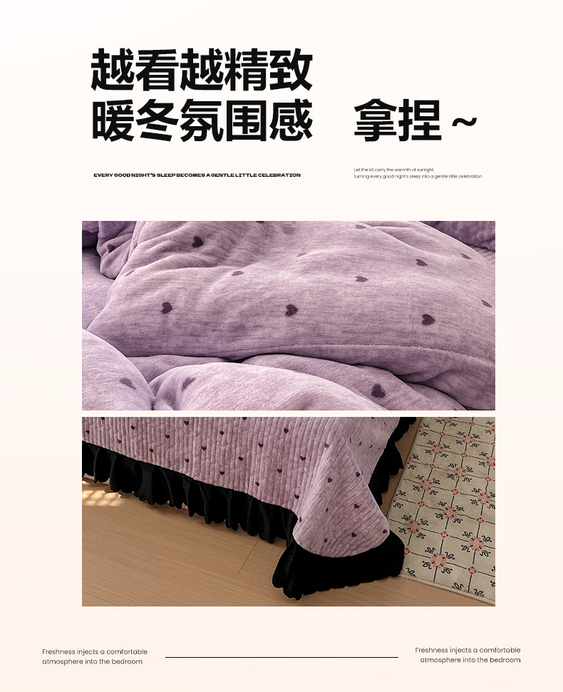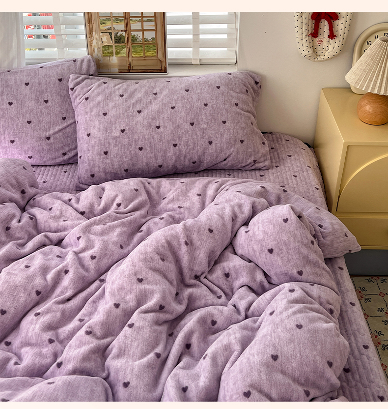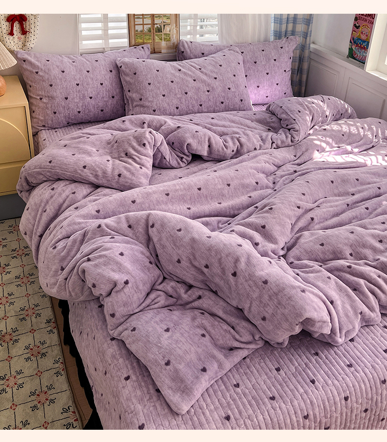 当前位置: 91家纺网 > 商品网购 > 床品套件 > 四件套 > 其它四件套 > 逸林家纺《原希尔顿逸林》 2025新款牛奶绒床盖四件套加厚印花法式赫本风花边床盖四件套 床盖款-紫色小心心