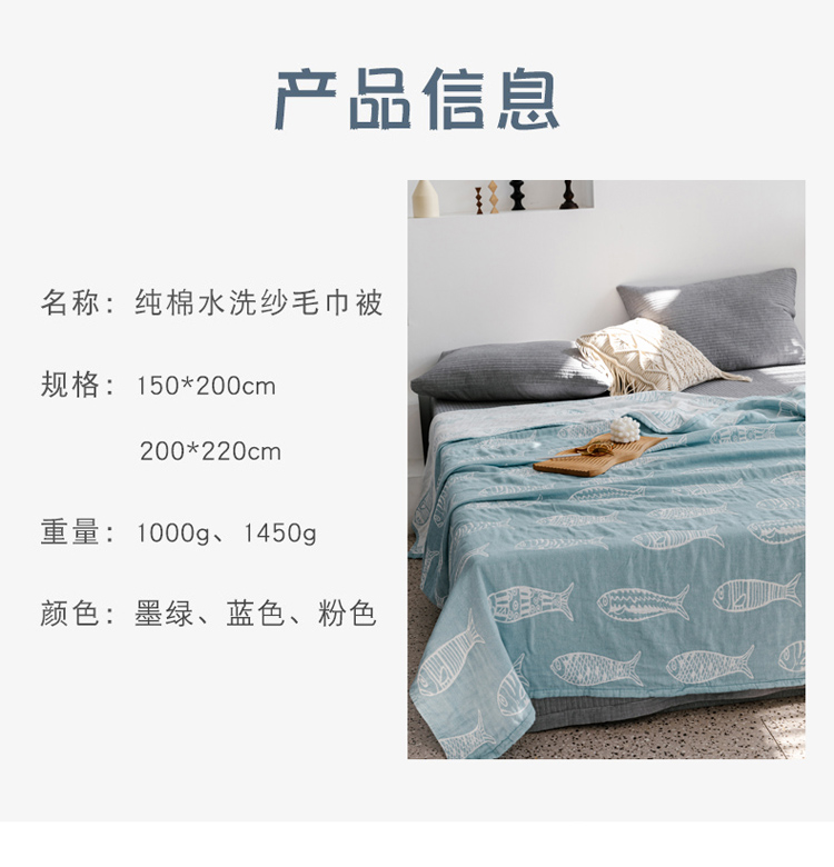 商品名称:朴尔 2020年新款加厚三层水洗棉全棉纱布毛巾被 复古鱼-兰