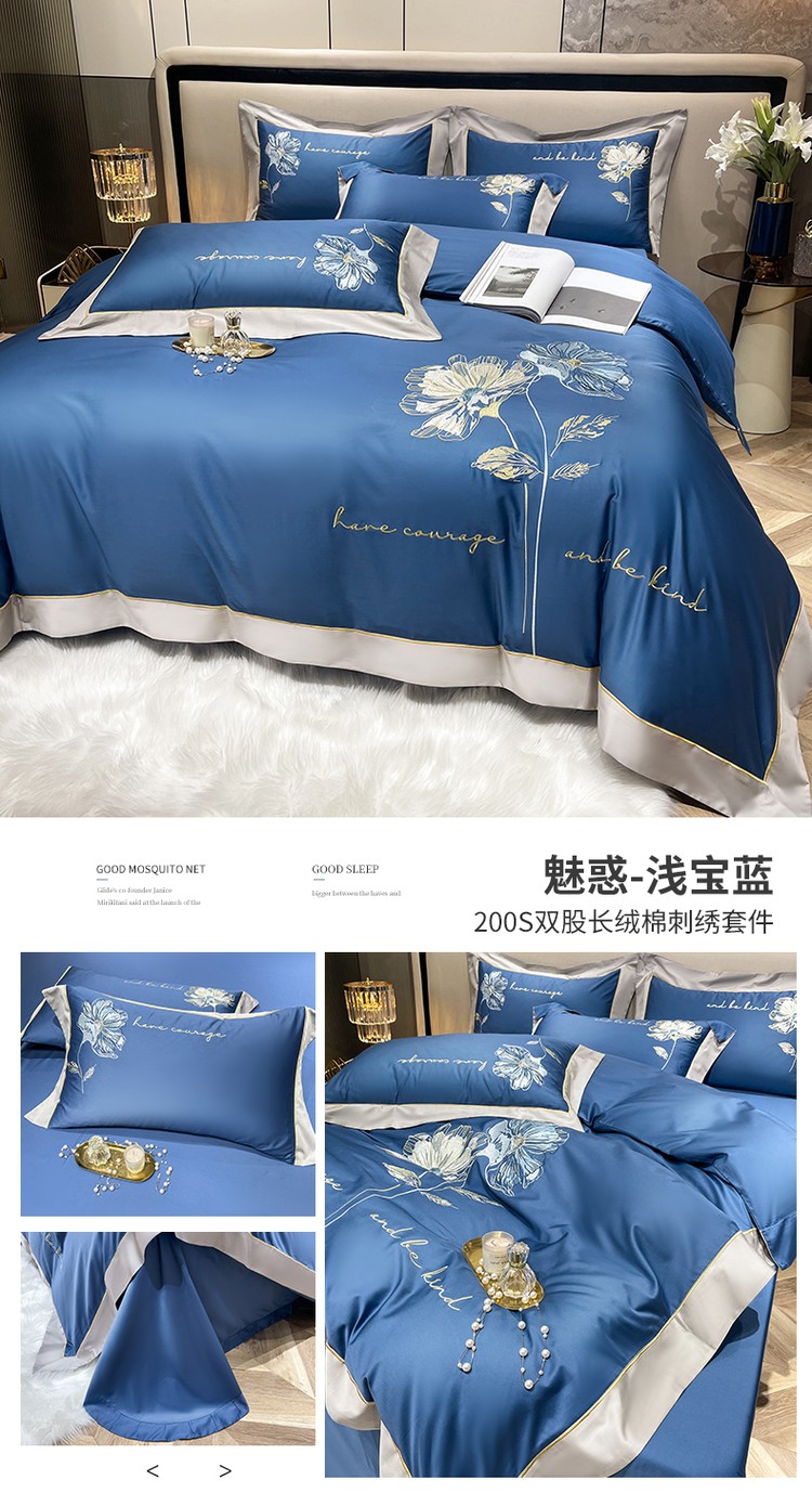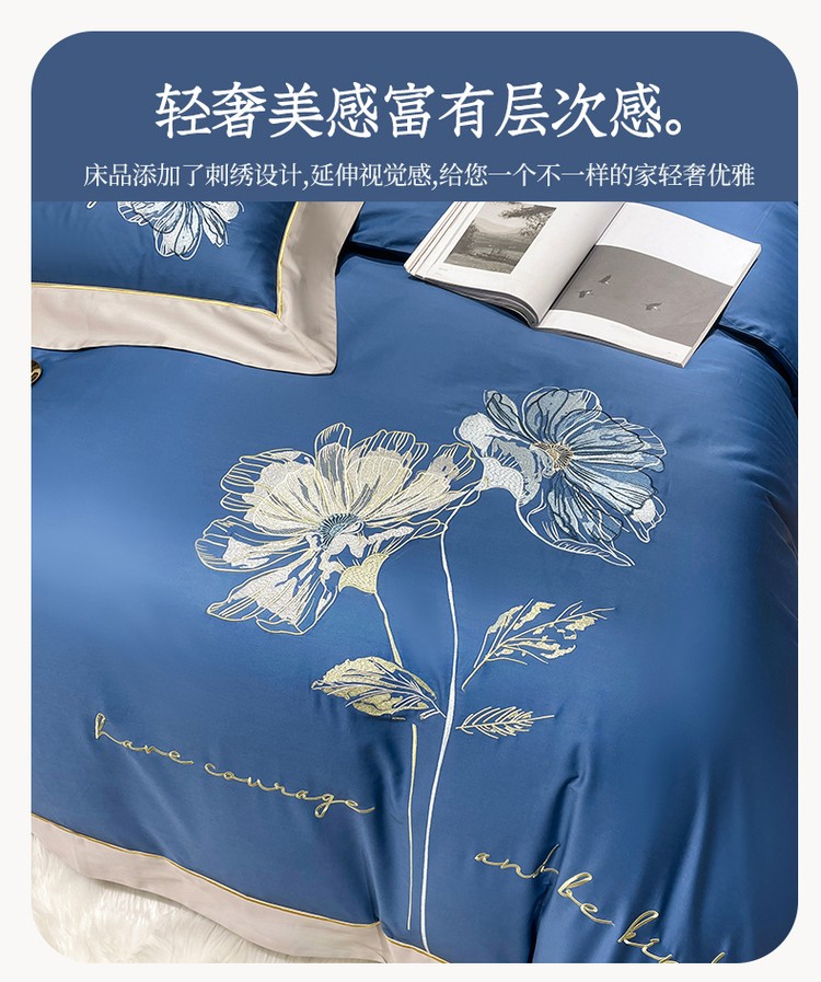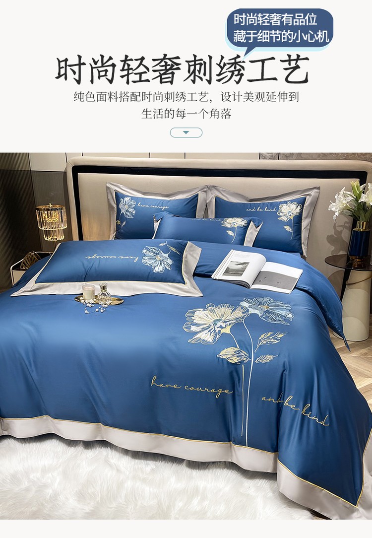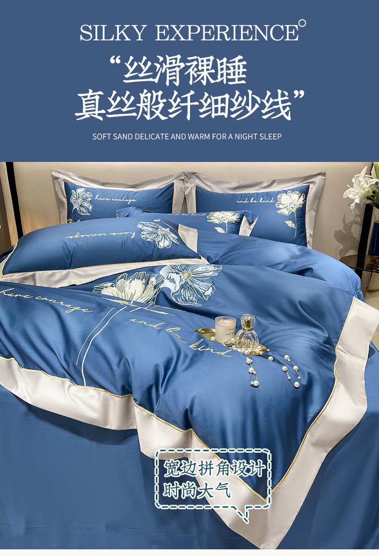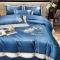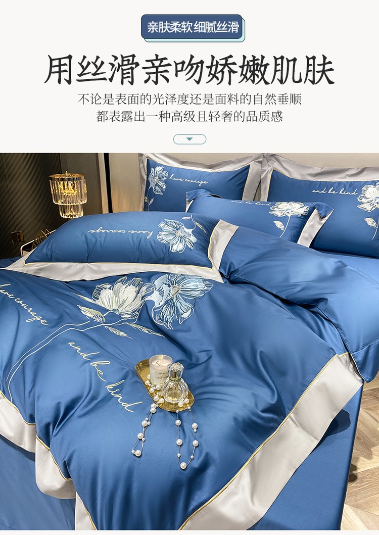 柔觉家纺 天丝刺绣贡缎提花全棉四件套,柔梦-海蓝