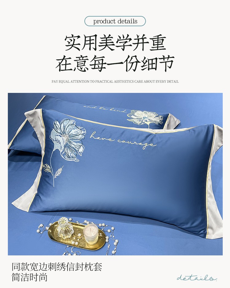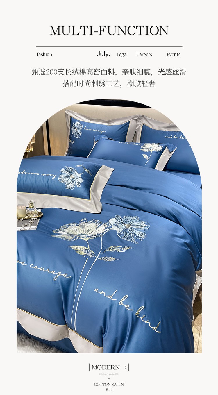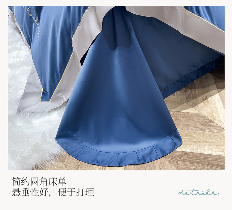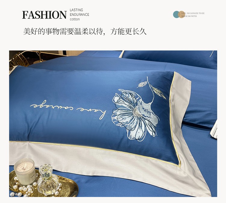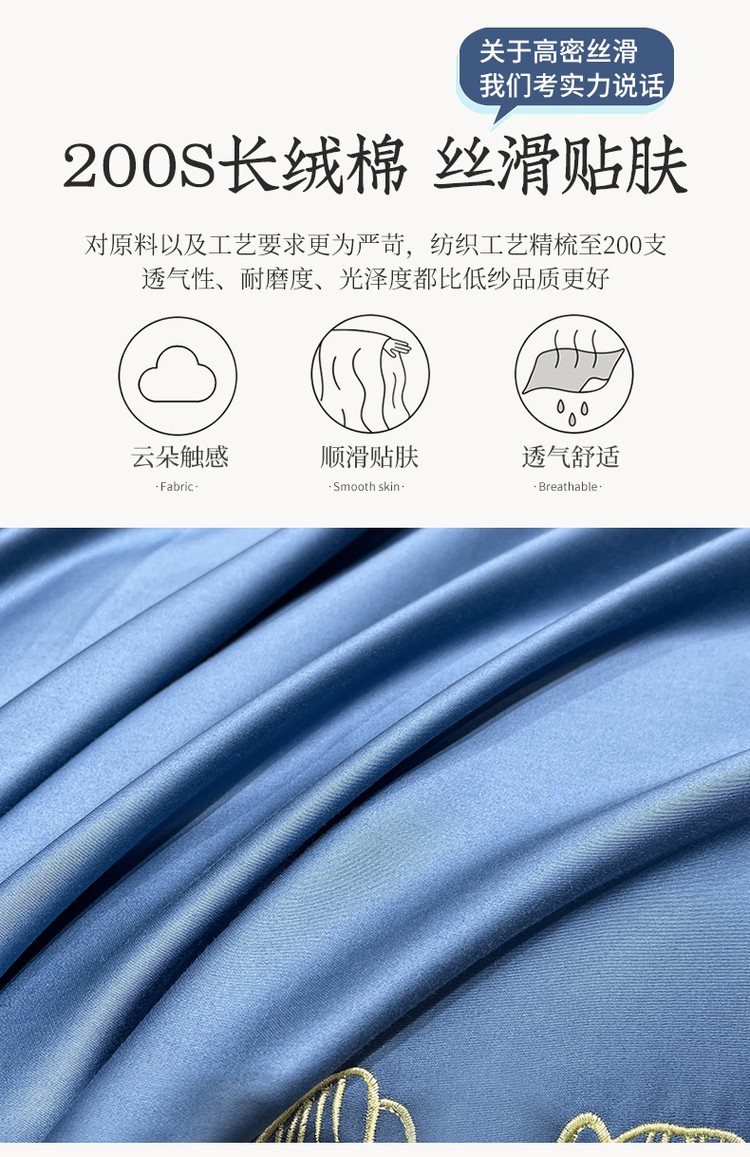 柔觉家纺 天丝刺绣贡缎提花全棉四件套,柔梦-海蓝