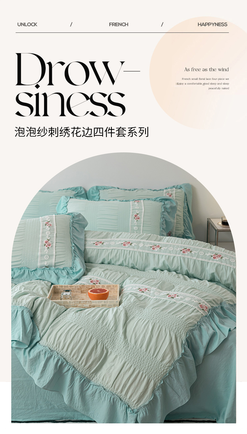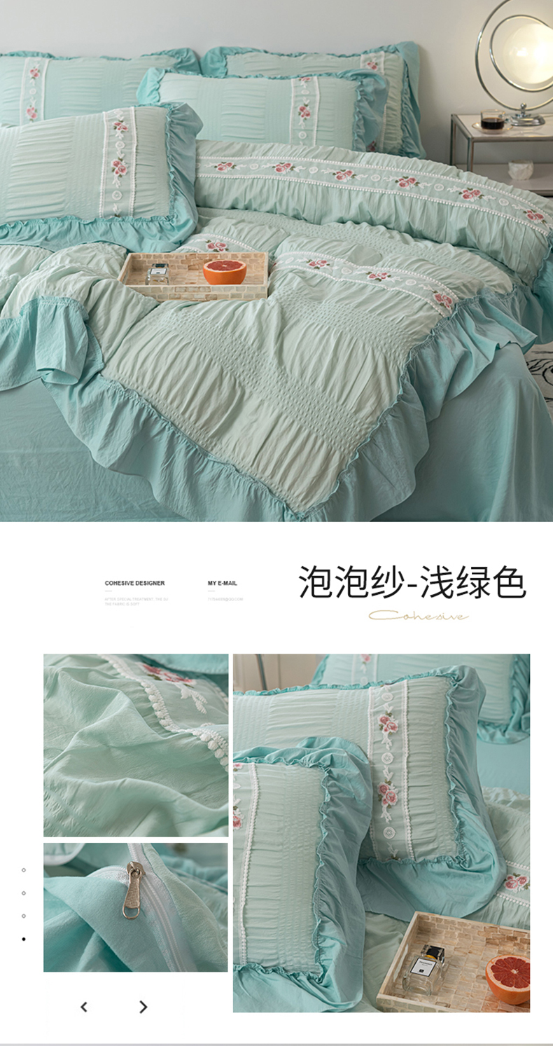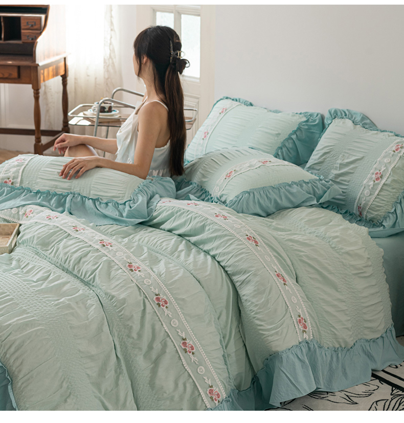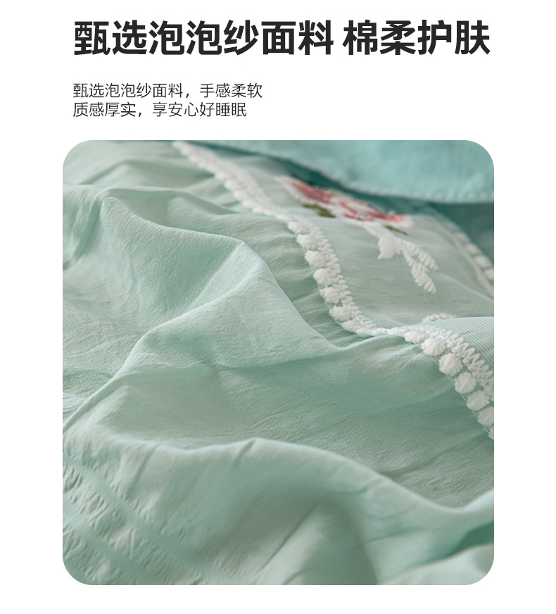 当前位置: 91家纺网 > 商品网购 > 床品套件 > 四件套 > 水洗棉四件套 > 你好美丽 2025新款泡泡纱刺绣花边四件套 泡泡纱-浅绿色