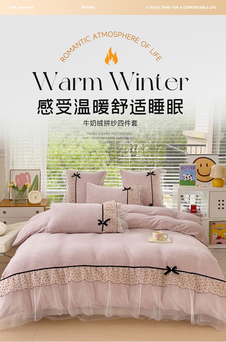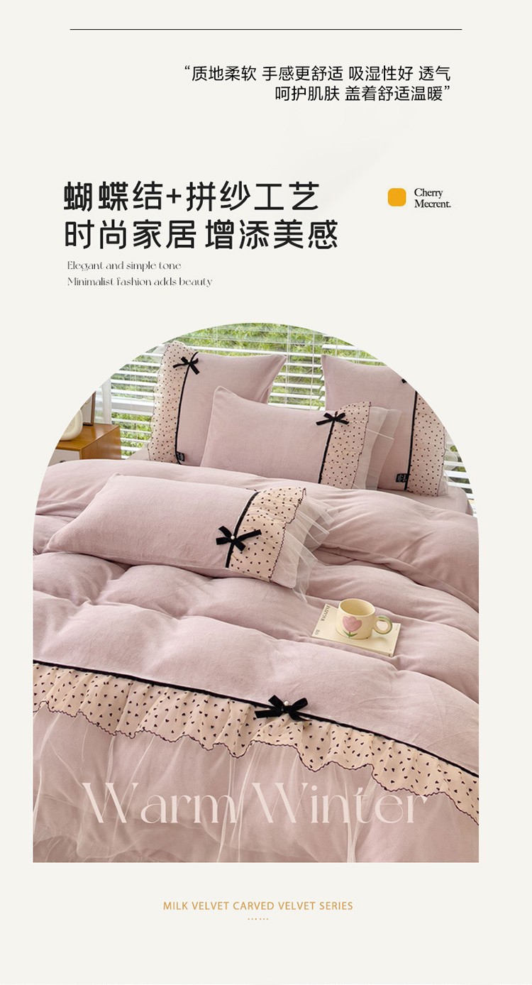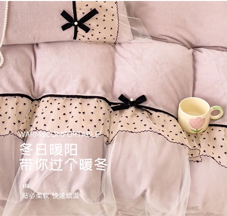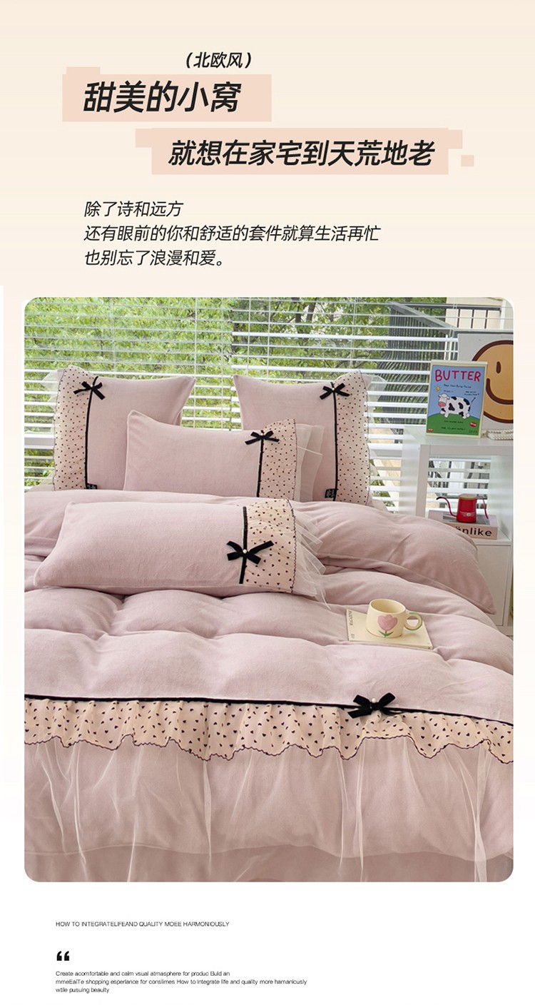 商品名称:2025新款牛奶绒拼纱四件套-洛可可 粉紫
